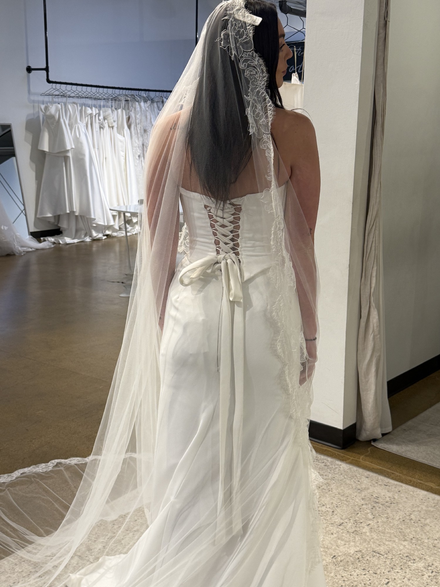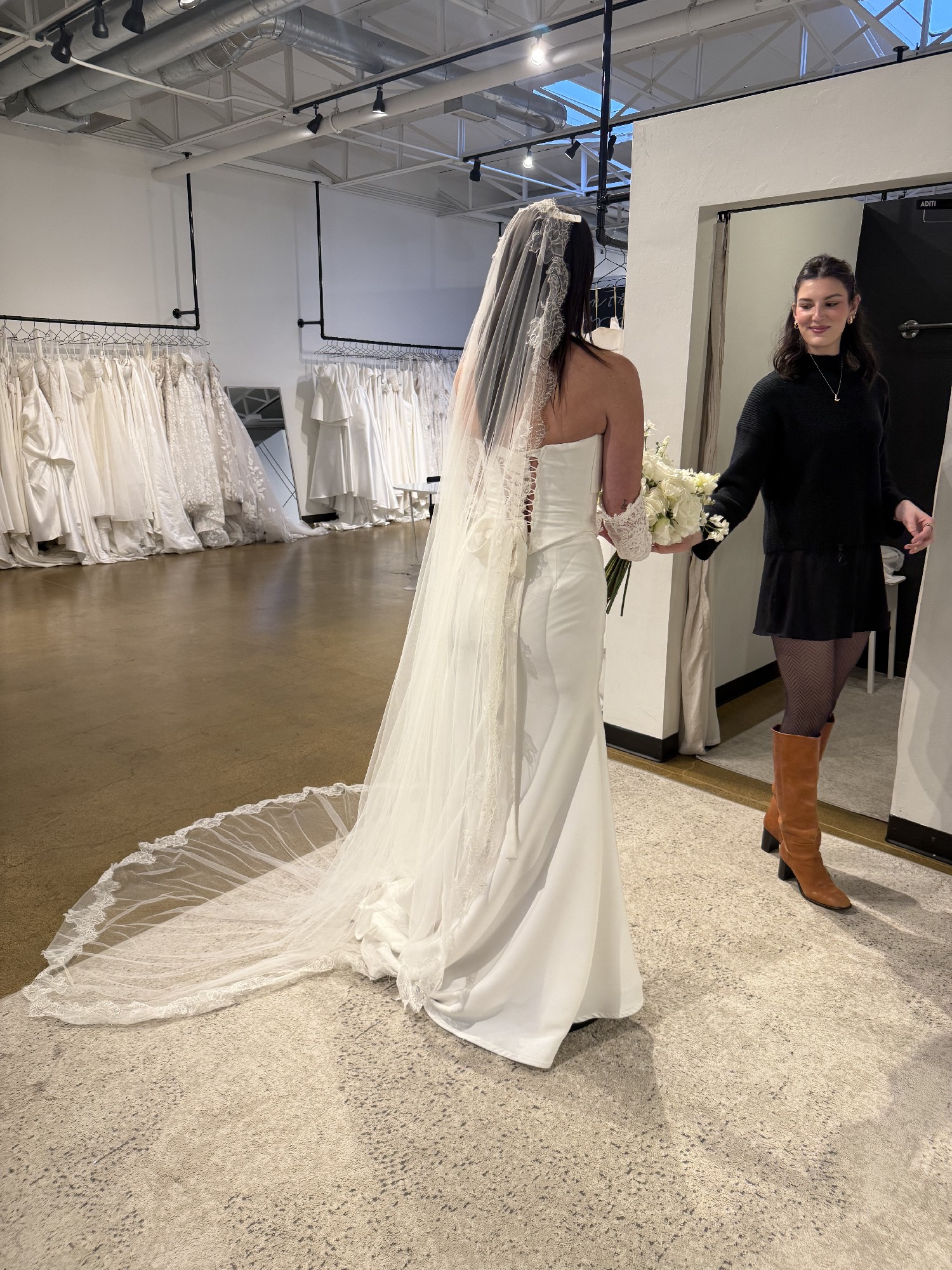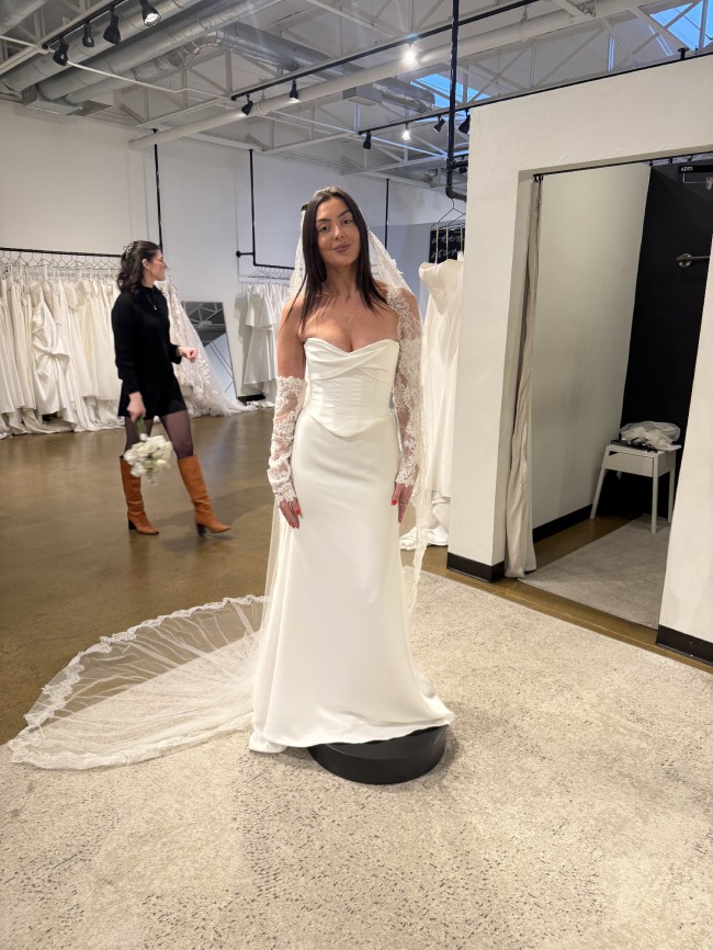 Because the gown is two separate pieces, you have the flexibility to swap the skirt for a different bottom for the reception, creating a second look without changing the entire dress. Paired with removable Alena Leena “Veronica” fitted lace sleeves, this look offers incredible versatility—romantic and timeless for the ceremony, then clean, modern, and customizable for the reception.