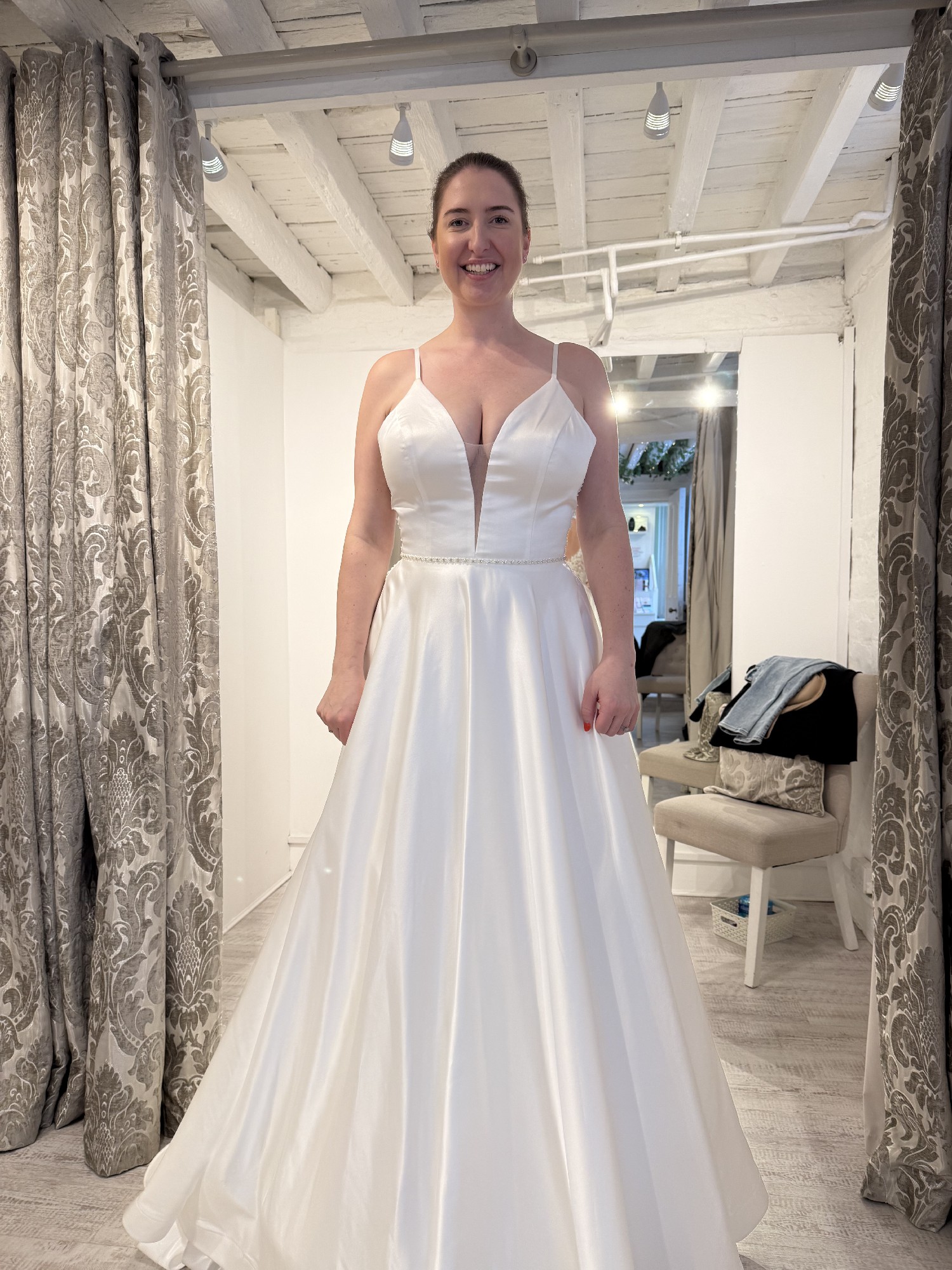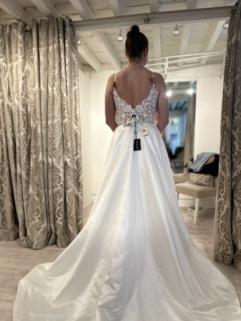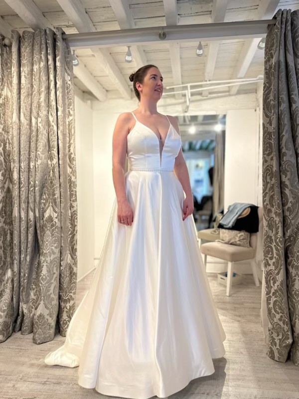 Beautiful Tamara plunge wedding dress in ivory size 18 with a separate size 16 crystal belt. Brand new in dress bag and unaltered.