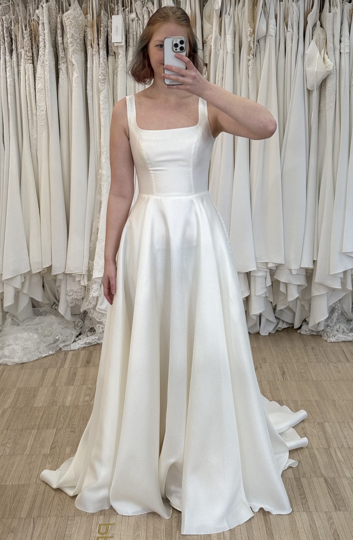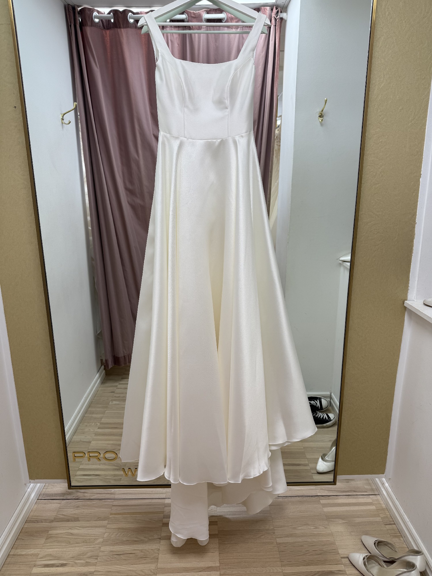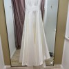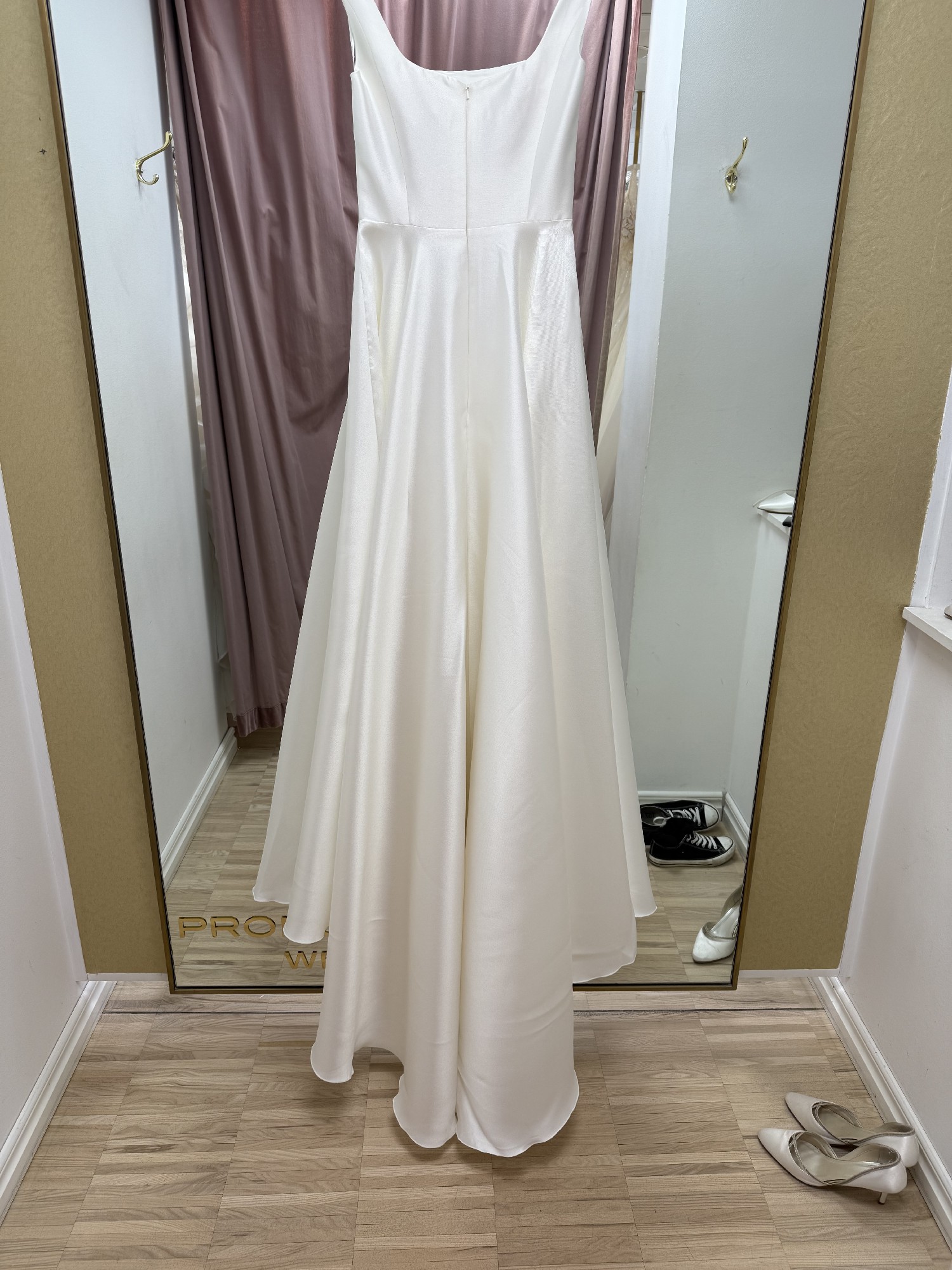 Kjolen faller vackert ner mot golvet i mjuka veck och avslutas med ett litet släp som ger dramatik och rörelse när du går, utan att vara för tungt eller opraktiskt. Det gör klänningen idealisk för både kyrkliga vigslar och bröllop utomhus.