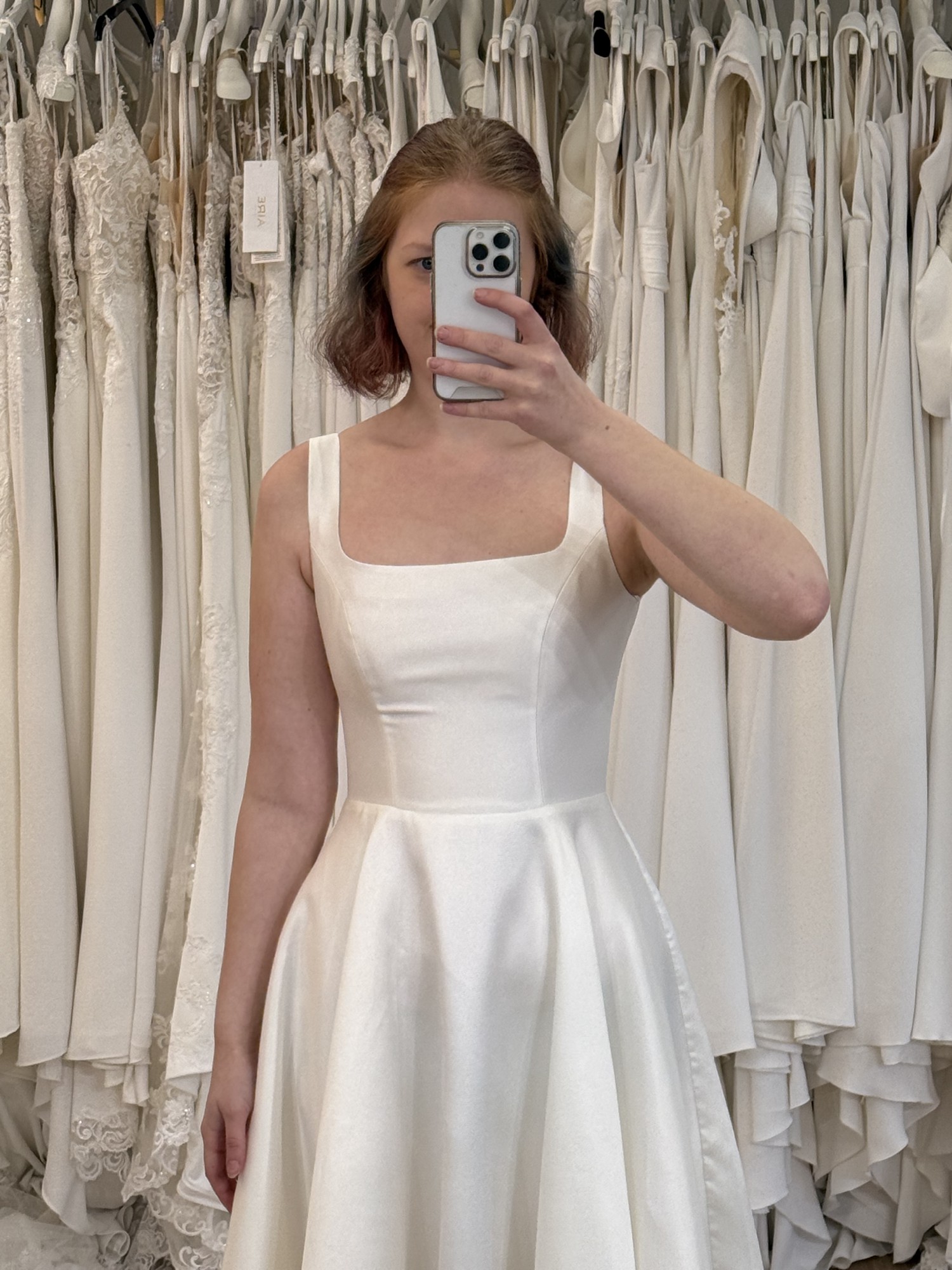 Klänningen är tillverkad i ett exklusivt mikadotyg – ett material känt för sin lyxiga lyster, stadga och följsamma struktur. Mikado ger klänningen en vacker volym och ett distinkt fall utan att kännas tung eller stel. Den breda A-linjeskärningen smickrar alla kroppstyper och ger en klassisk, feminin silhuett som aldrig går ur tiden.
