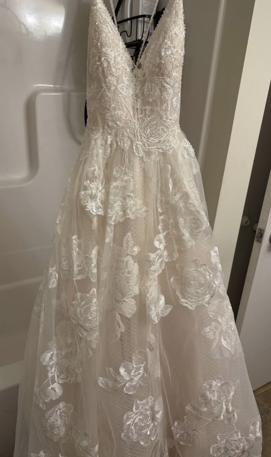 Oleg Cassini Size 10 Deep V-Neck Wedding Dress. Gorgeous sparkly sequins and flower designs throughout.