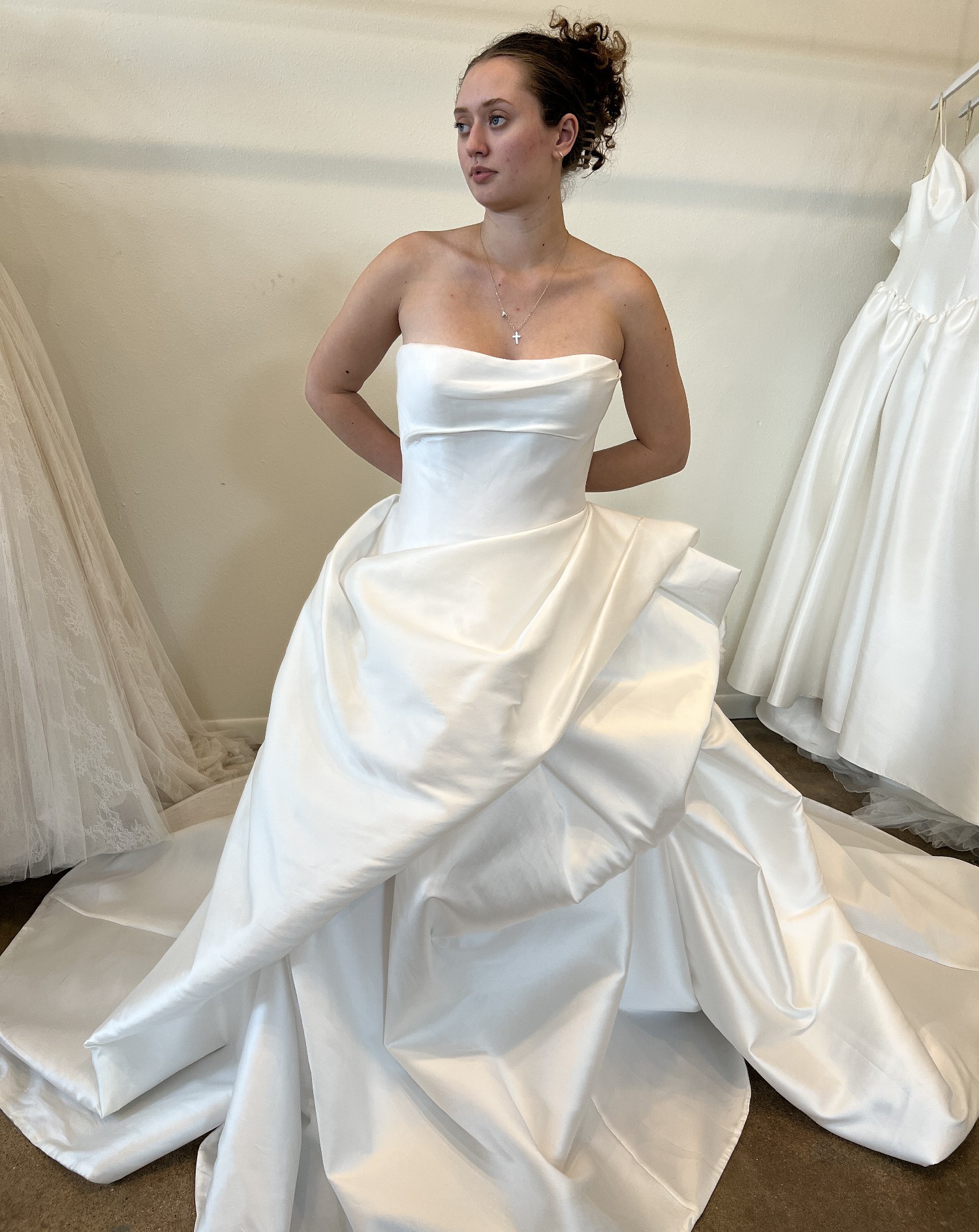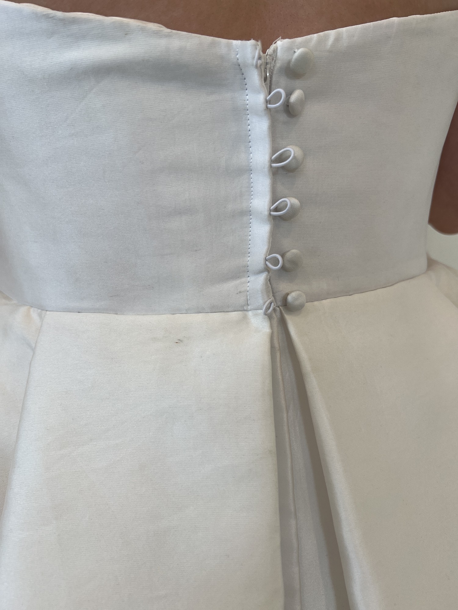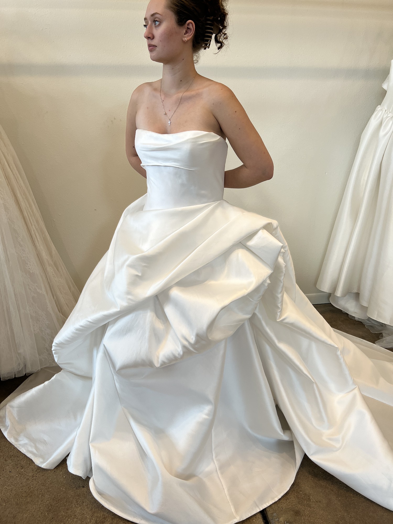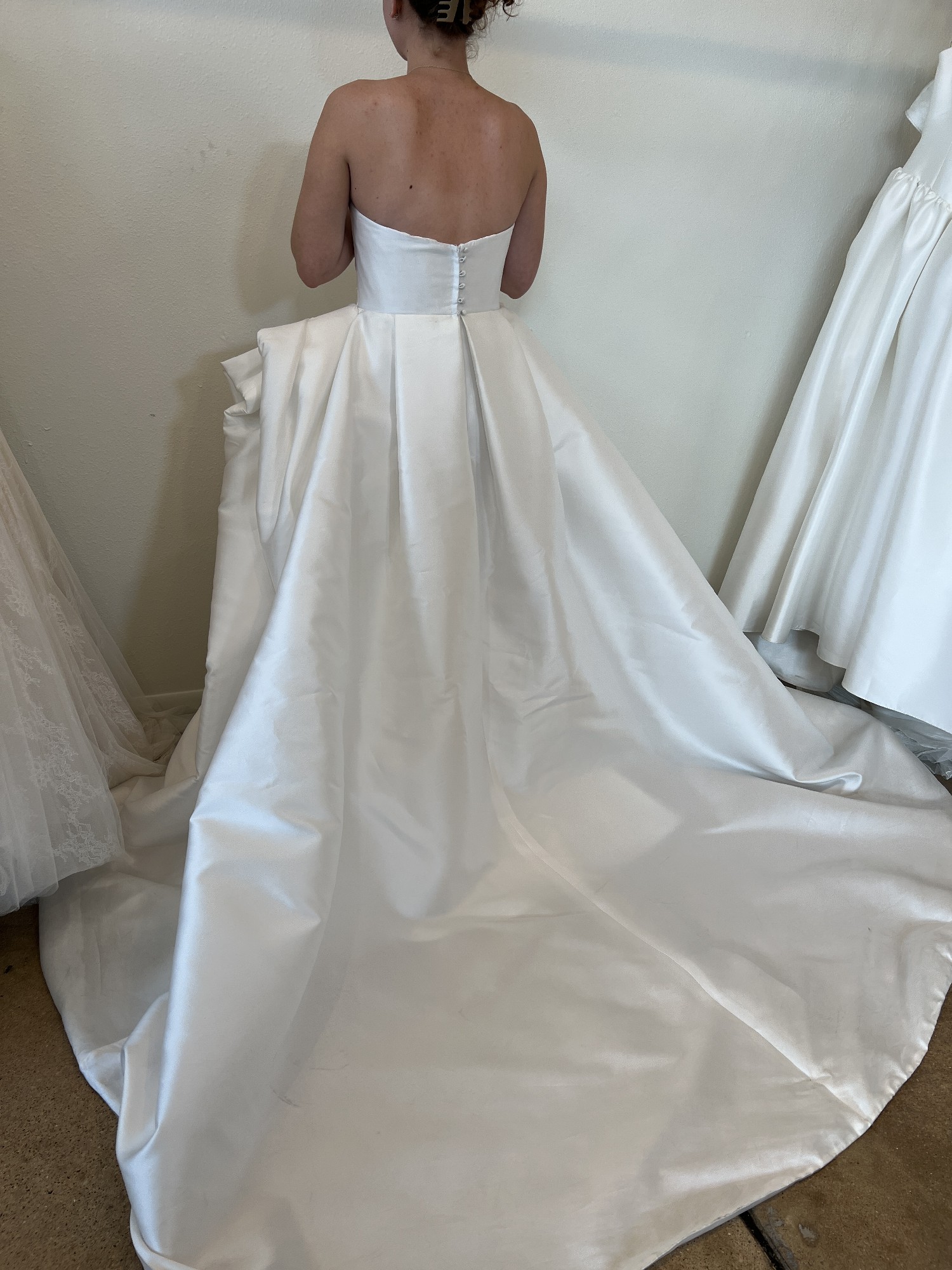 Item was a floor sample and does have some signs of wear. The dress has never been altered. Damage shown in pictures.