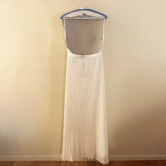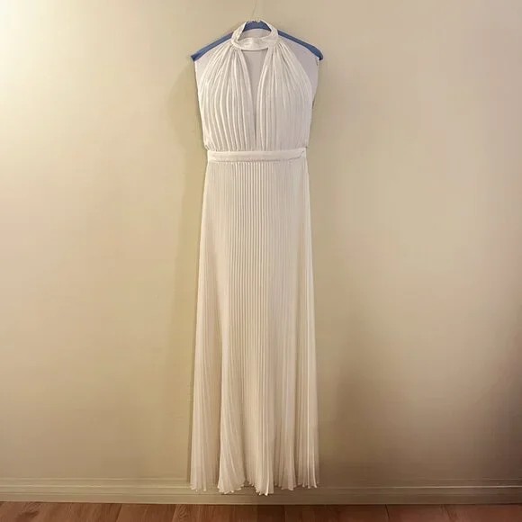 The Chateau Gown - Luxury and sophistication is reimagined in this umbrella pleat silhouette. An exquisite deep v cut out is further emphasised by the high neckline while the open back makes it's own statement. The garment is crafted from our signature luminous pleats for a captivating finish.