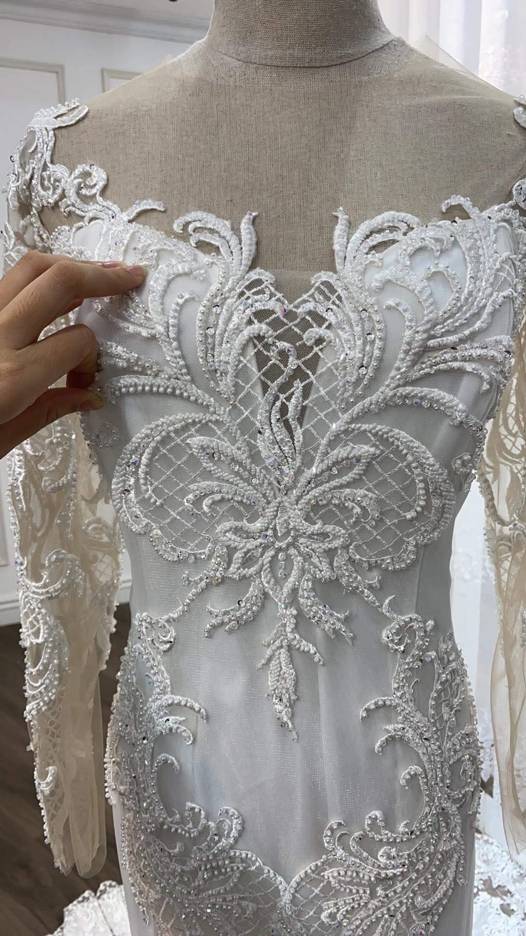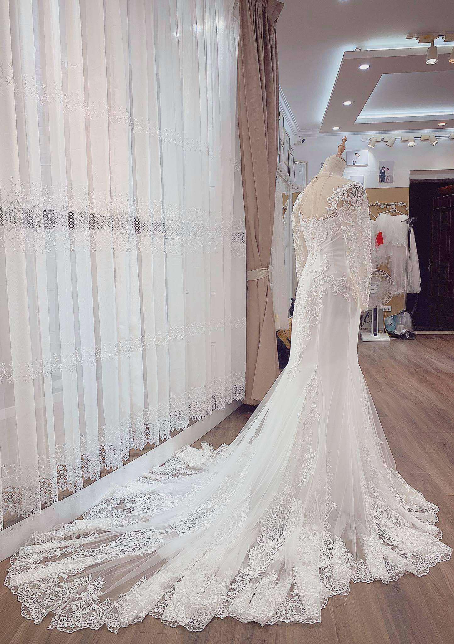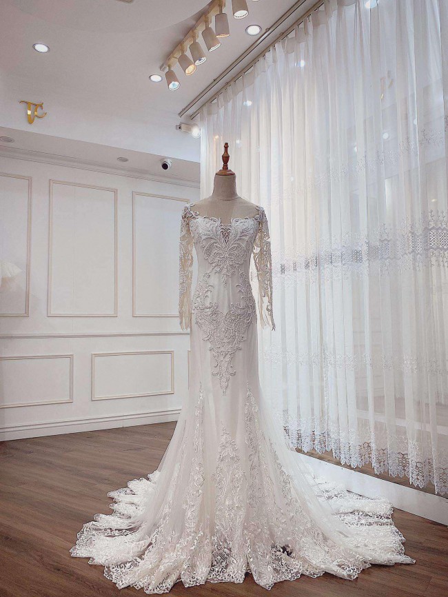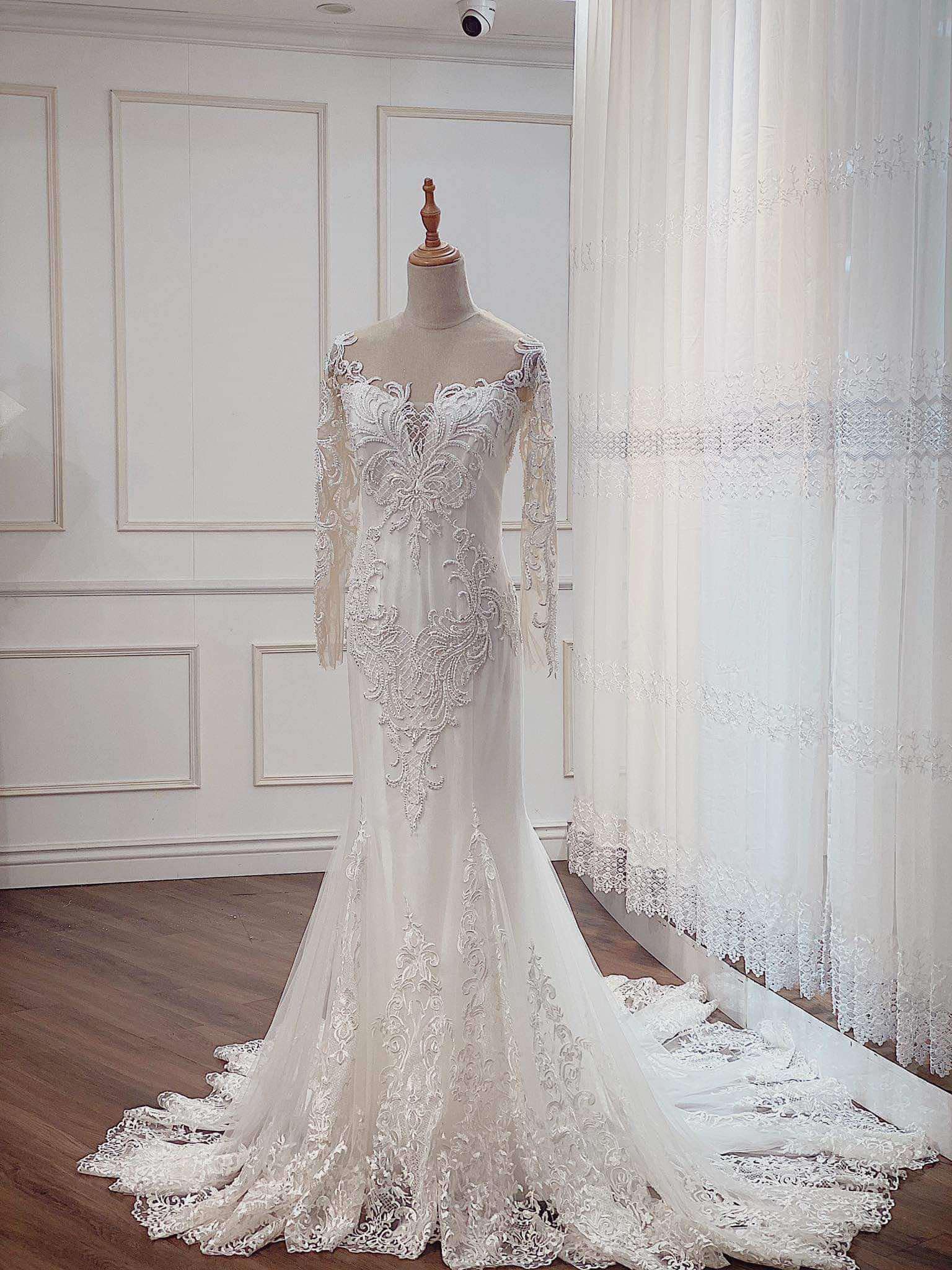 A beautiful custom made gown, one of its kind and uniquely crafted in Vietnam. Quality hand made. It’s adjustable corset back tie helps sculpt and fit any shape. The length for a dramatic and glamorous look. A hint of traditional style mixed with a contemporary yet modern feel. A mermaid dress to make you feel a million dollars on your wedding day. To feel like you are the perfect one 🫶