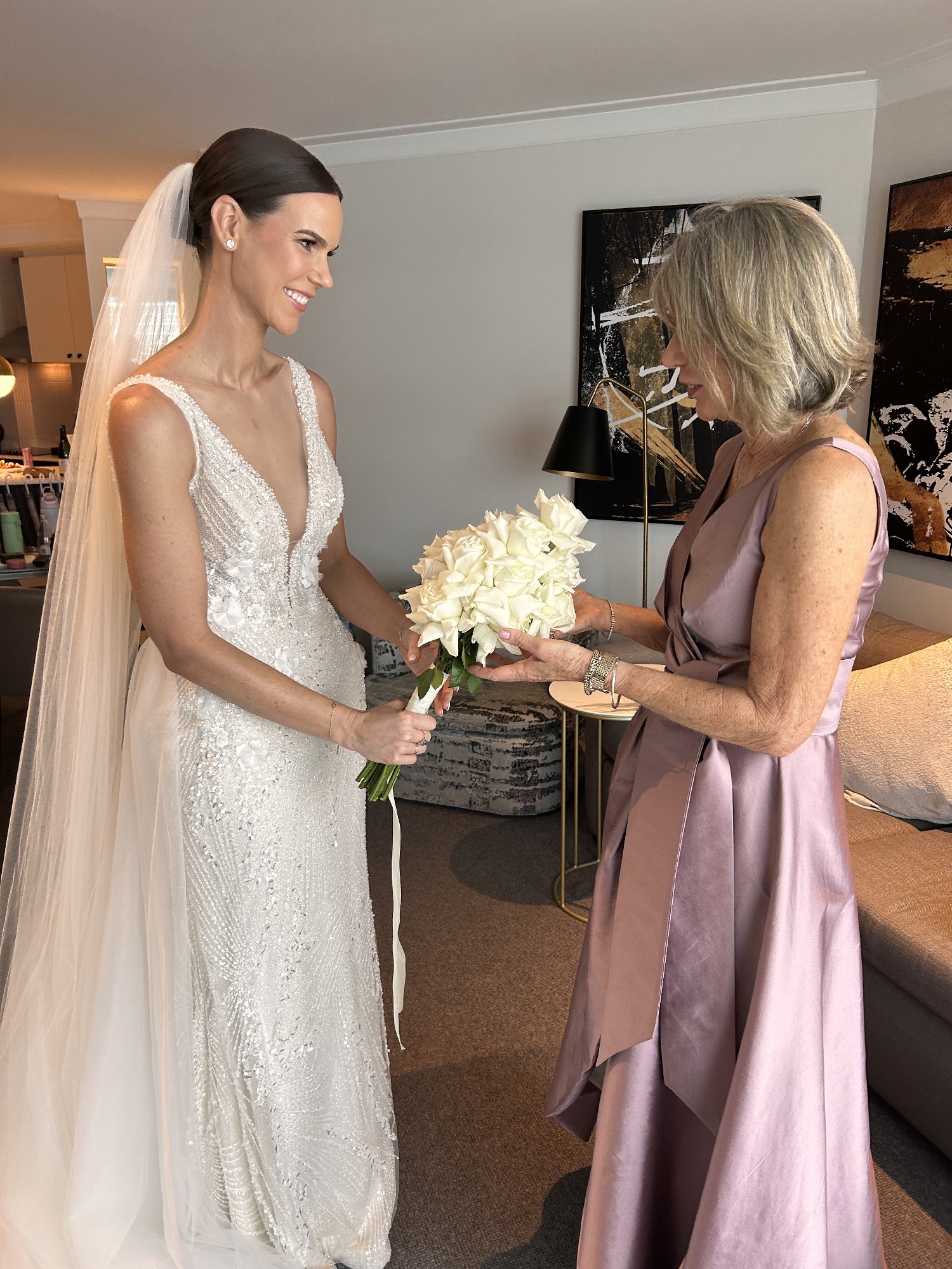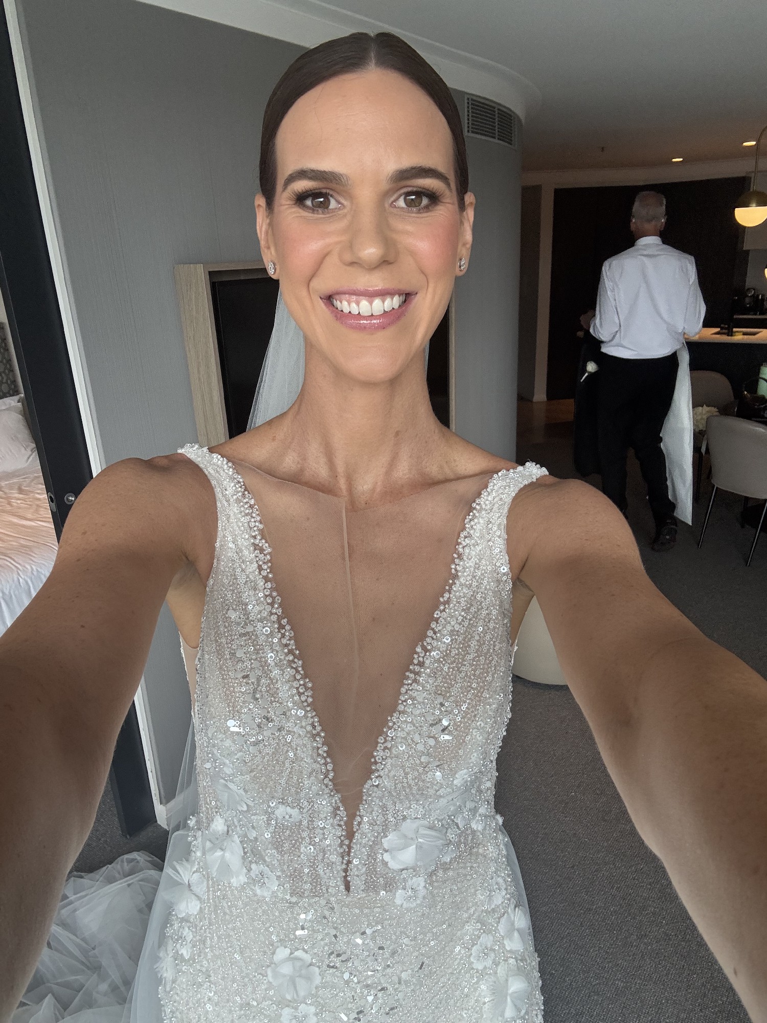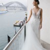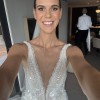 This stunning wedding dress is delicately embellished with intricate beading that catches the light beautifully, creating an elegant and refined look from every angle. The flattering deep V-neckline adds a modern, feminine touch while highlighting the décolletage in a timeless way.