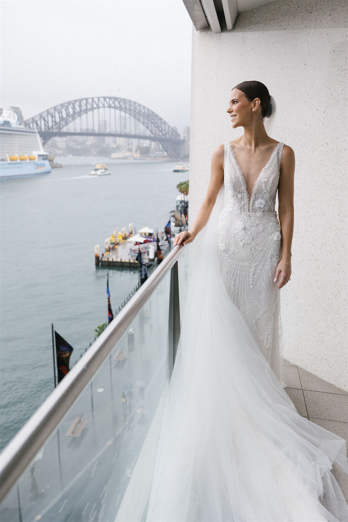 Crafted in shimmering with a mermaid silhouette, the gown hugs the body perfectly before flowing into a graceful train, creating a truly show-stopping bridal look. The detachable tulle overskirt with a long, flowing train allows for two distinct looks — romantic and dramatic for the ceremony, then effortlessly sleek and glamorous for the reception.
