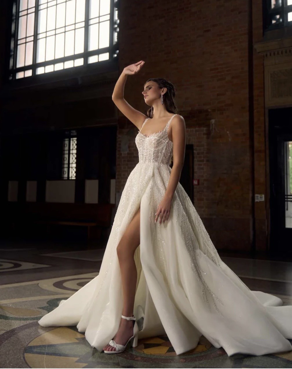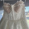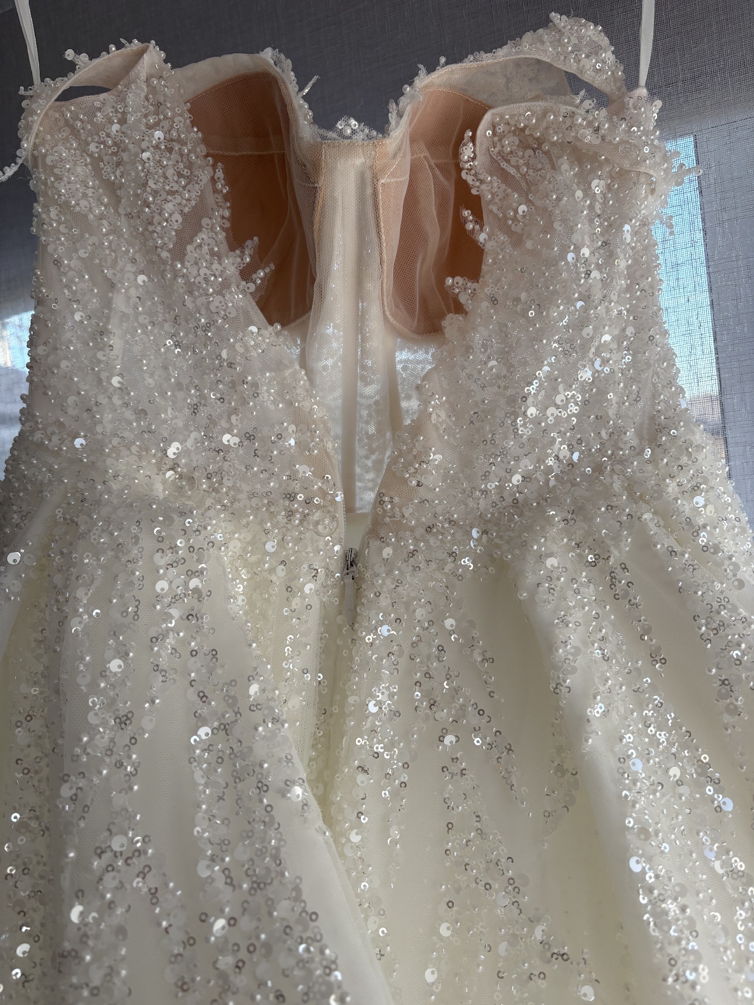 What sets this gown apart are the stunning crystals and sequins that catch the light beautifully, creating a dazzling effect that will leave your guests in awe. The strapless design highlights your shoulders and collarbone, adding a timeless charm that is effortlessly romantic.