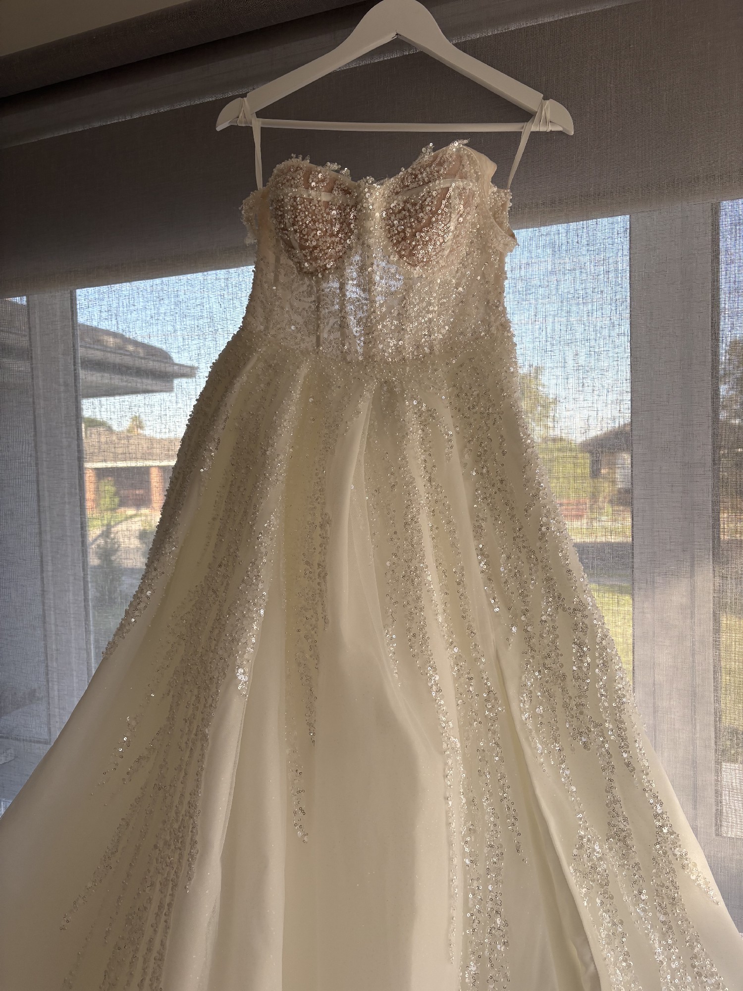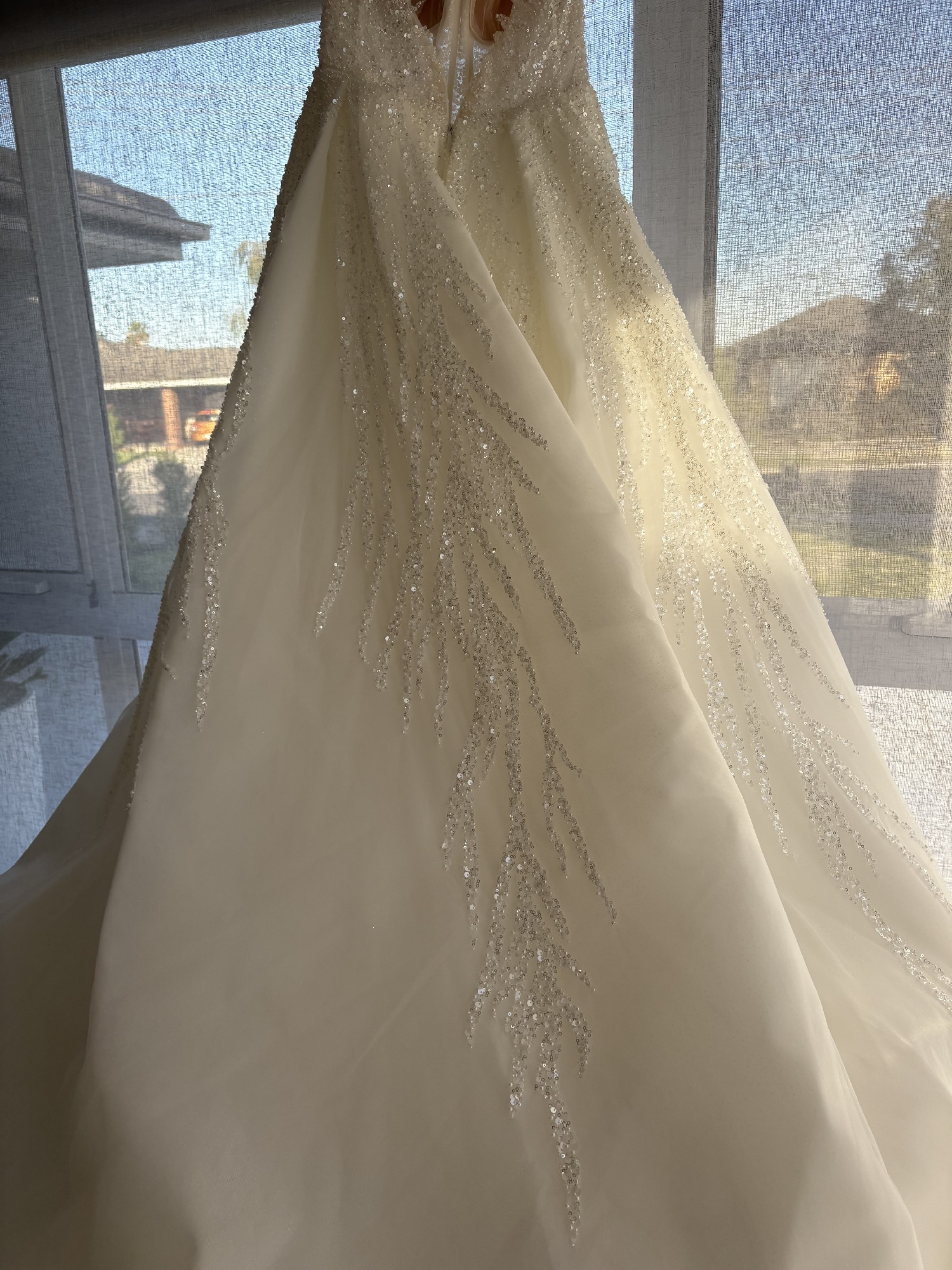As I reminisce about wearing this masterpiece, I remember how it made me feel like a true princess. The floor-length design flows gracefully with every movement, allowing you to dance the night away in style. This dress is not just mine; it's a piece that carries the magic of love and celebration. I’m excited for another bride to create her own beautiful memories in this stunning gown.