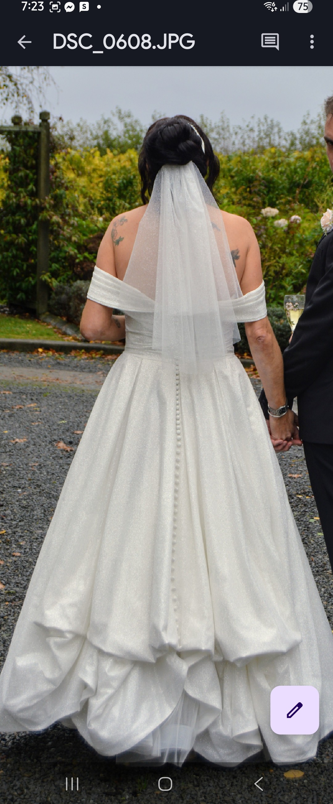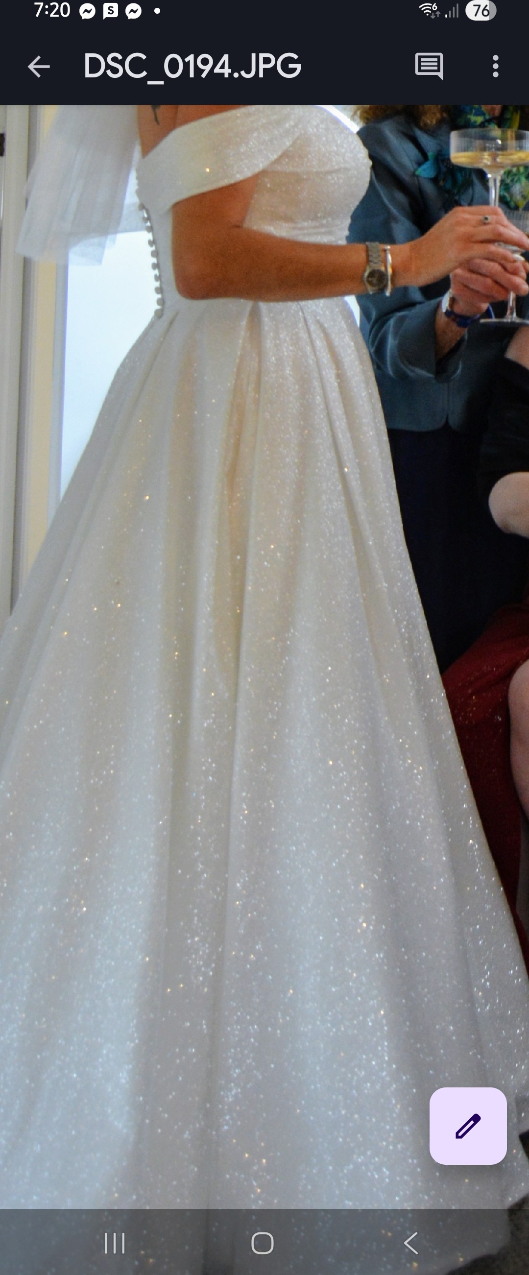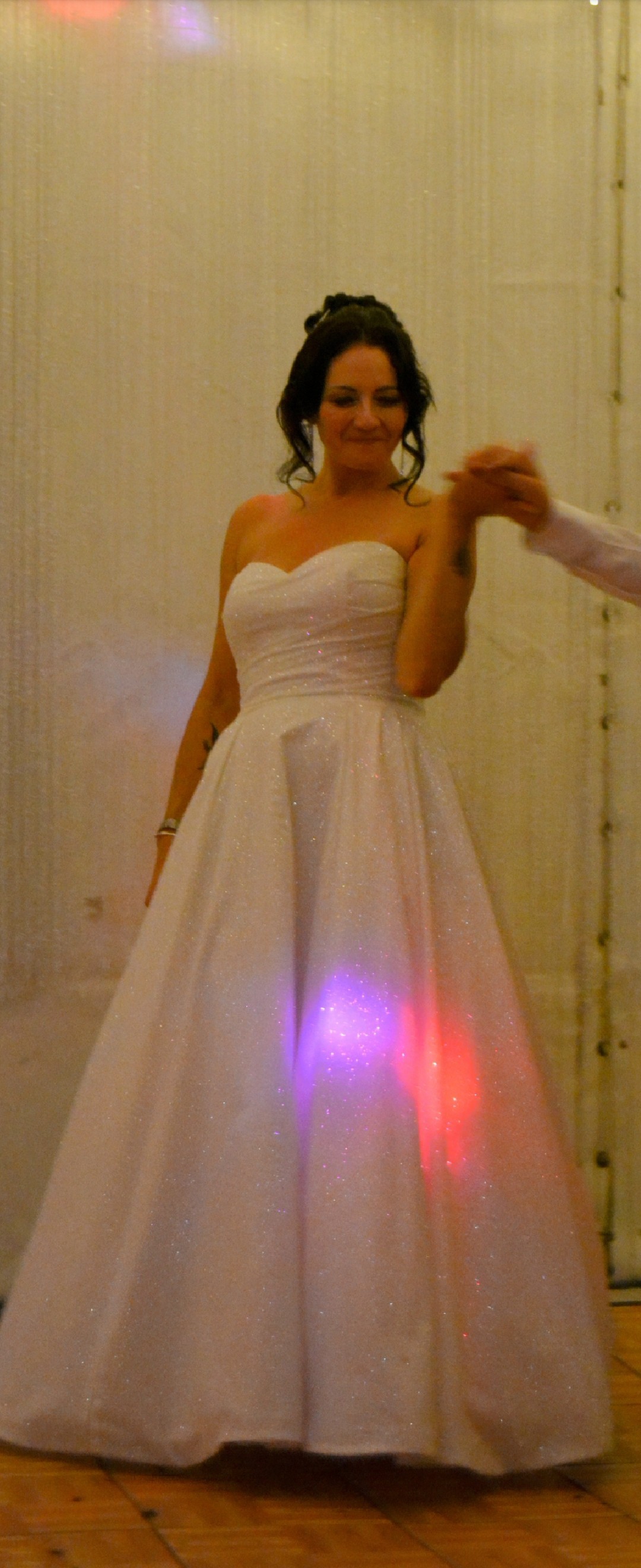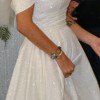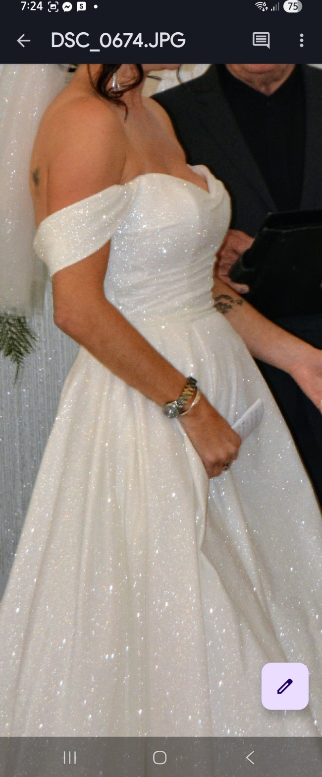 Full Cinderella vibes with this beautiful sparkly dress. The actual material is sparkling, not beaded or sequined. Totally stunning for the bride who loves being the center of attention. Worn once and fully dry cleaned to near new condition. A mid length train that can be bustled at the back as per the photo