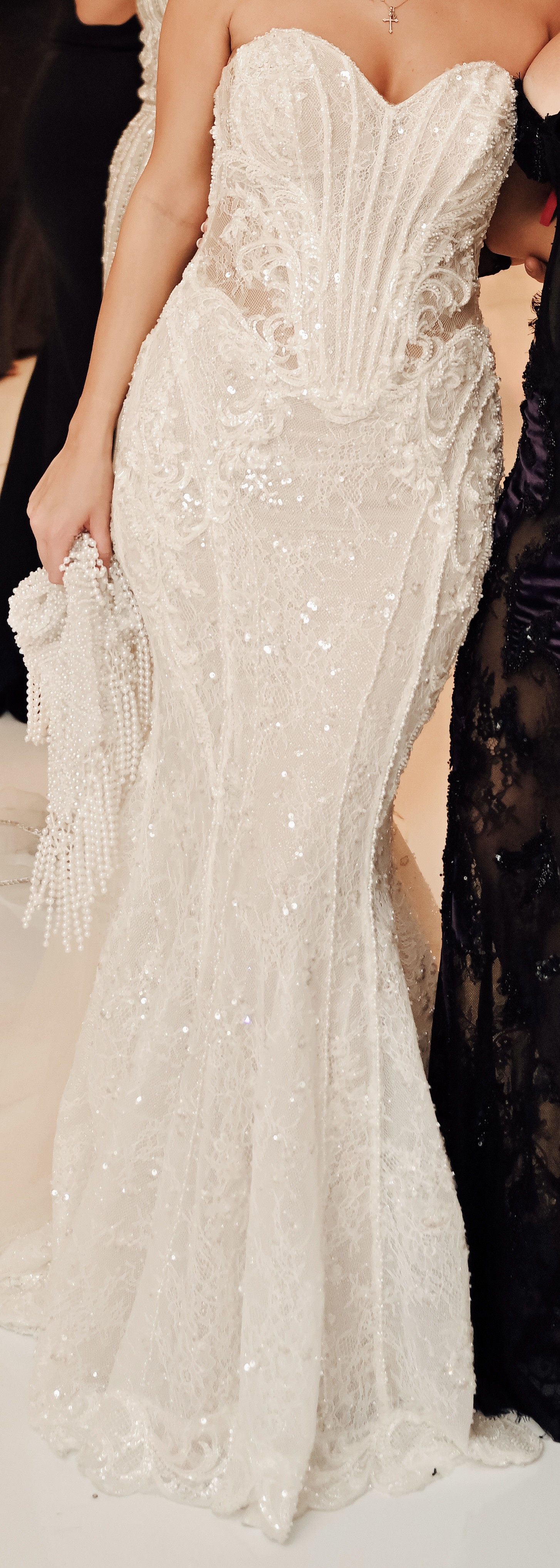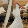 - Shortened, bust cups added, taken in at knee area, bustle for train