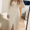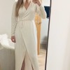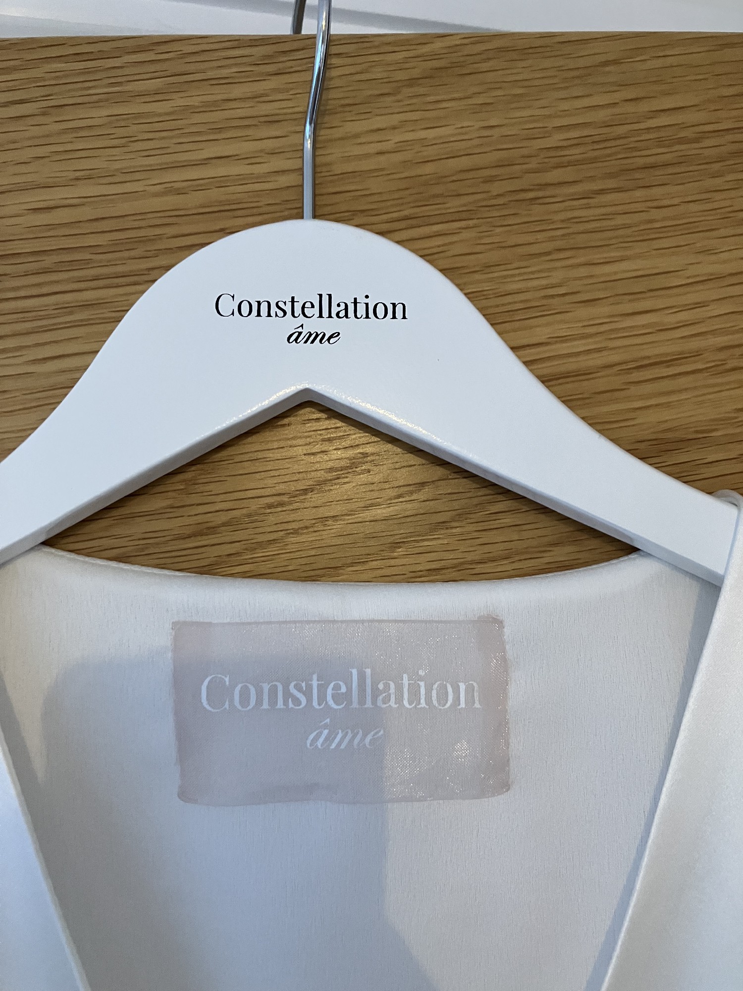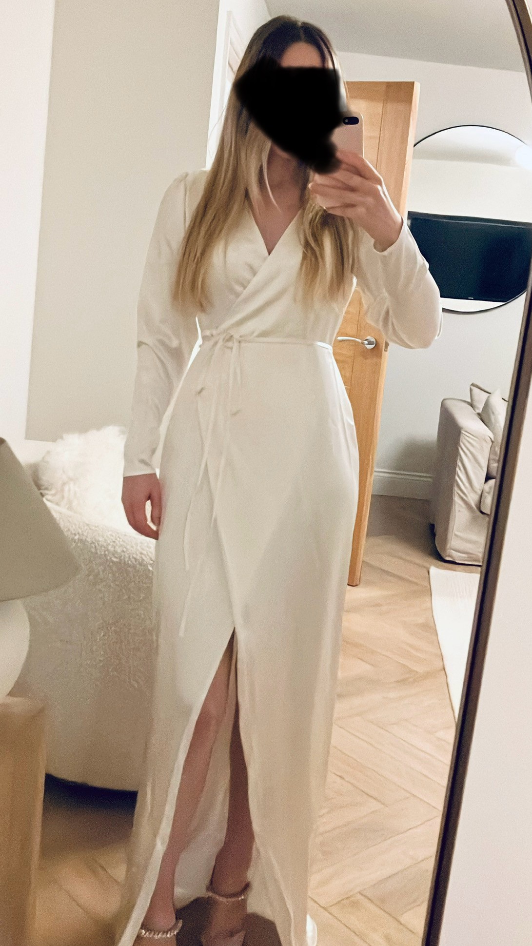 Gorgeous Constellation Ame dress- in perfect condition as never worn and kept hanging in its bag to protect it (not stored in loft etc). I am 5ft 4 and you can see it tried on with 4.5 inch heels. There is material to have the dress longer and so trailing behind more if you wish or just if you are taller there is extra length that can be let down at the back. I am a uk 8 but have 32DD bust- due to the wrapover style it could accommodate different bust sizes.