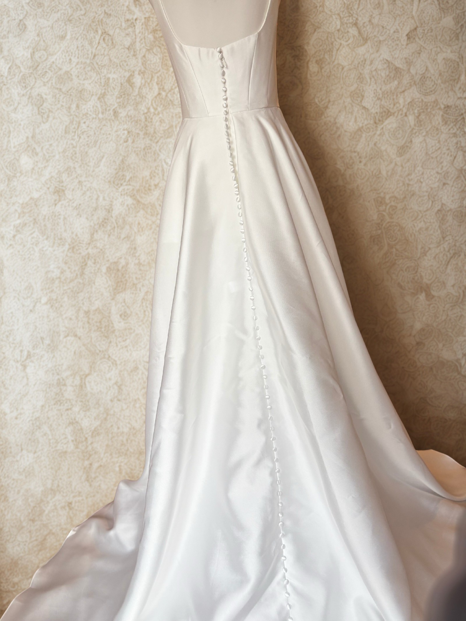 Becca ist ein zeitloses A‑Linien‑Brautkleid aus edel schimmerndem Satin in Größe 40 für nur 1.199Euro im Outlet. Das klare Oberteil mit feinen Trägern und sanft geformtem Ausschnitt schmeichelt dezent dem Dekolleté. Der fließende Rock mit leichter Schleppe sorgt für elegante Bewegung, während die durchgehende Stoffknopfleiste im Rücken dem Kleid einen besonders hochwertigen Couture‑Look verleiht.