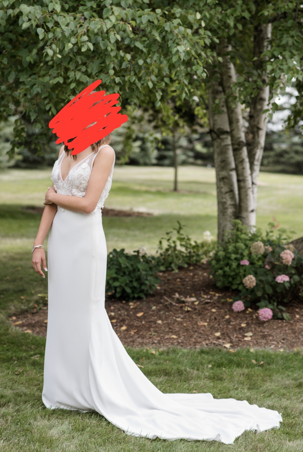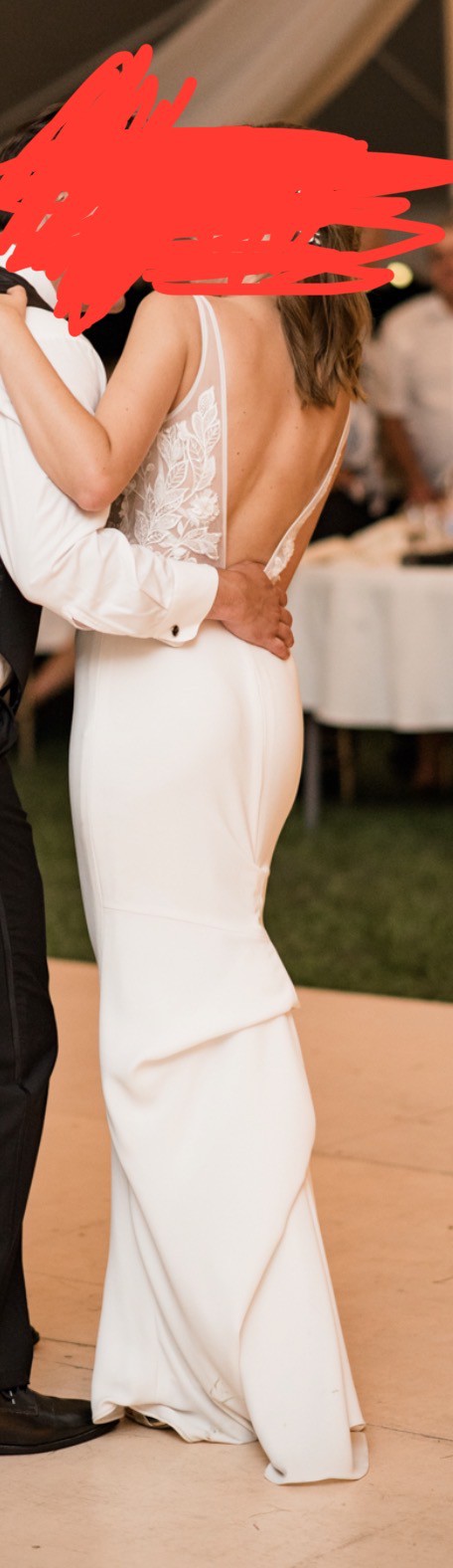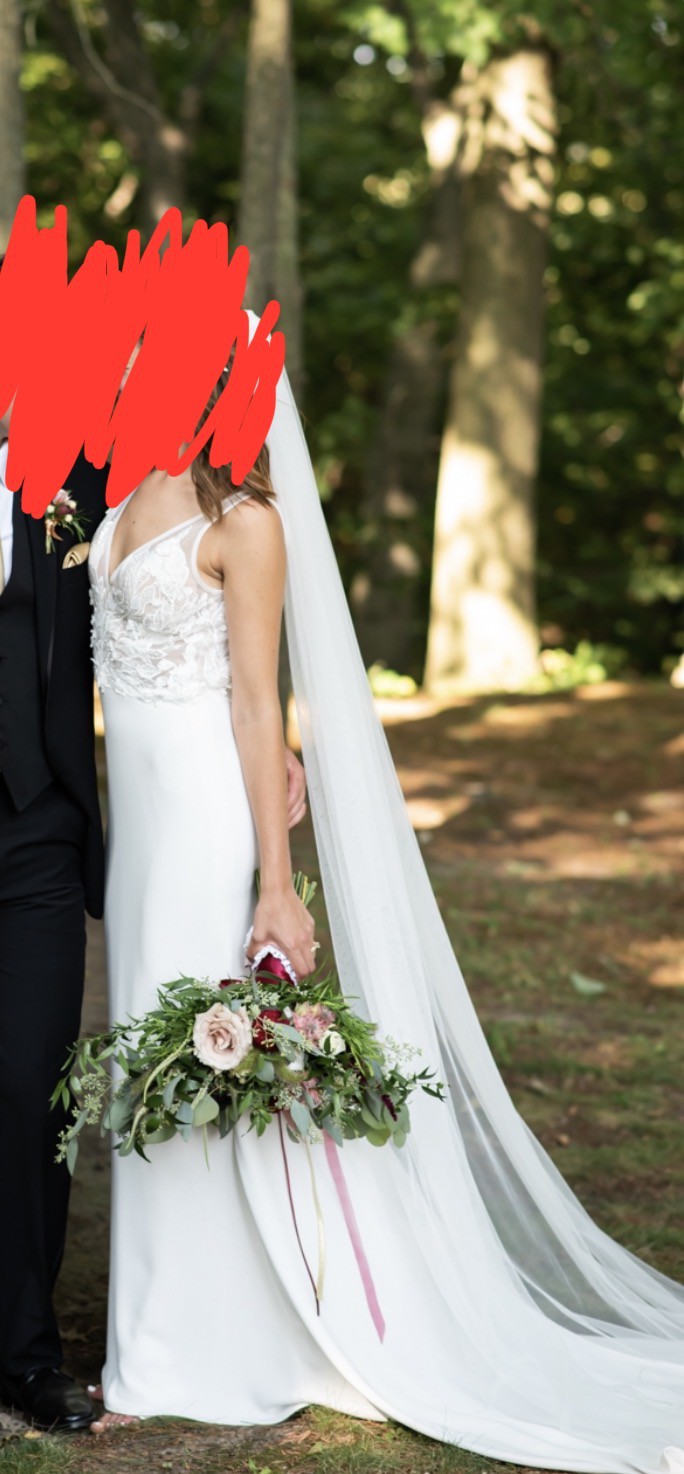 This Carlie dress by Made With Love was the centerpiece of my wedding day, and I want it to bring as much joy to another bride as it did for me. The trumpet silhouette hugs the body beautifully, highlighting curves in all the right places and creating a silhouette that feels both classic and modern. The V-neckline adds a touch of elegance, while the backless design brings an element of allure that truly makes this dress stand out.