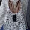Never worn. The fabric has a bit of stretch and fits tall women nicely, but it can also be altered to be longer if needed.