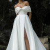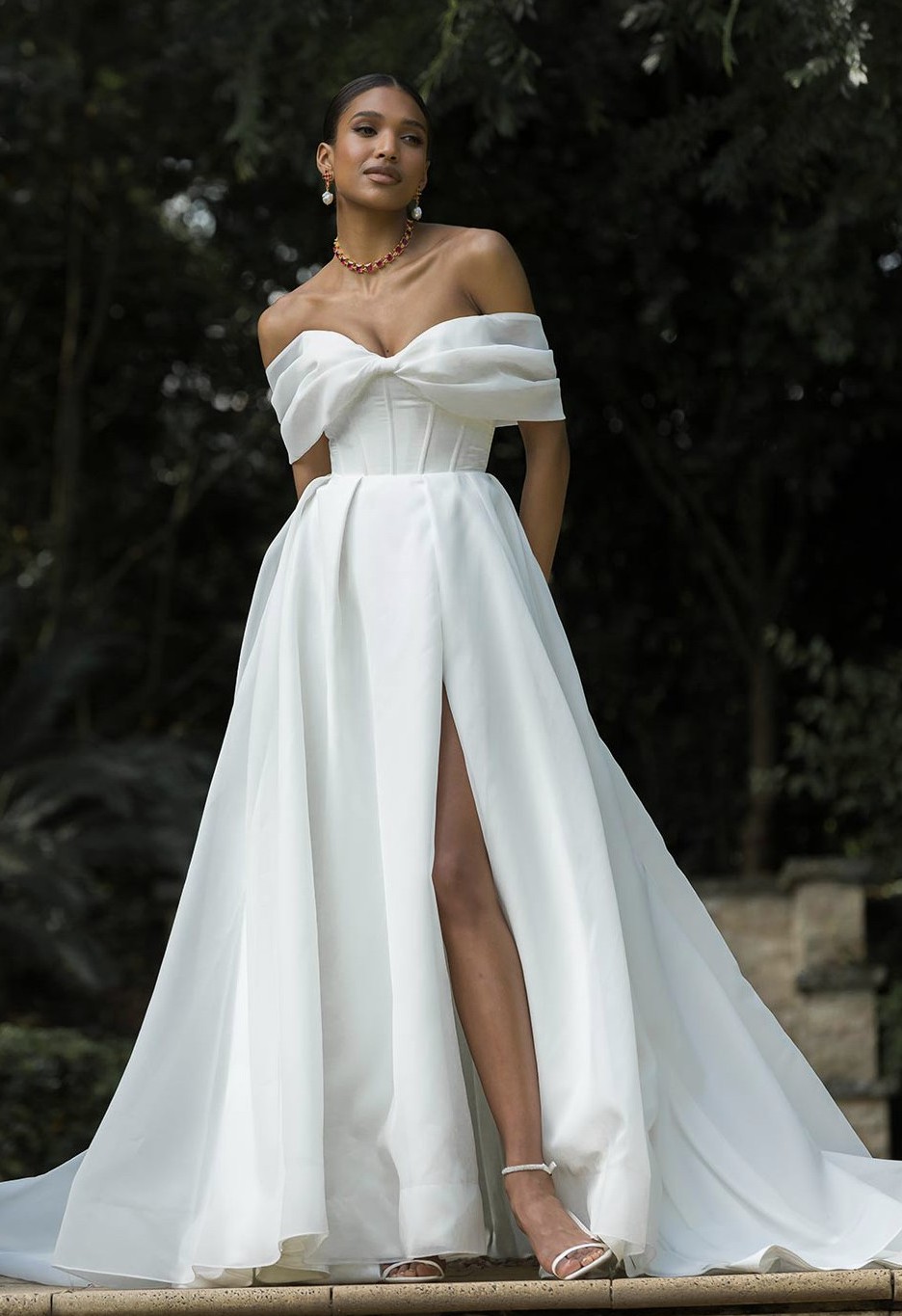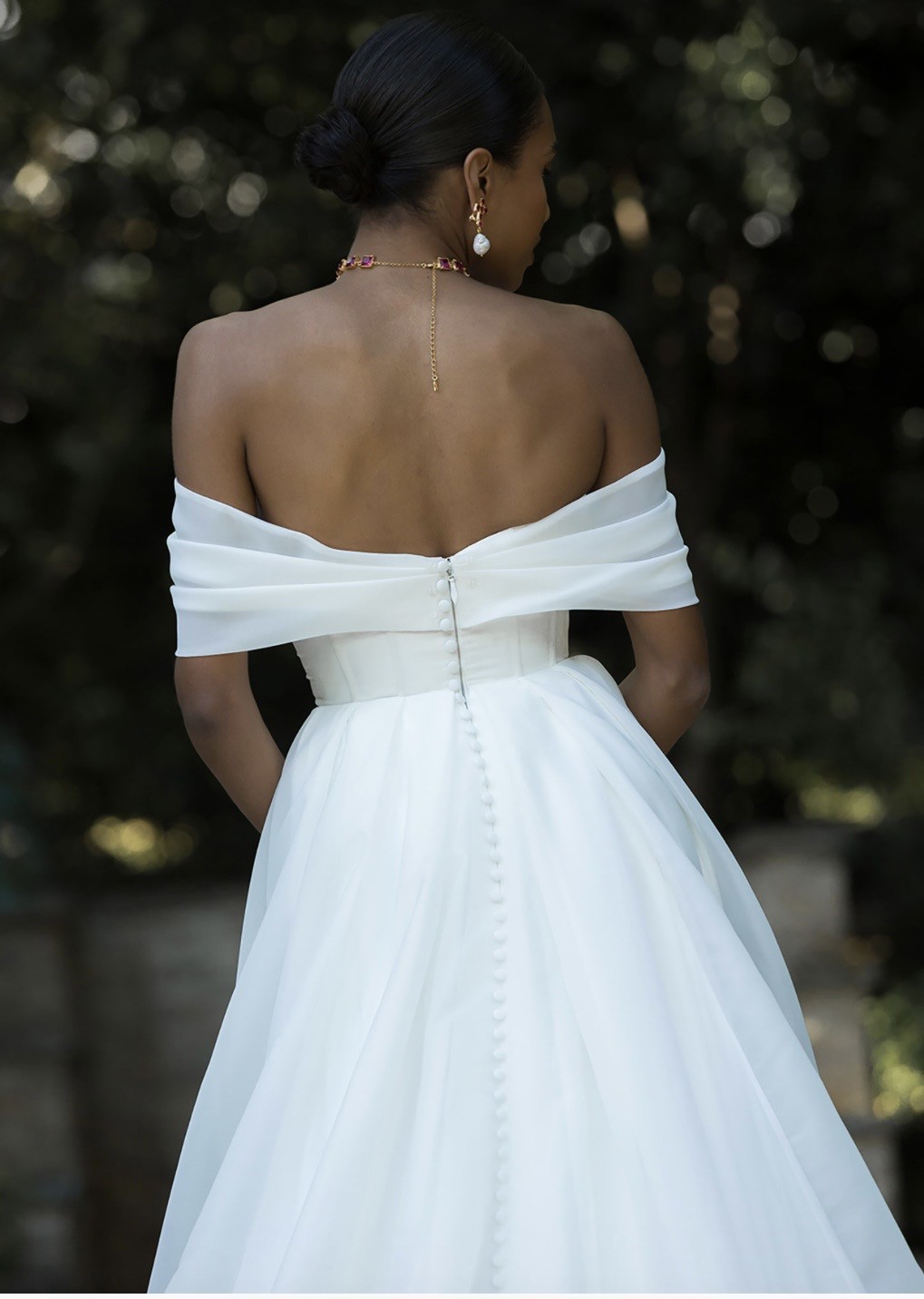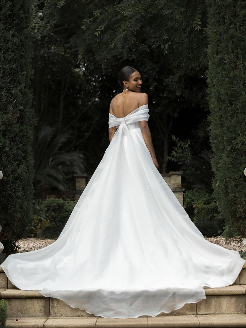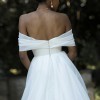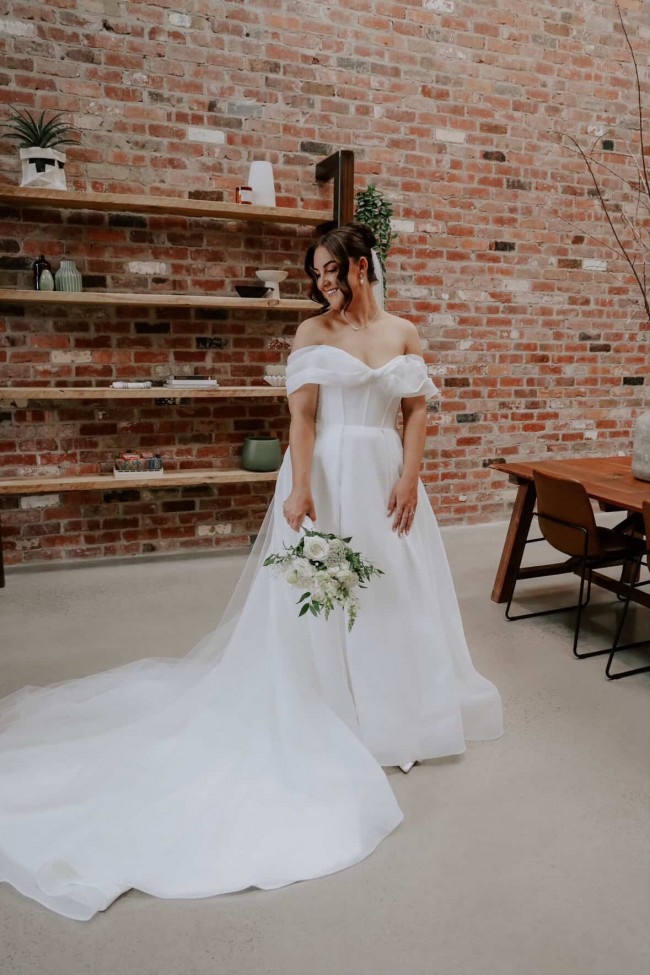 Embody classic elegance with Prestyn and transport yourself to beneath the Duomo with her architectural magnificence. Get lost in her luxurious organza fabric, crafted into a feminine A-line silhouette with pleated off-the-shoulder straps and a detachable train. Modern femininity is held at the forefront of her wedding dress design in her unique bow inspired bust and back detailing. Her modern bodice is completed with exposed boning and centre back buttons to the hem. Her full circle skirt with no leg spilt and a cathedral-length train.