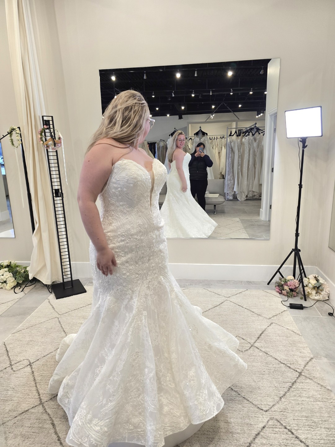 The sweet heart neckline elegantly frames the décolletage, while the mid-back design adds a touch of allure. Crafted in a stunning ivory lace, this dress features intricate embroidery that dances across the fabric, adorned with 3D flowers, delicate beading, and sparkling crystals. The added complexity of sequins ensures that you’ll shimmer under the lights, creating a breathtaking effect with every movement.