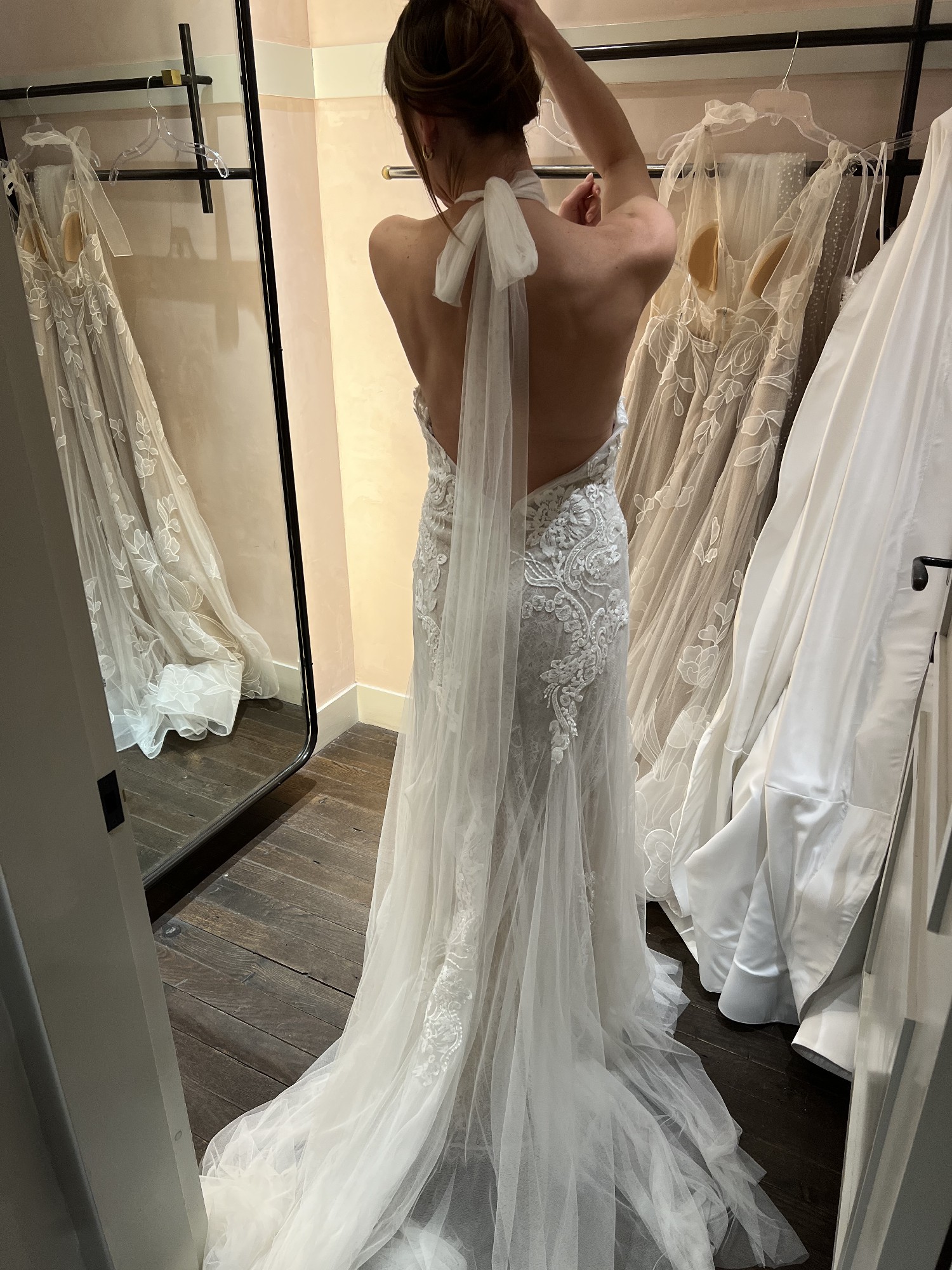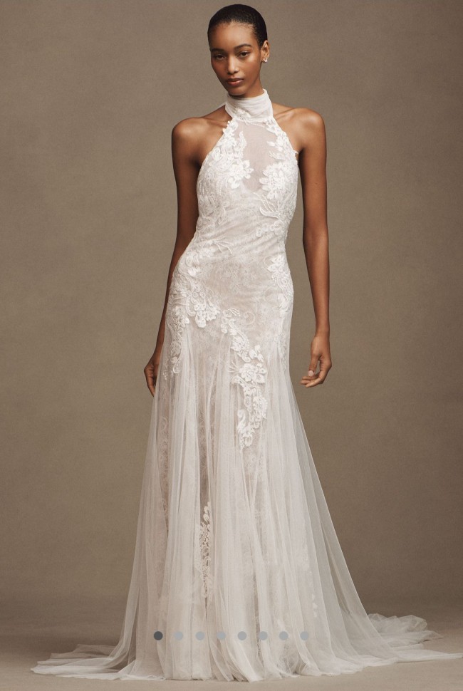 New with tags watters Zoe halter dress purchased at BHLDN/Anthropologie. I’m usually a size 4 and this fits with plenty of room, unaltered, beautiful train. Love the layers of lace and the bow in the back. Decided I won’t have time for an outfit change so selling this beautiful dress.