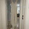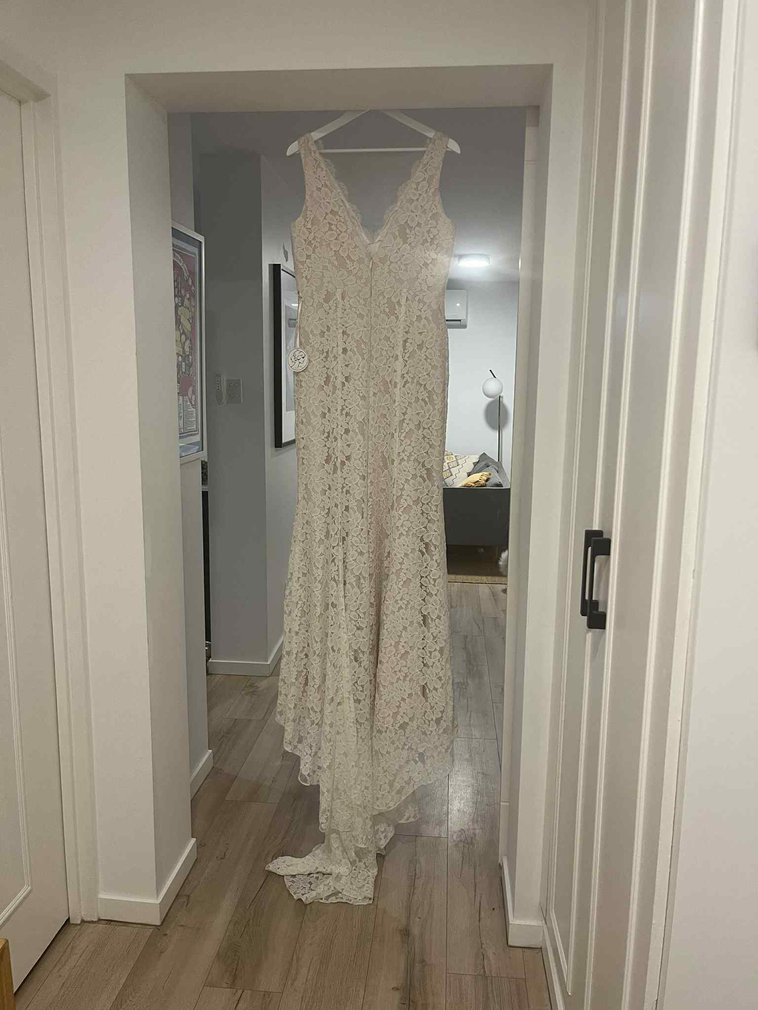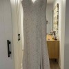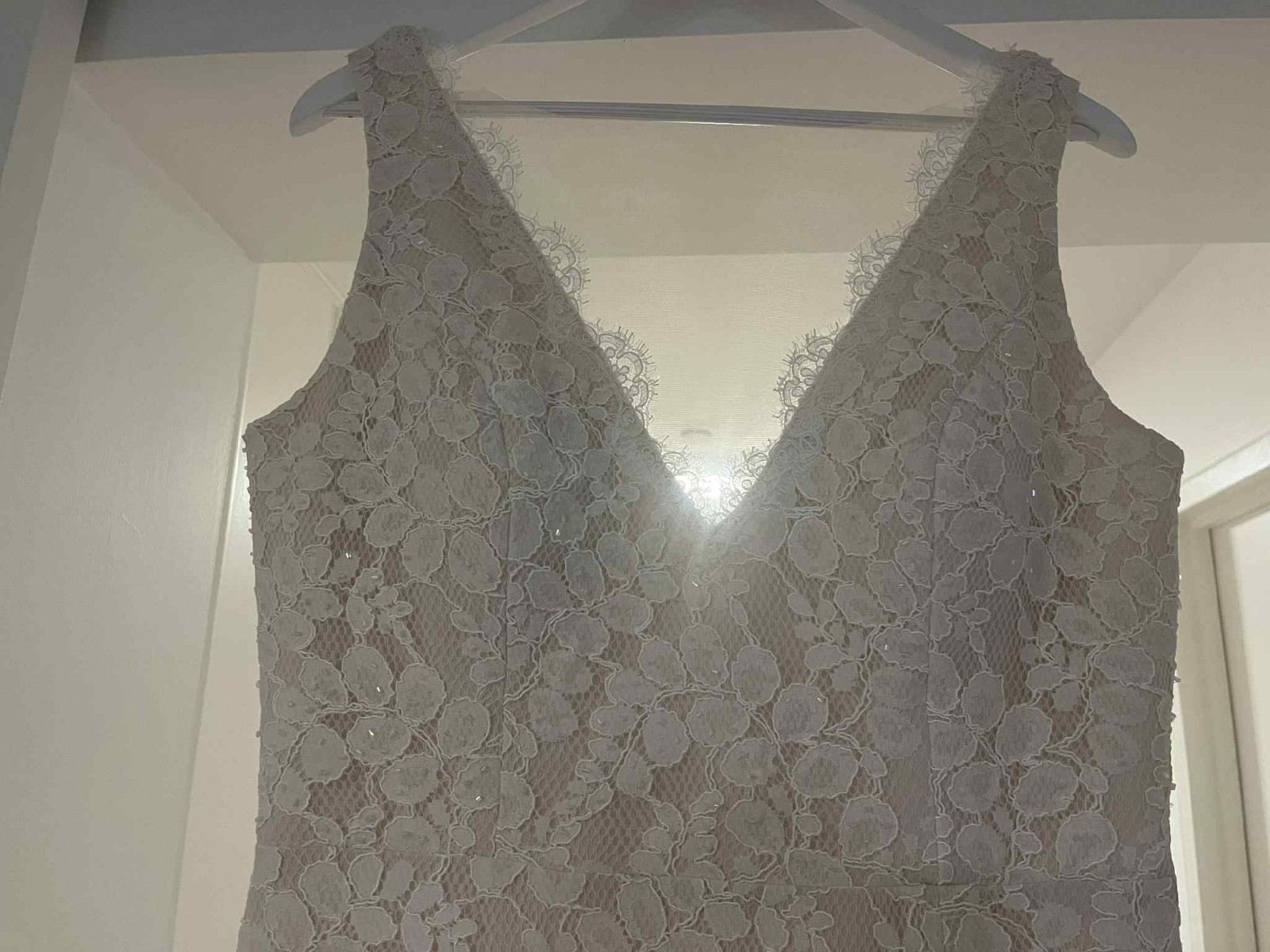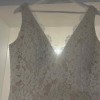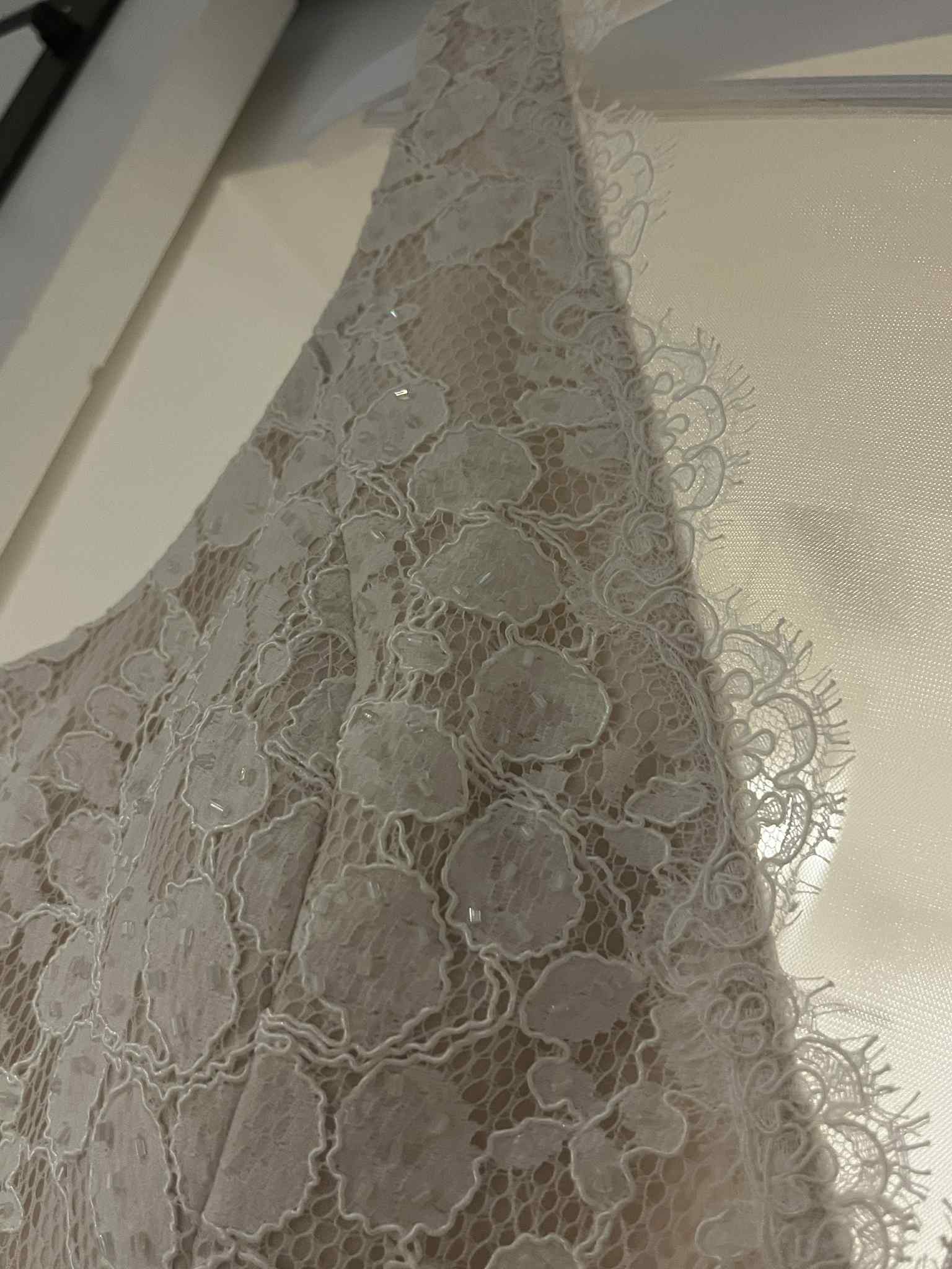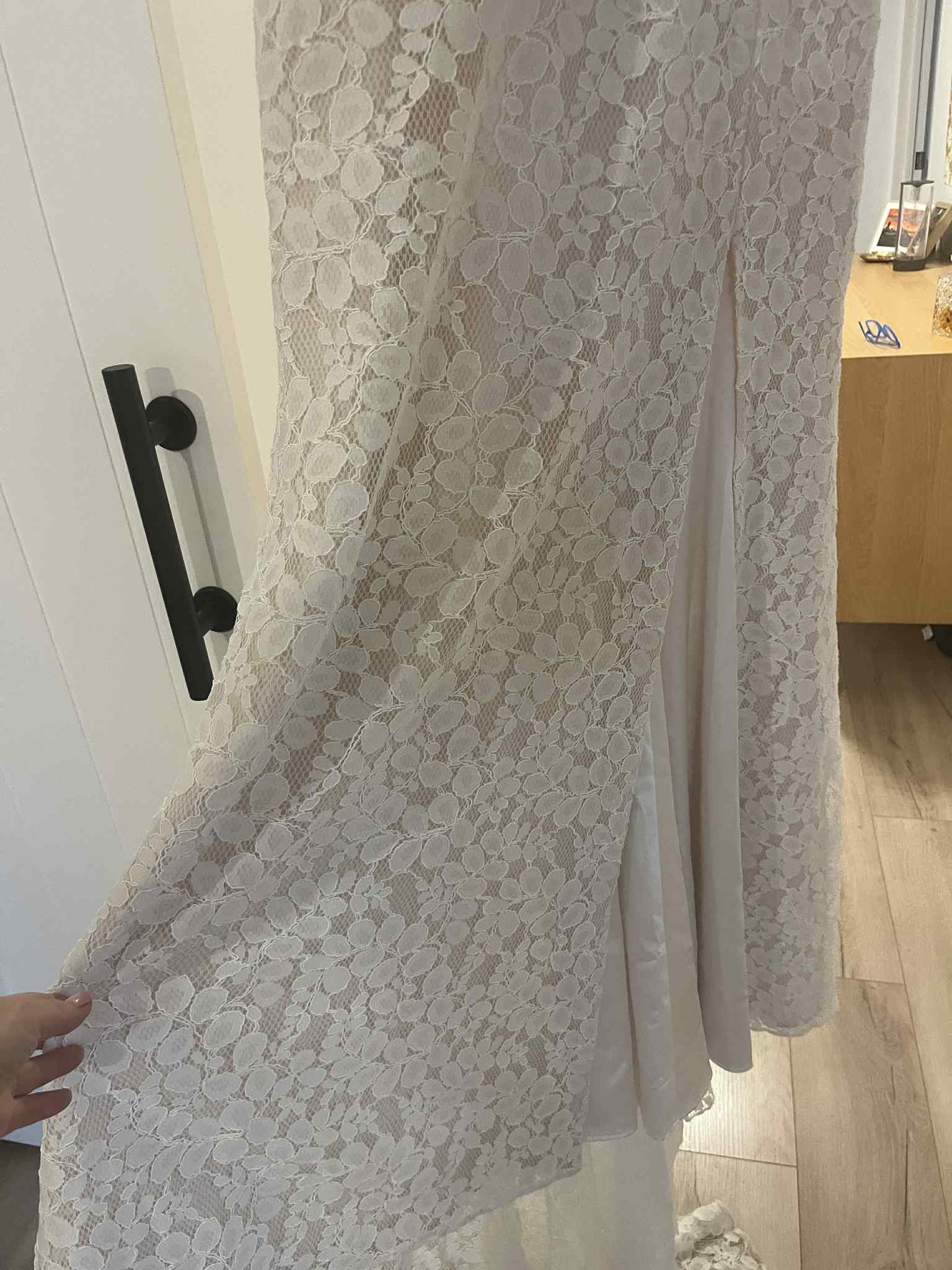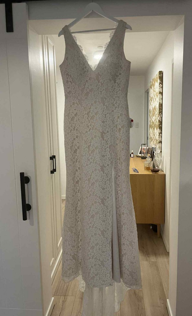This stunning size 14 wedding dress is brand new, never worn, and crafted from exquisite English lace with a beautifully soft lining for comfort and luxury. Elegant and timeless in its silhouette, it features a tasteful front slit—just high enough to add a touch of allure without compromising sophistication. Hand‑sewn diamantes scatter gentle sparkle across the lace, catching the light in the most romantic way. A perfect blend of classic style and subtle sexiness, this gown is ideal for the bride who wants to feel effortlessly elegant with a hint of modern glamour.