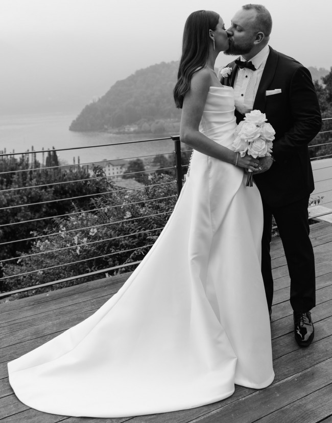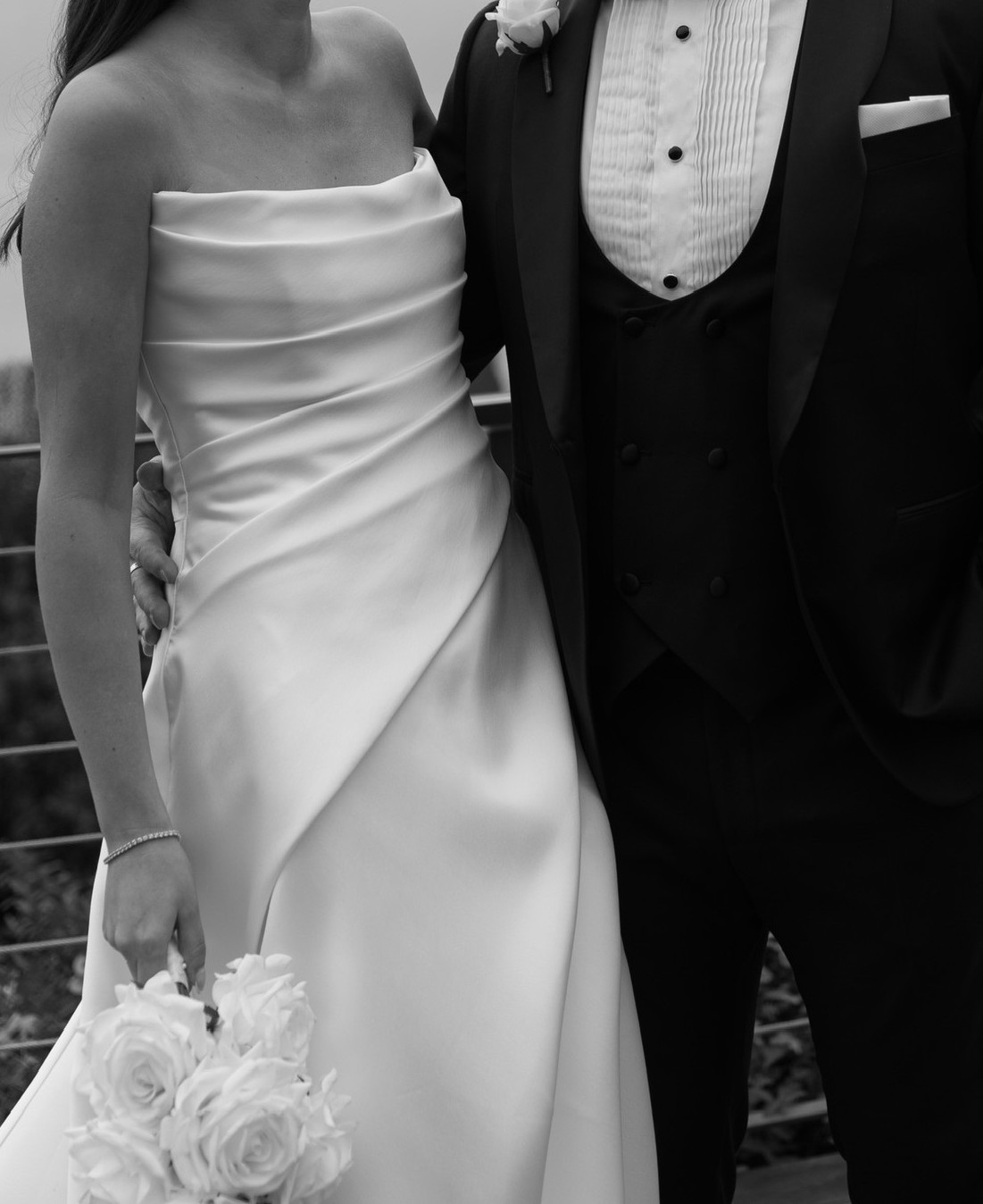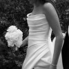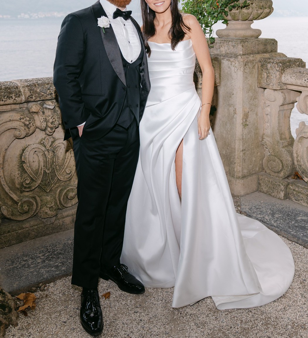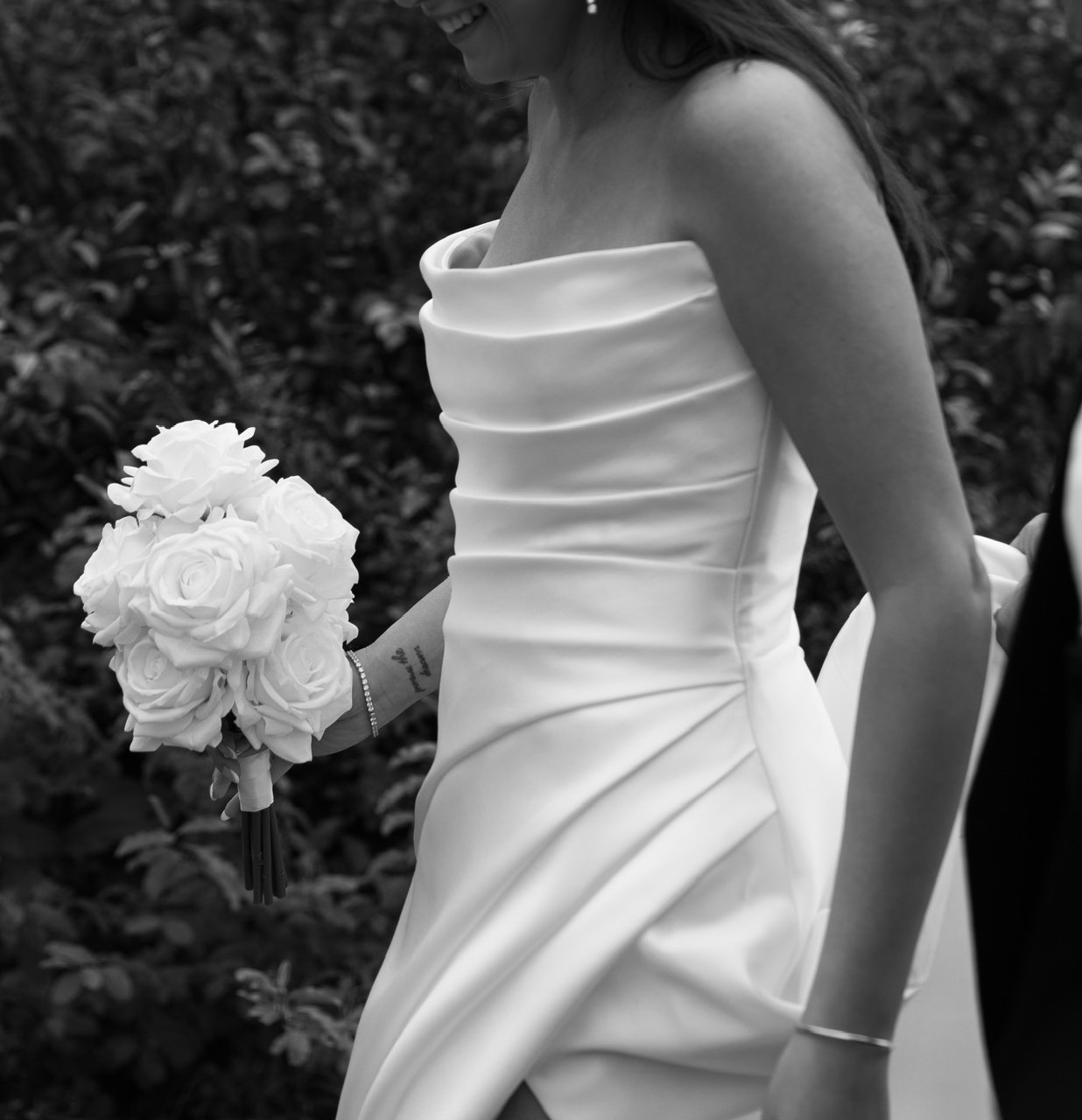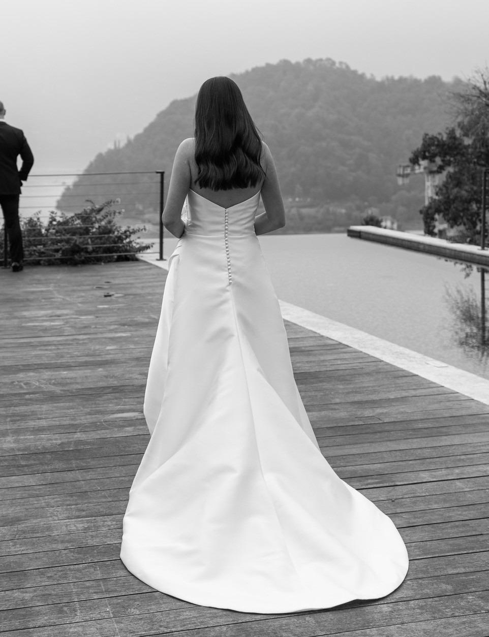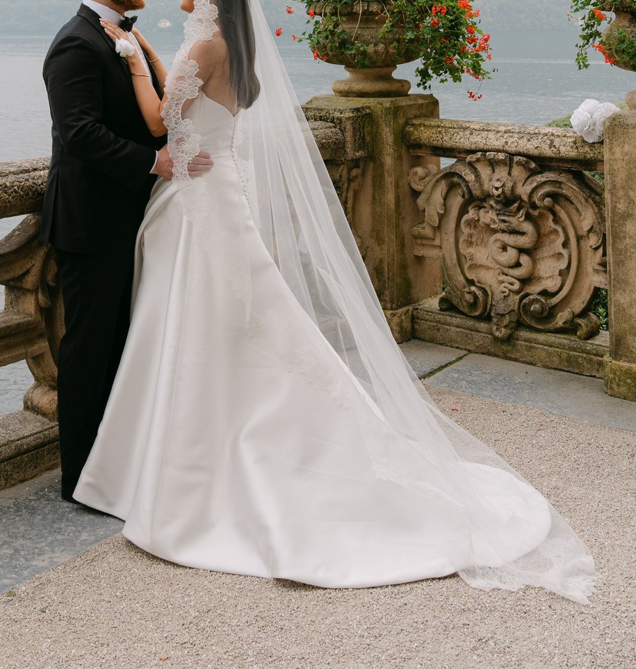 Custom made to measure, this gown is renowned for its universally flattering A-line silhouette. The expertly placed pleating cinches and shapes the waist, creating an effortlessly elegant and slimming effect. Crafted in luxurious light ivory mikado, it offers incredible comfort throughout the day while still making a breathtaking statement. I received endless compliments wearing this dress — it’s truly unforgettable.