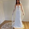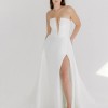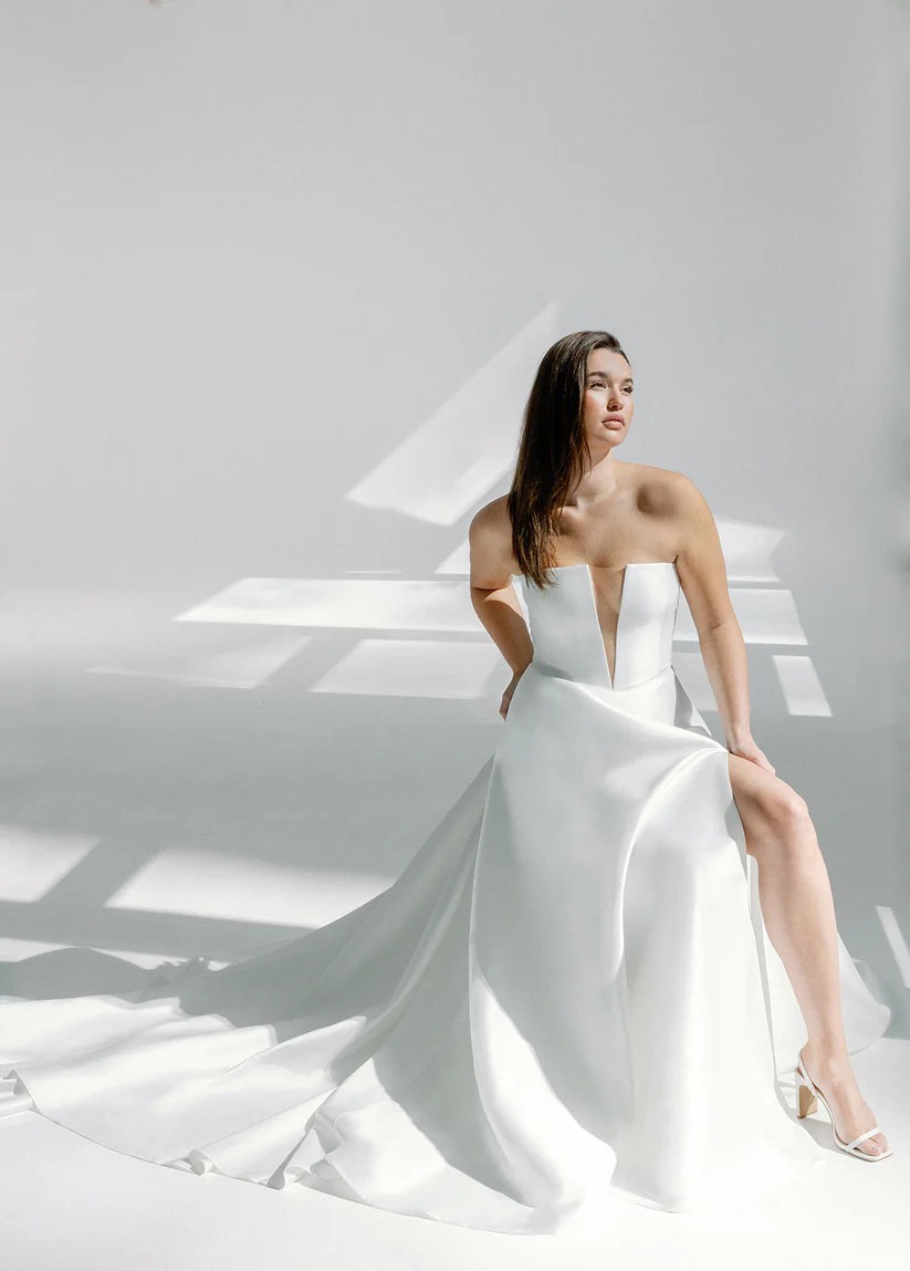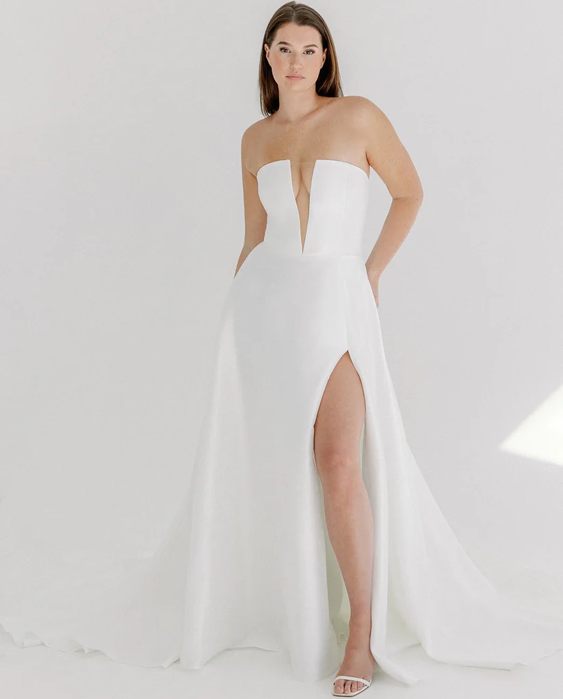 This Sloane dress by Alyssa Kristin embodies timeless elegance with a modern twist, perfect for the discerning bride looking to make a statement. Crafted in a luxurious fabric that drapes beautifully, this A-Line silhouette flatters the figure while providing the ease of movement that every bride desires. The straight neckline and mid-back design create a sophisticated look, while the strapless styling allows for a beautiful display of the collarbone and shoulders.