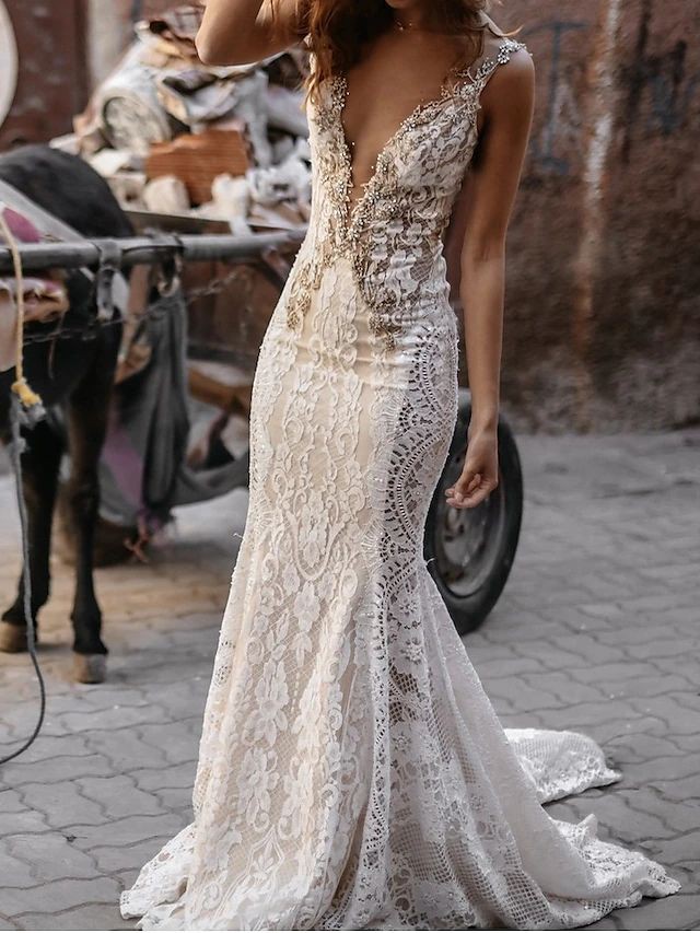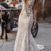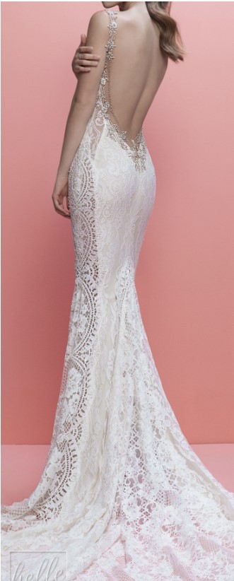 Galia Lahav "Luca" is a stunning hand-embellished backless mermaid gown with a deep illusion V-neck, exquisite lace & embroidery, crystals, an open back, and a chapel train.