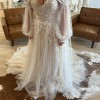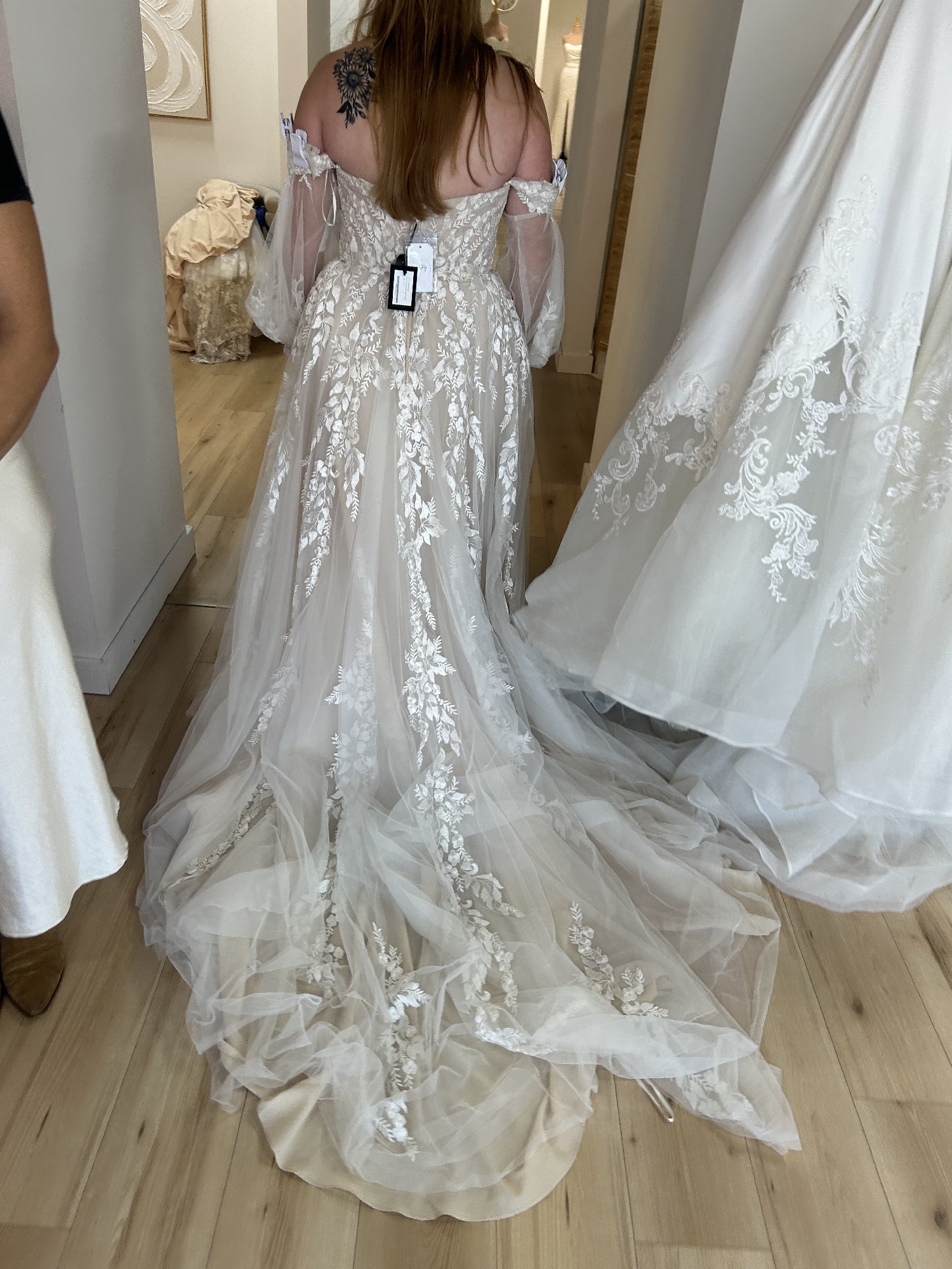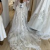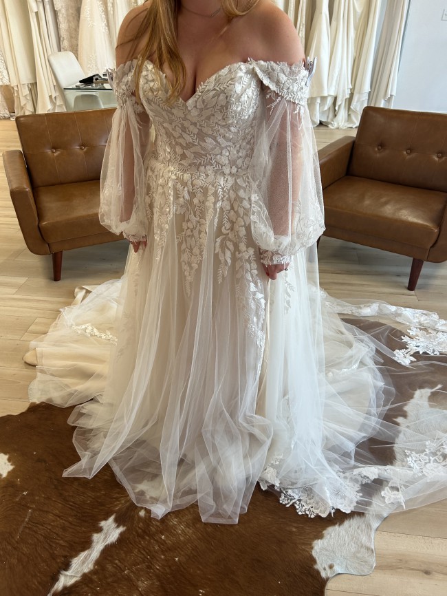 The stunning embroidery adds a layer of artistry, intricately detailing the fabric with delicate patterns that shimmer with every movement. The high slit introduces an unexpected element of allure, allowing for a playful glimpse of leg and creating a striking entrance. Complete with detachable off the shoulder straps and additional material to create matching puff sleeves, this dress can be personalized for the ceremony and reception, enabling you to effortlessly switch from dramatic to demure throughout your celebration.