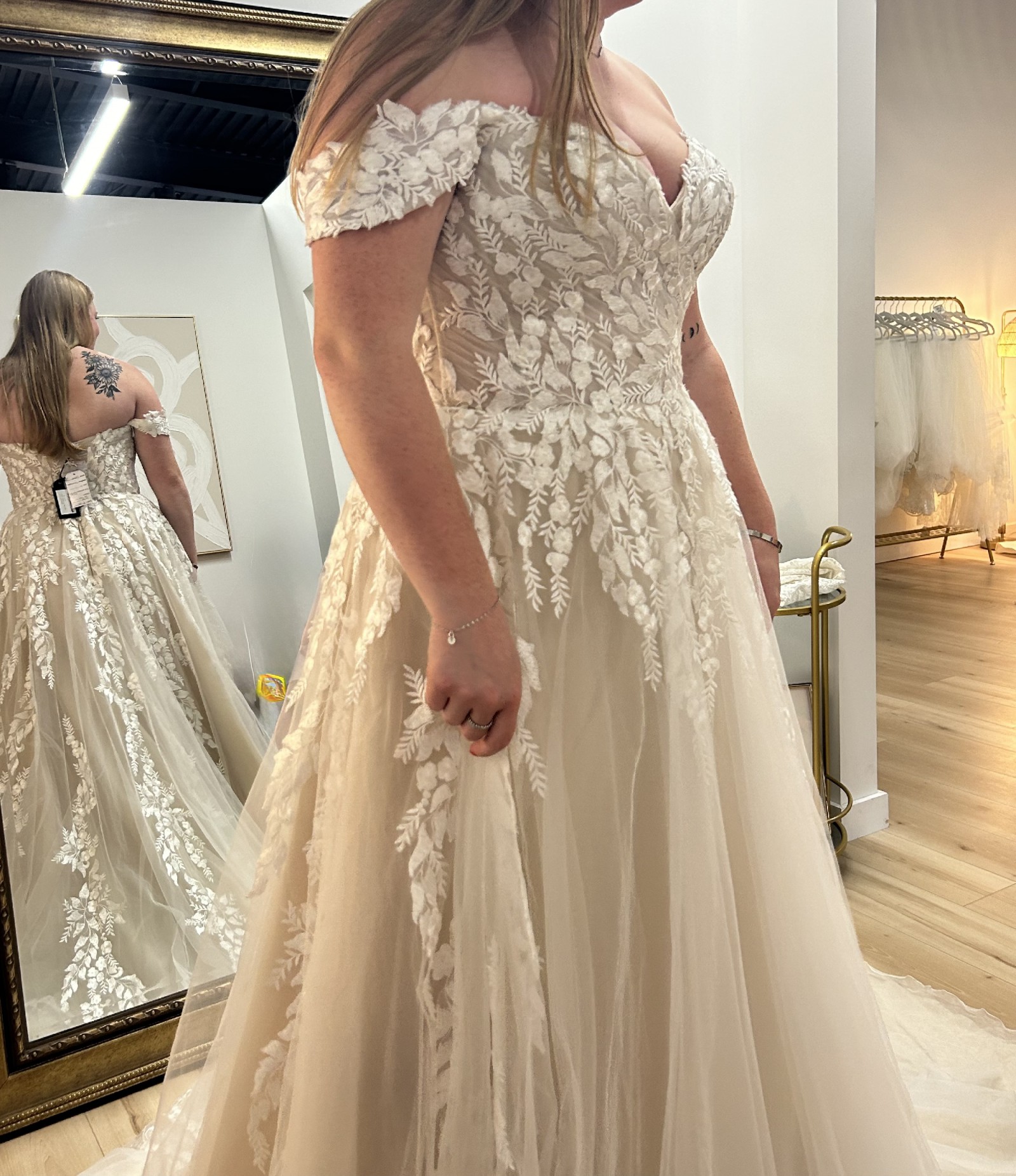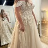 This exquisite Justin Alexander Carlee wedding dress embodies romance and elegance with a contemporary twist. Its graceful A-line silhouette flatters every figure, effortlessly draping over curves while providing ease of movement that any bride will cherish on her special day. The off-the-shoulder neckline adds a touch of sophistication, drawing attention to the collarbone and creating a timeless look.
