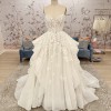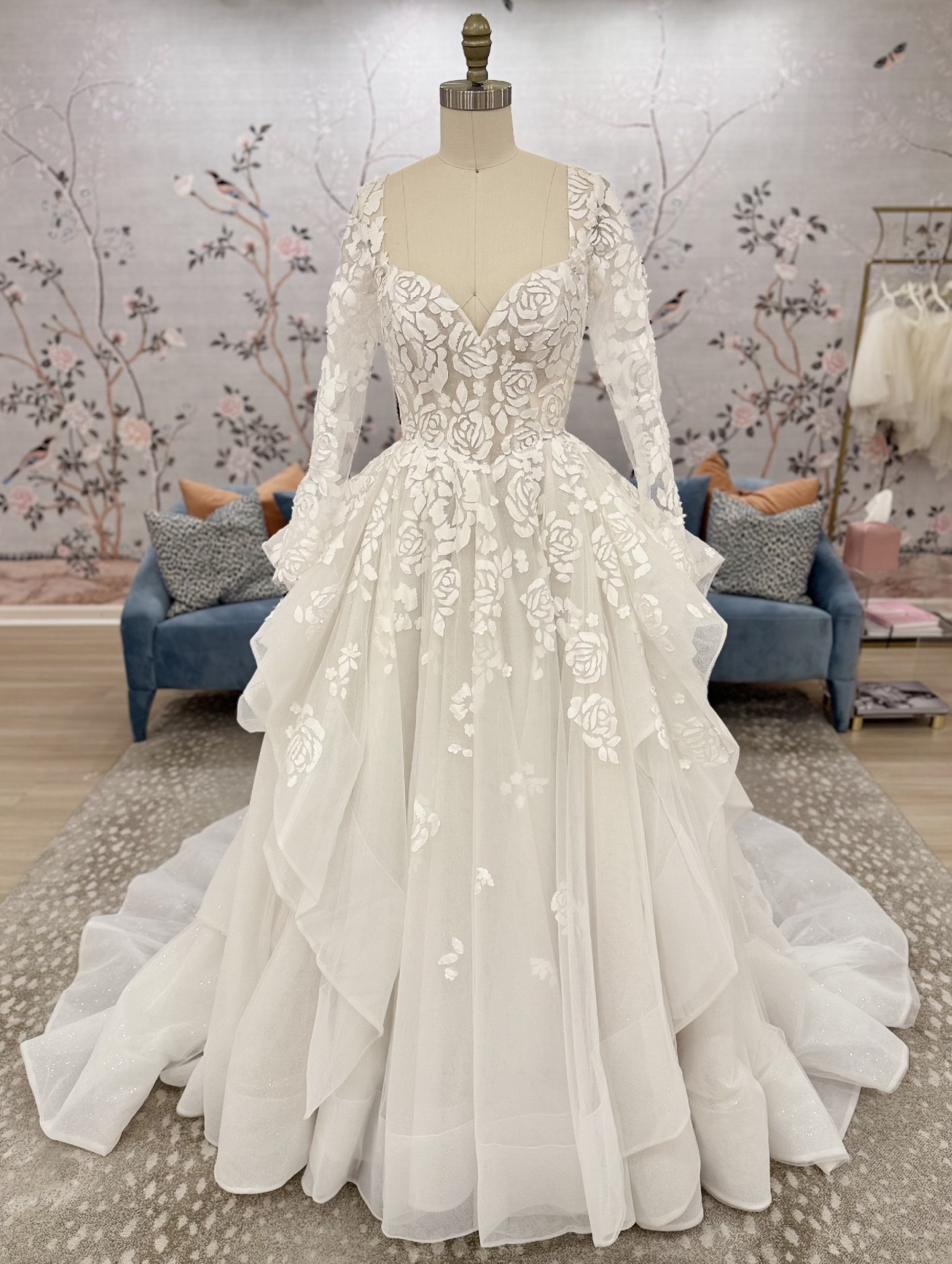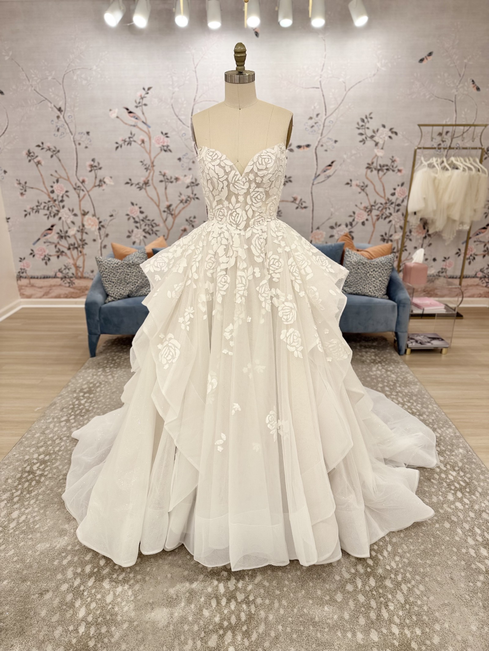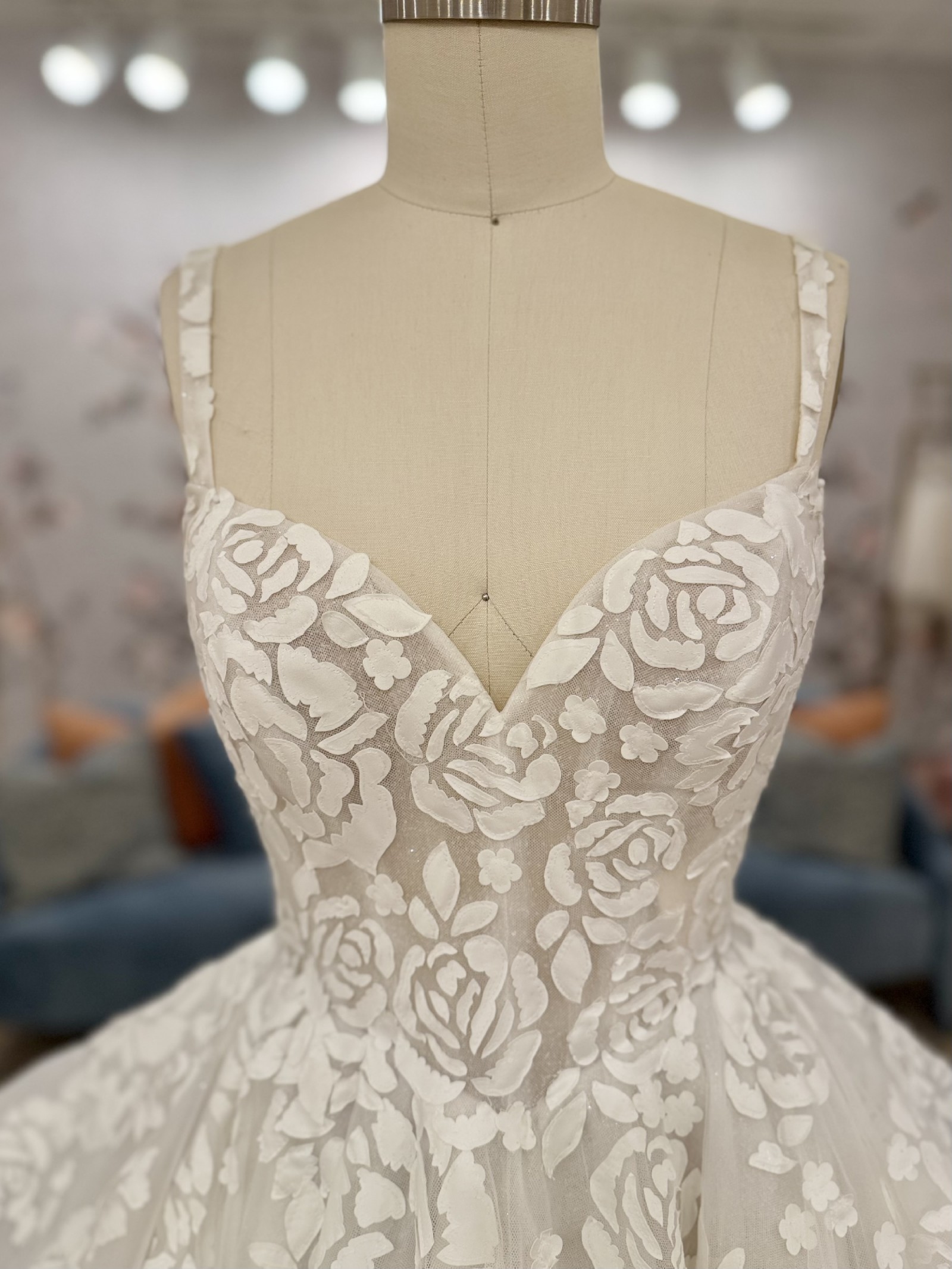 Ivory mosaic floral ballgown with sweetheart bodice, cascading tulle skirt and cathedral train.