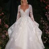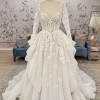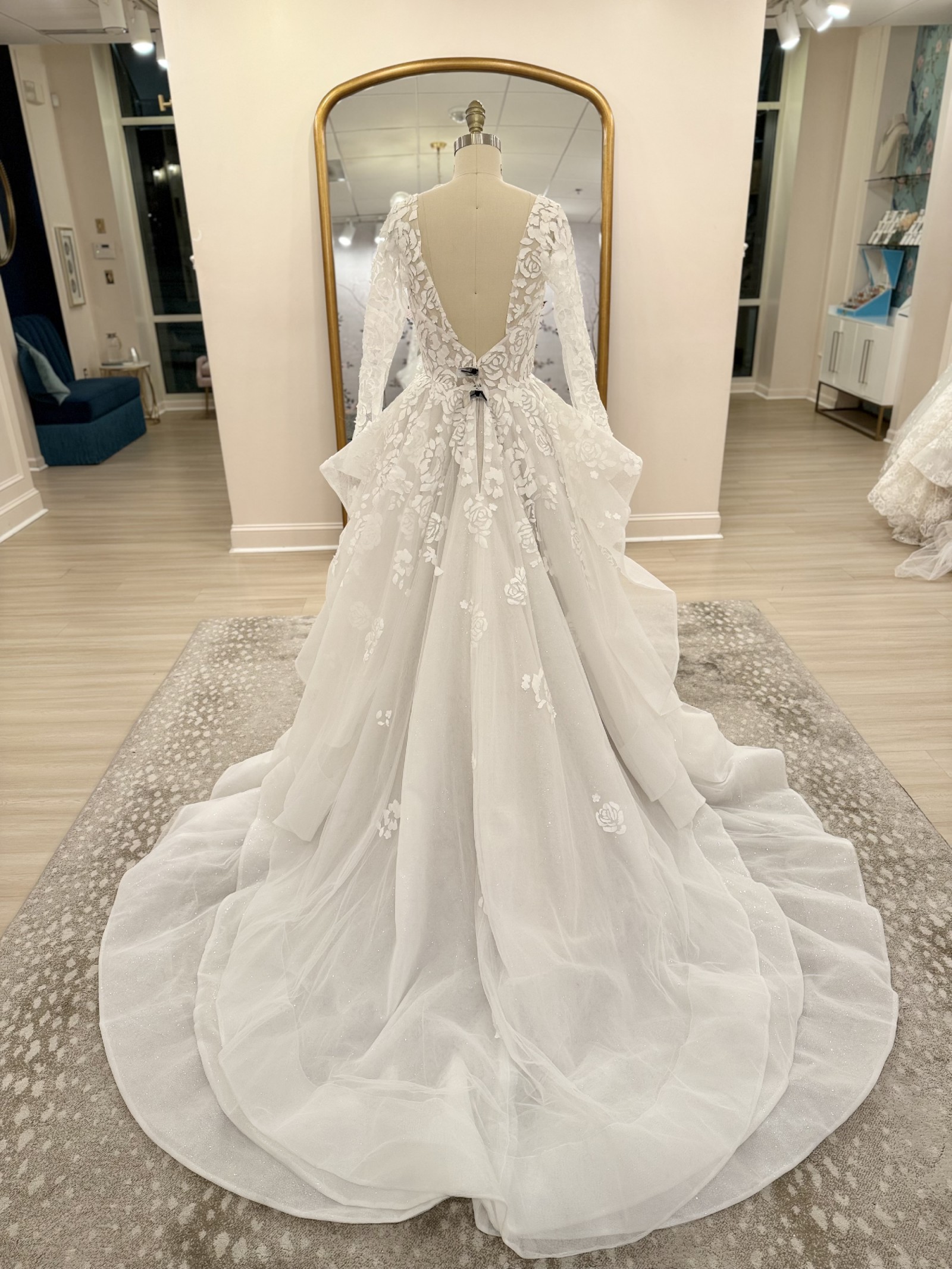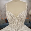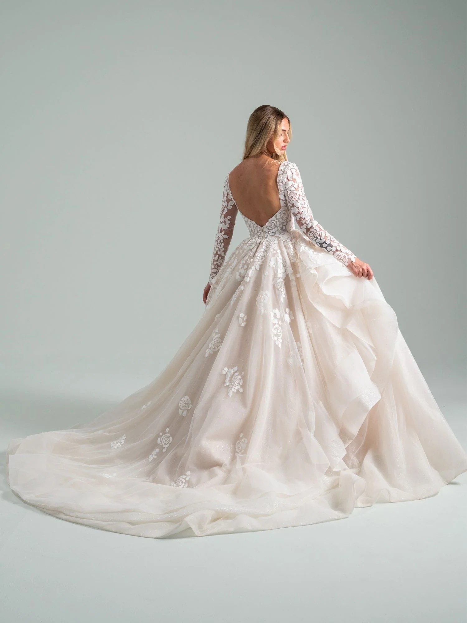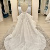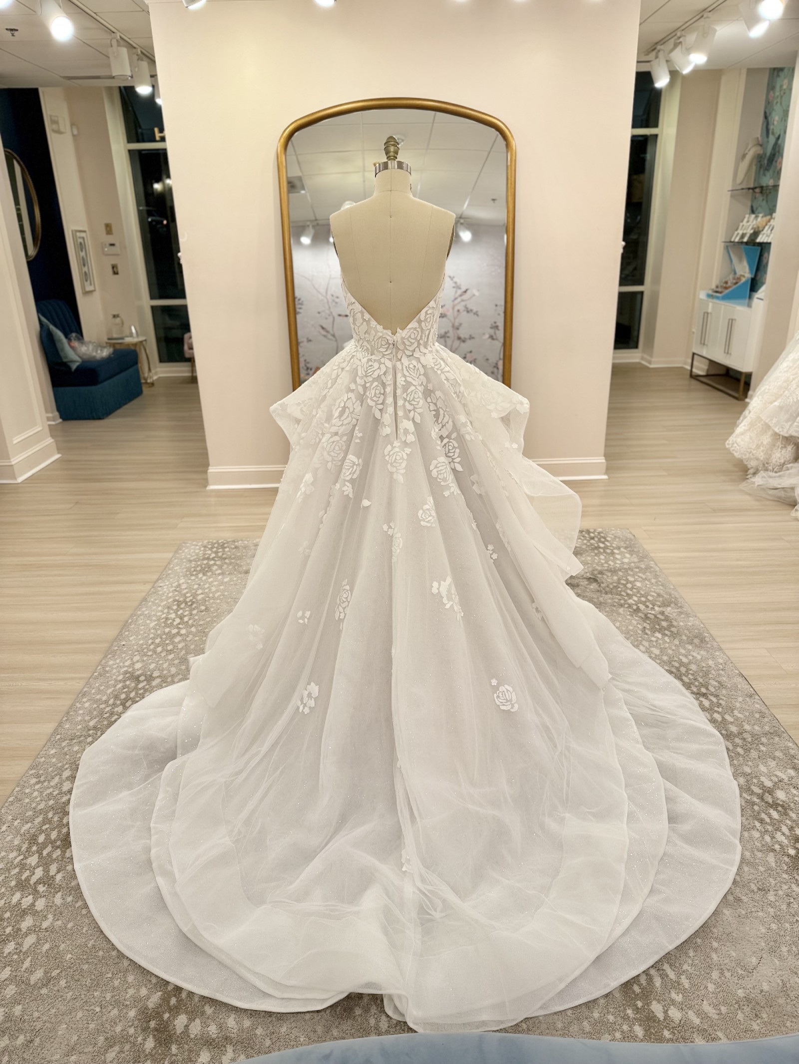 Ivory mosaic floral ballgown with sweetheart bodice, cascading tulle skirt and cathedral train.