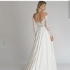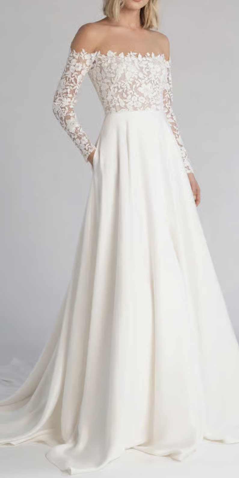 The Bradley bridal gown is a true romantic! Intricately embroidered florals give way to an elegant Mikado ball skirt. The sheer bodice is fully boned for a beautifully structured fit, and an illusion tulle yoke supports the off-the-shoulder neckline invisibly.