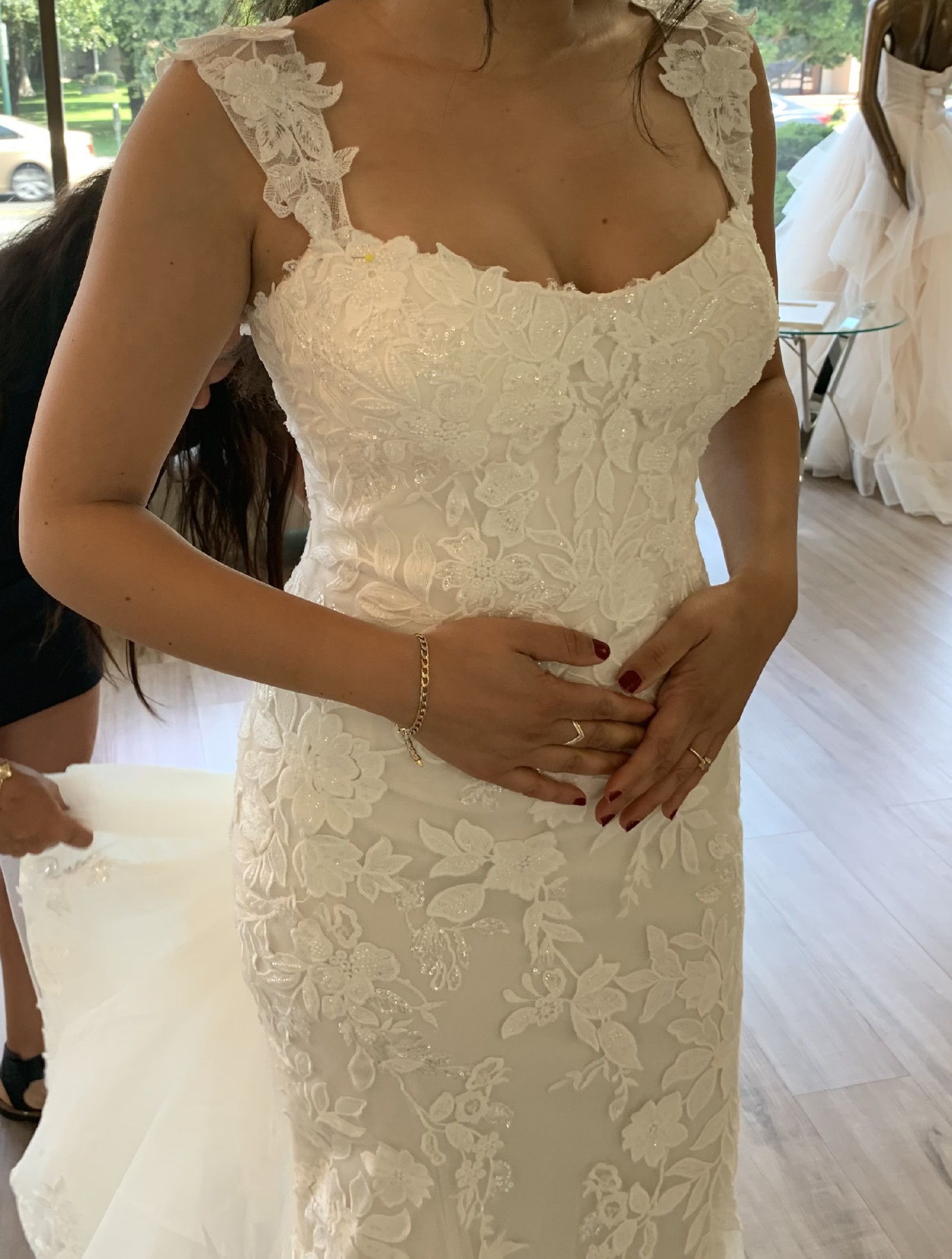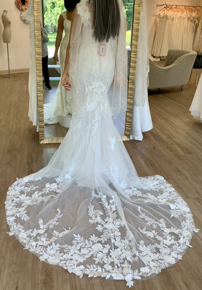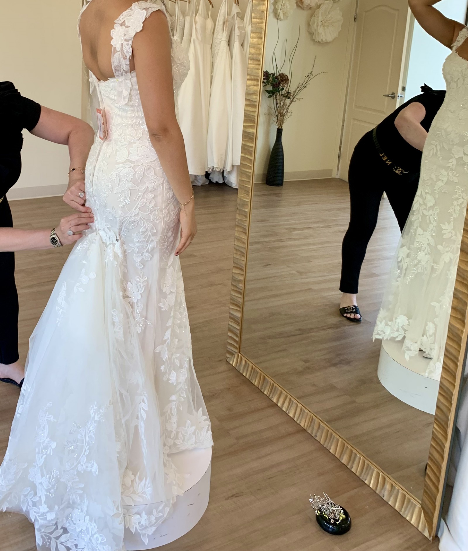 Includes custom square neck line, fully lined bust and back, illusion cap sleeves (detachable). Also already includes bustle - ready for your big day!