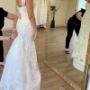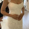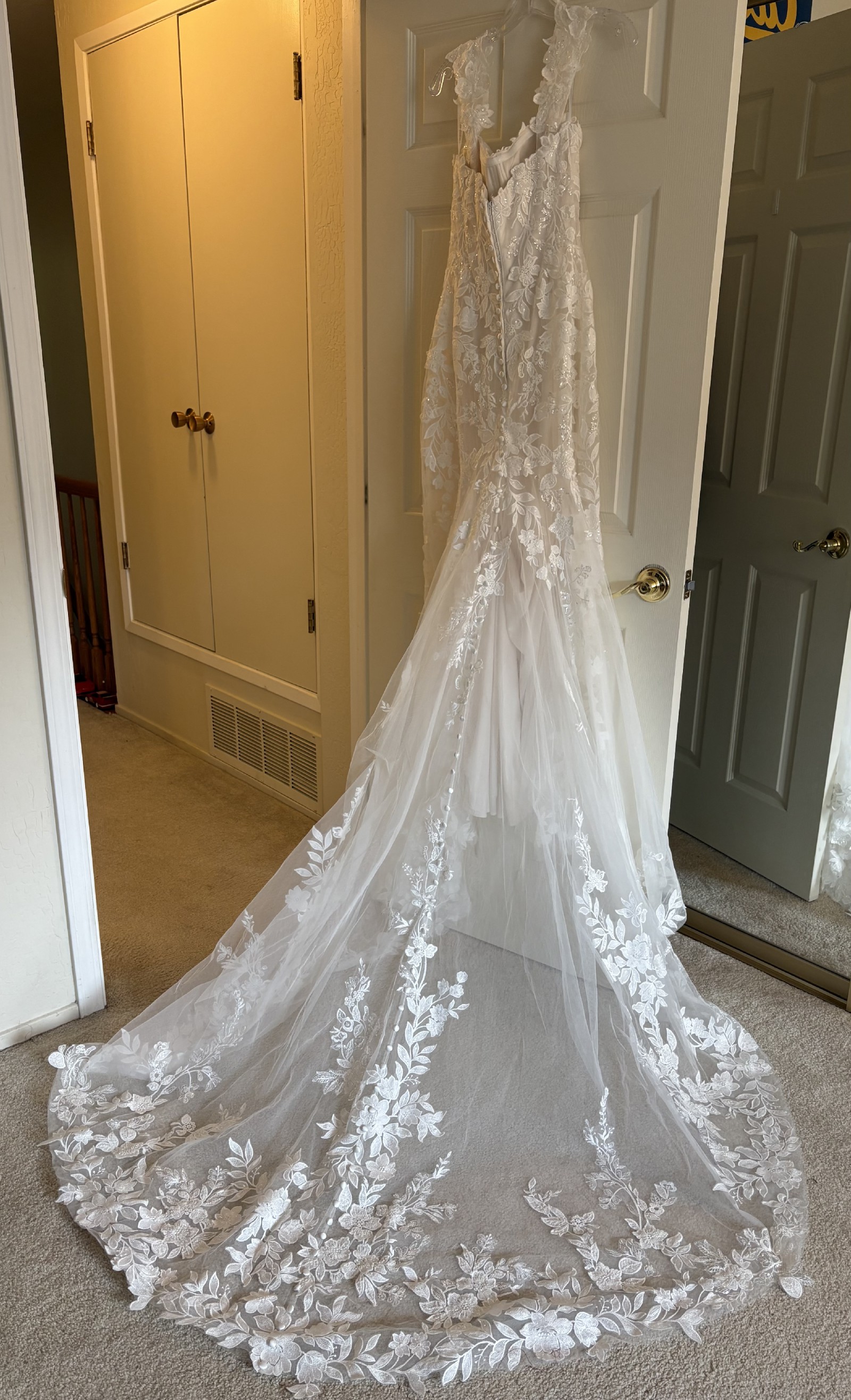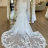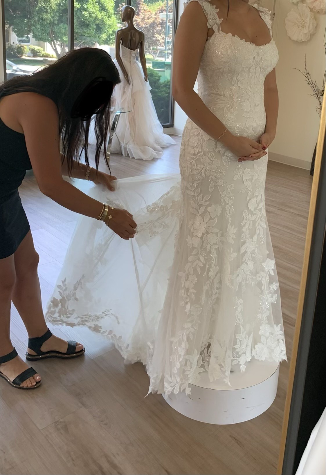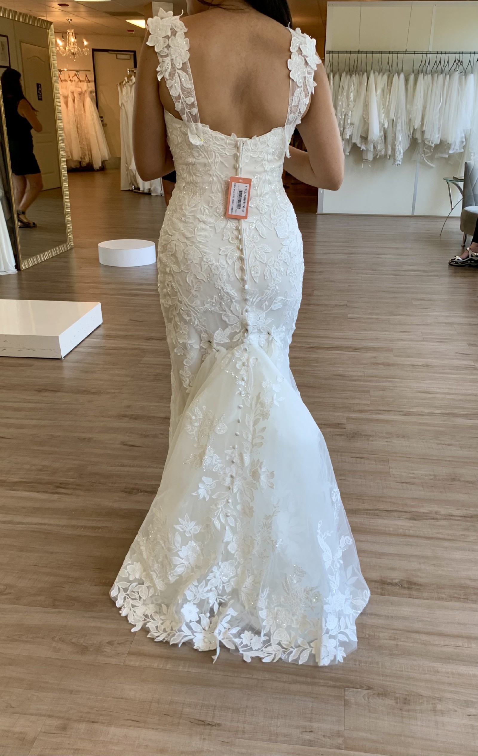 Includes custom square neck line, fully lined bust and back, illusion cap sleeves (detachable). Also already includes bustle - ready for your big day!
