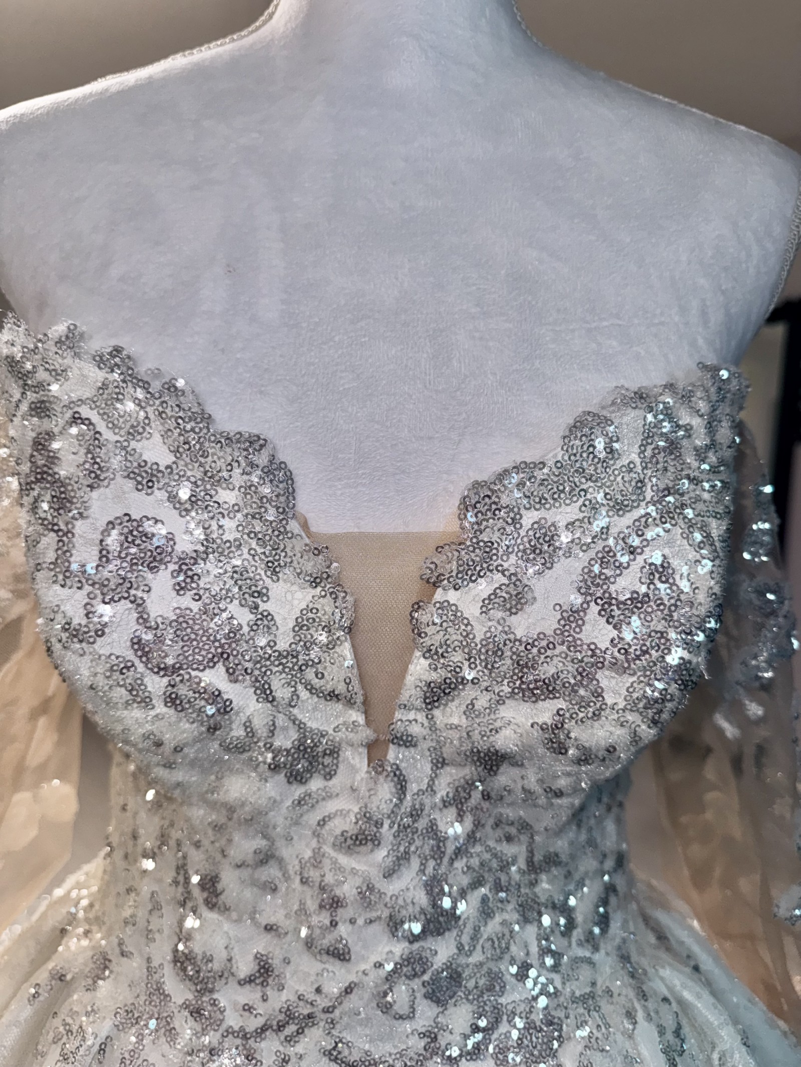 Gowns with sleeves are designed to accommodate various arm sizes and can be taken in or let out. We recommend alterations by an experienced bridal tailor.