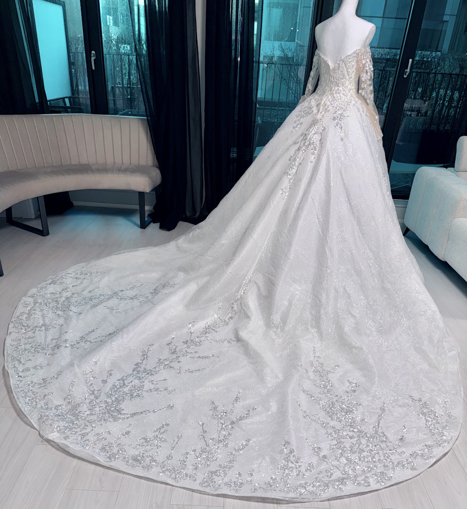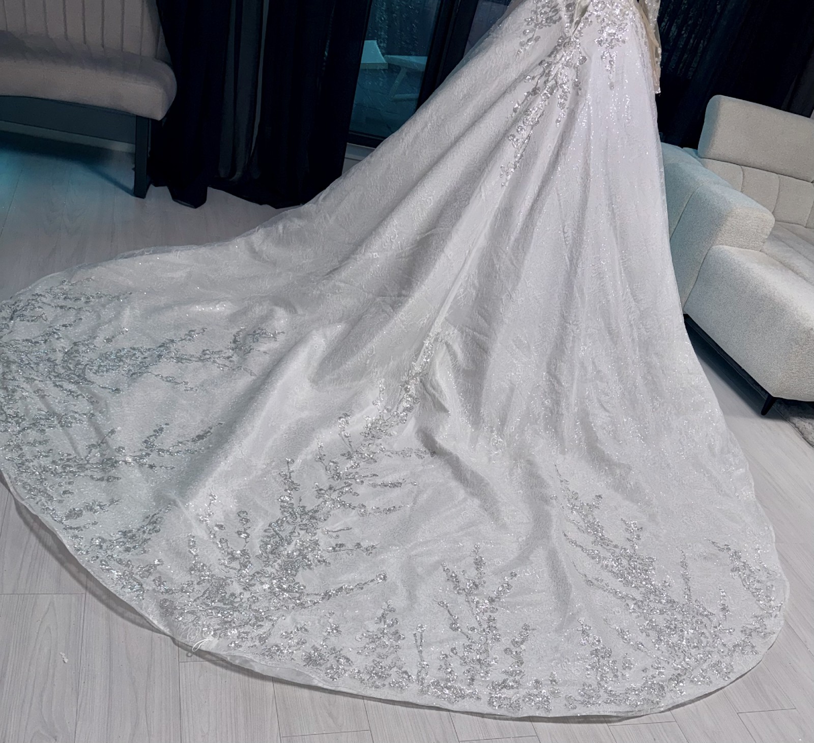 The gown features a beautifully flowing silhouette and is complemented by a matching extra-long veil, designed specifically to harmonize with the dress and its approximately 2-meter train. Together, the gown and veil create a timeless and dramatic bridal appearance.