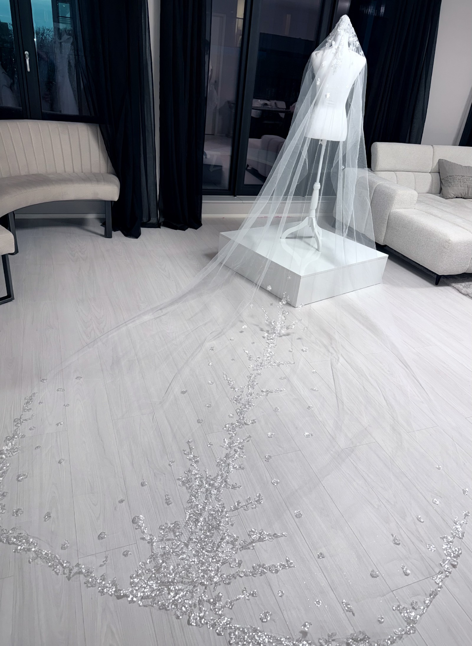 The veil is crafted in the same style and aesthetic as the gown, ensuring a seamless and cohesive look from head to train. Its generous length enhances the overall silhouette and is ideal for ceremonial entrances, photography, and formal wedding settings.