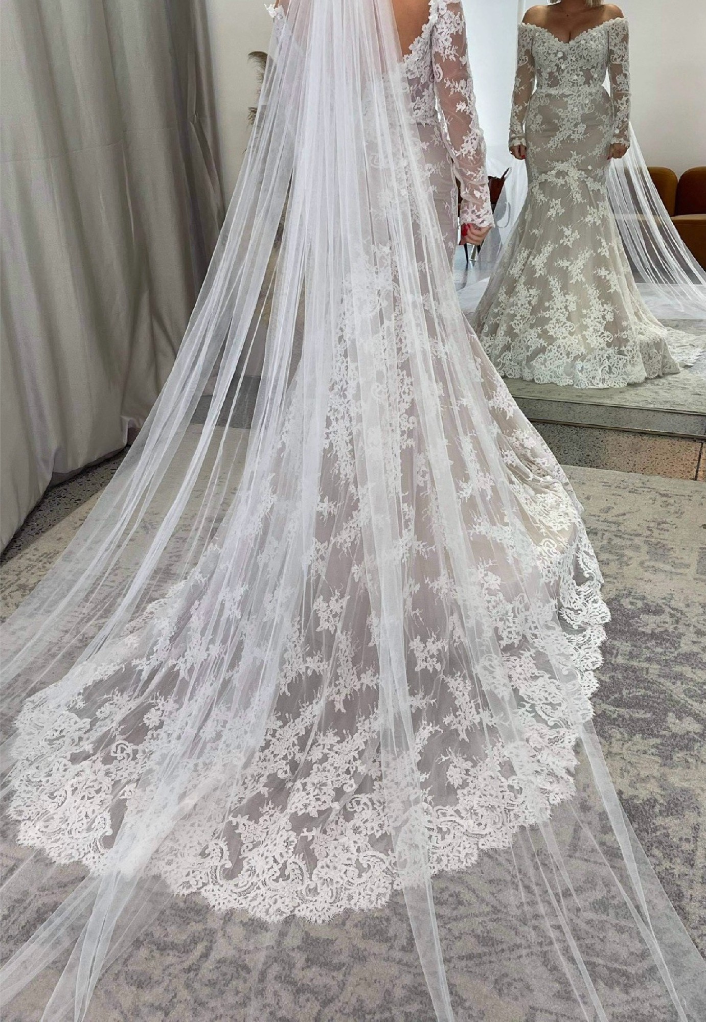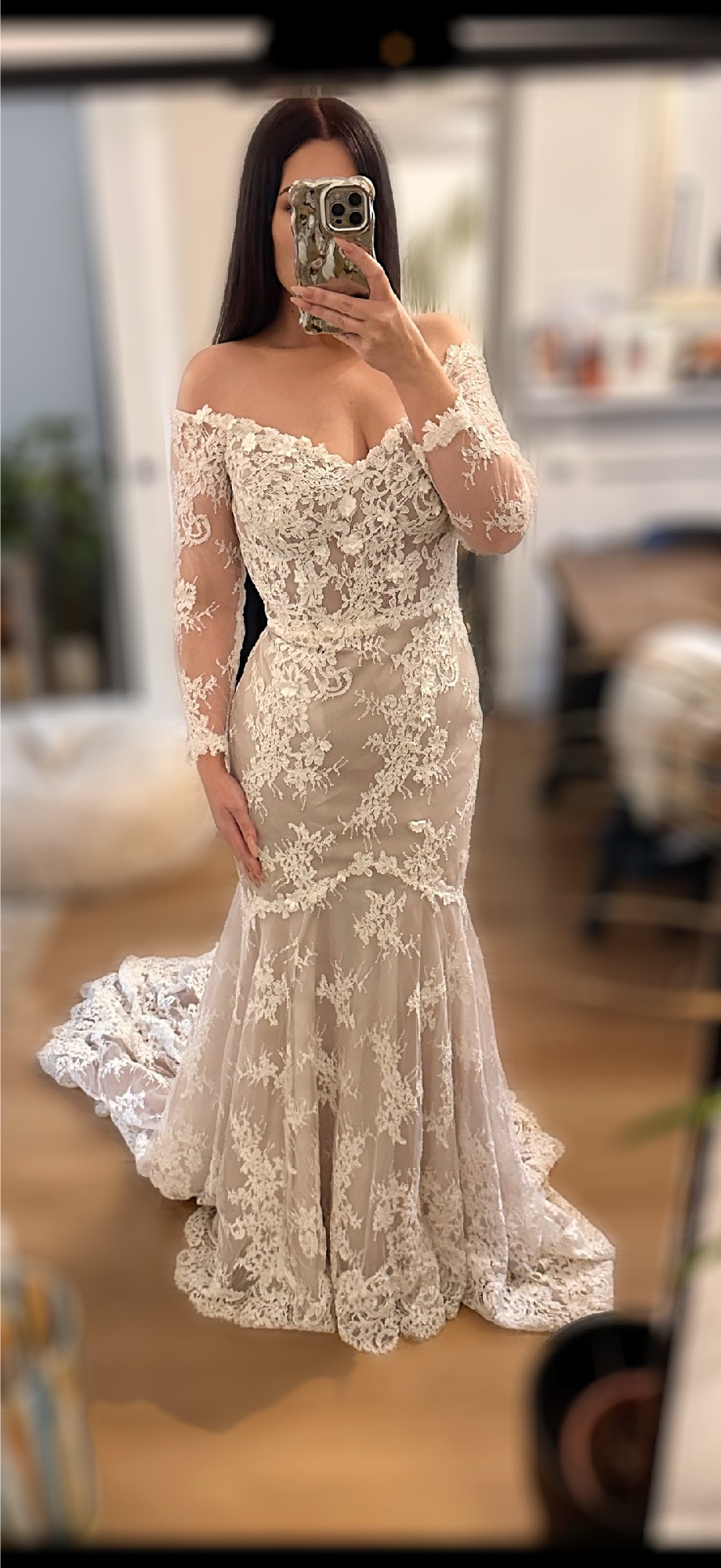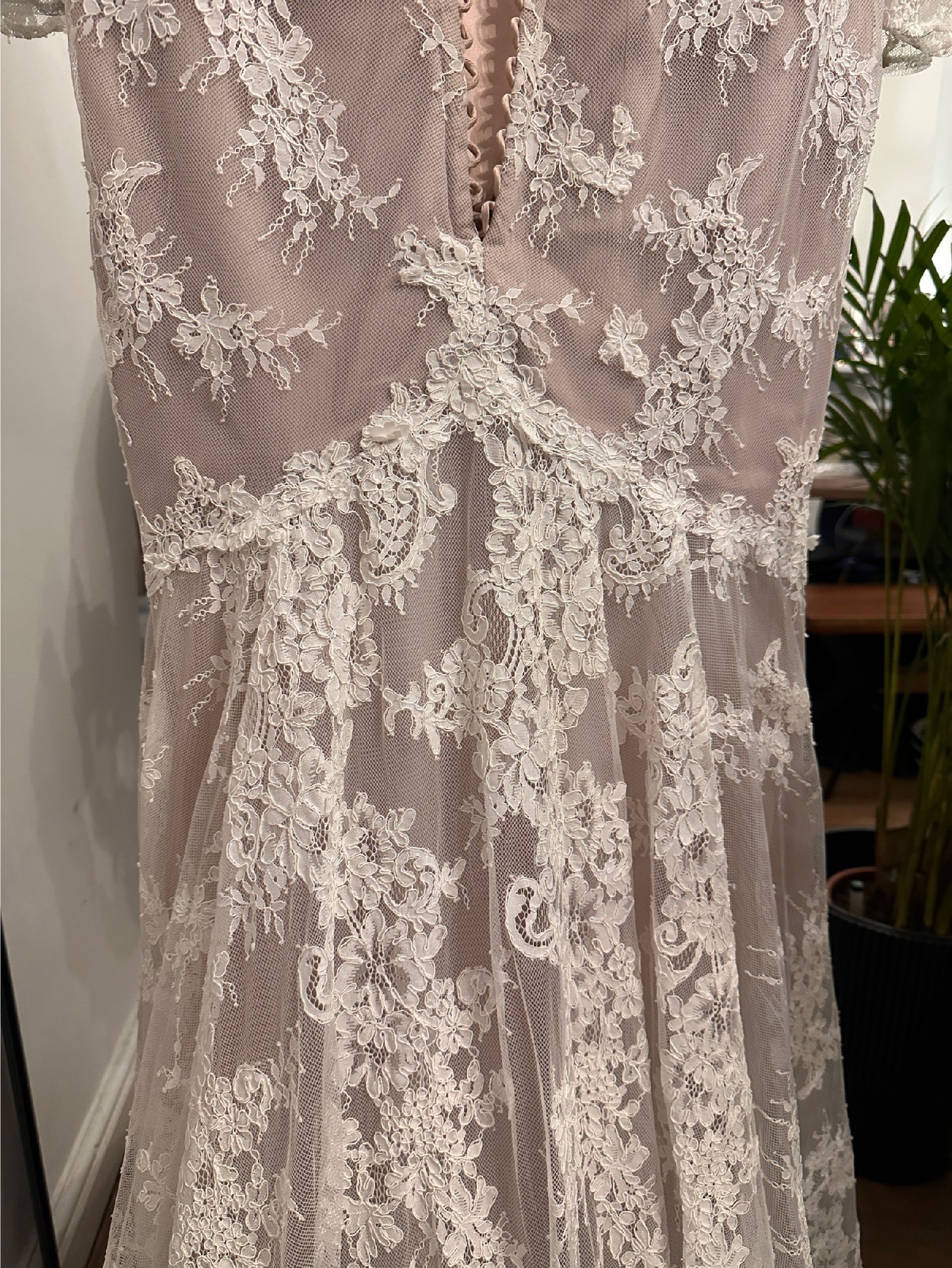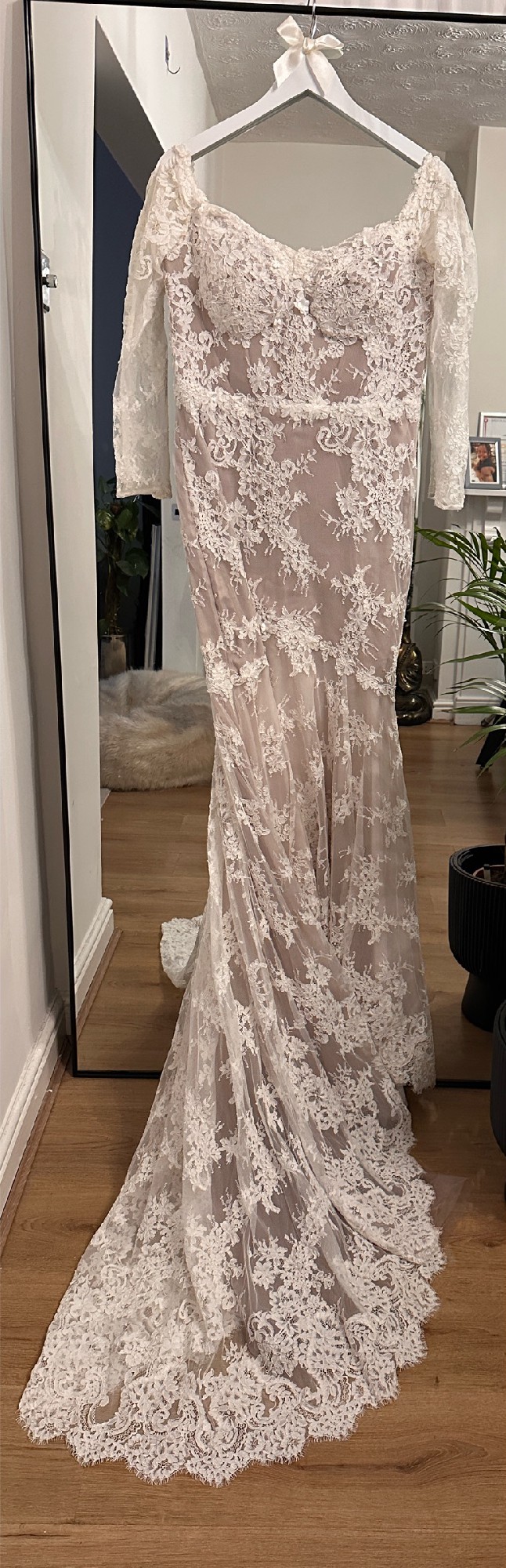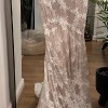 Azelea lace wedding dress by Alena Leena, in Ivory/Rum Size 14 but would also fit a 12 with minor alterations - photo 2, 3 & 4 are of the actual dress on the Bride who wore it - last photo shows me in the size 10 I bought this dress used, however I found one in the correct size for me so I’m selling the size 14. The Bride who wore it had a corset back fitted which actually cinches the waist much better than the original zip fastening. I have a video I can send on request. Measurements of dress: 41cm flat waist (measured across when dress is flat) which is tightened after corset is laced 45cm across bust when laid flat (measured across the middle of the cups) 41.5cm hip which is tightened after corset is laced Rrp £2869, I paid £1500 so will accept reasonable offers.