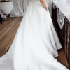 Crafted in luxurious off-white Mikado, the gown features a semi-transparent lace bodice adorned with bespoke botanical embroidery and subtle sparkling beadwork that adds depth and dimension. The sweetheart neckline offers a universally flattering shape, while beaded lingerie straps provide delicate support and a touch of sensual allure. The low-cut back framed with bead-encrusted lingerie straps is dazzling and the trimmed scalloped train creates exquisite balance like a masterful work of art.