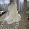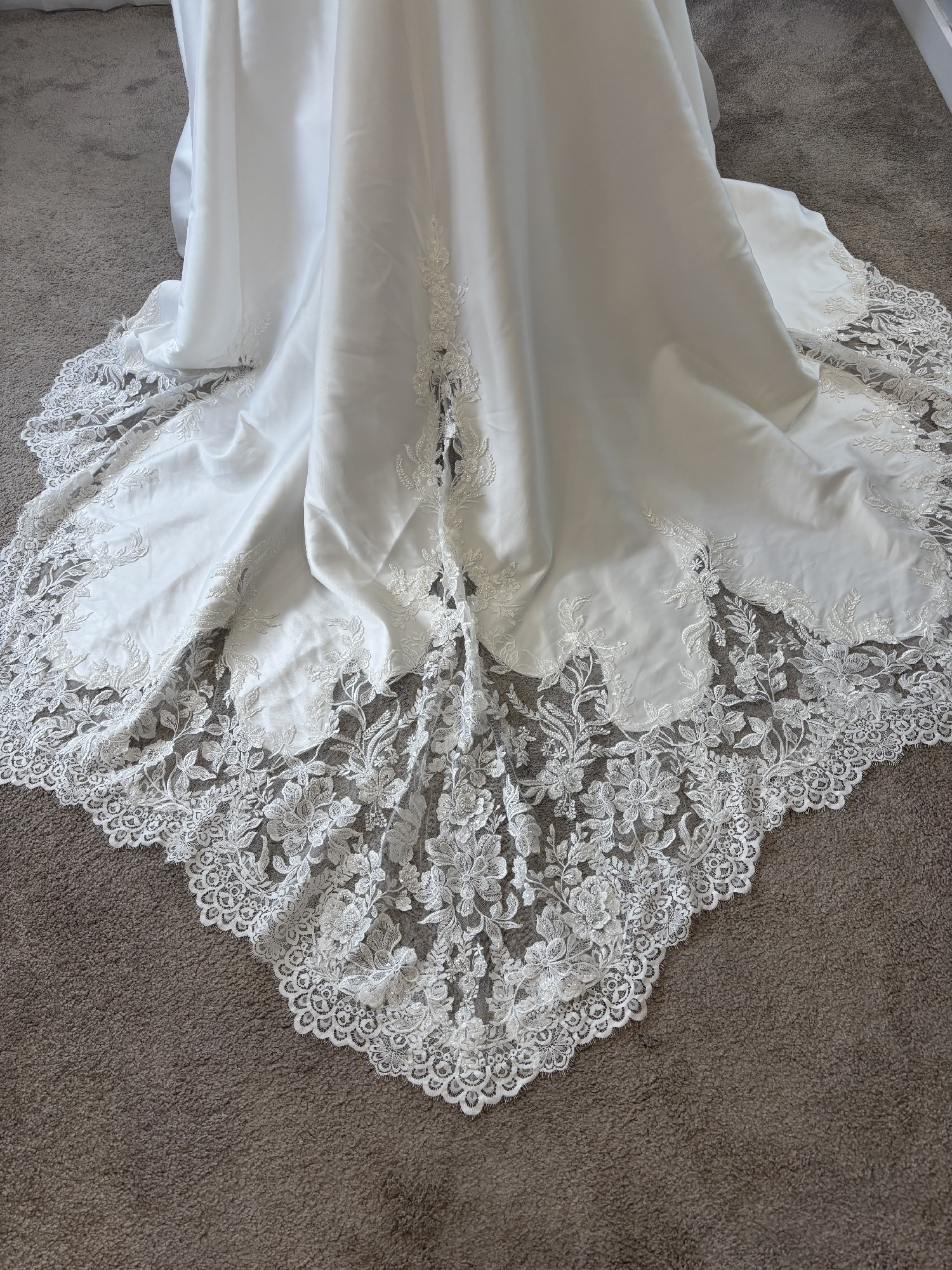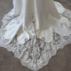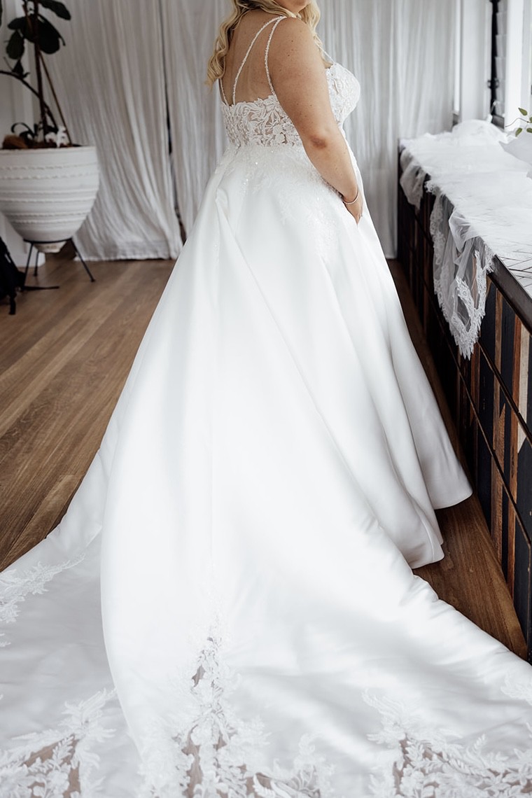 The full Mikado skirt flows into a scalloped lace-trimmed train, delivering volume and artistry in every step. The low-cut back adds a modern edge to the otherwise classic silhouette, making the Misti gown the perfect fusion of timeless elegance and fashion-forward detail.