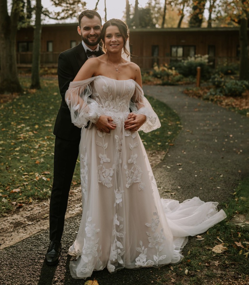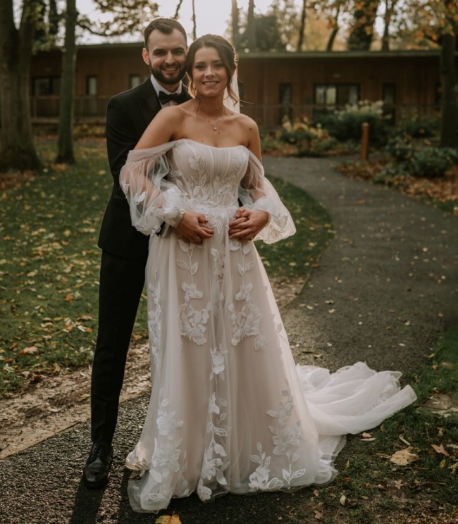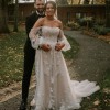 Allover lace A-Line wedding dress with sheer detachable off-the-shoulder blouson sleeves attached to a strapless bodice featuring a scoop neckline.