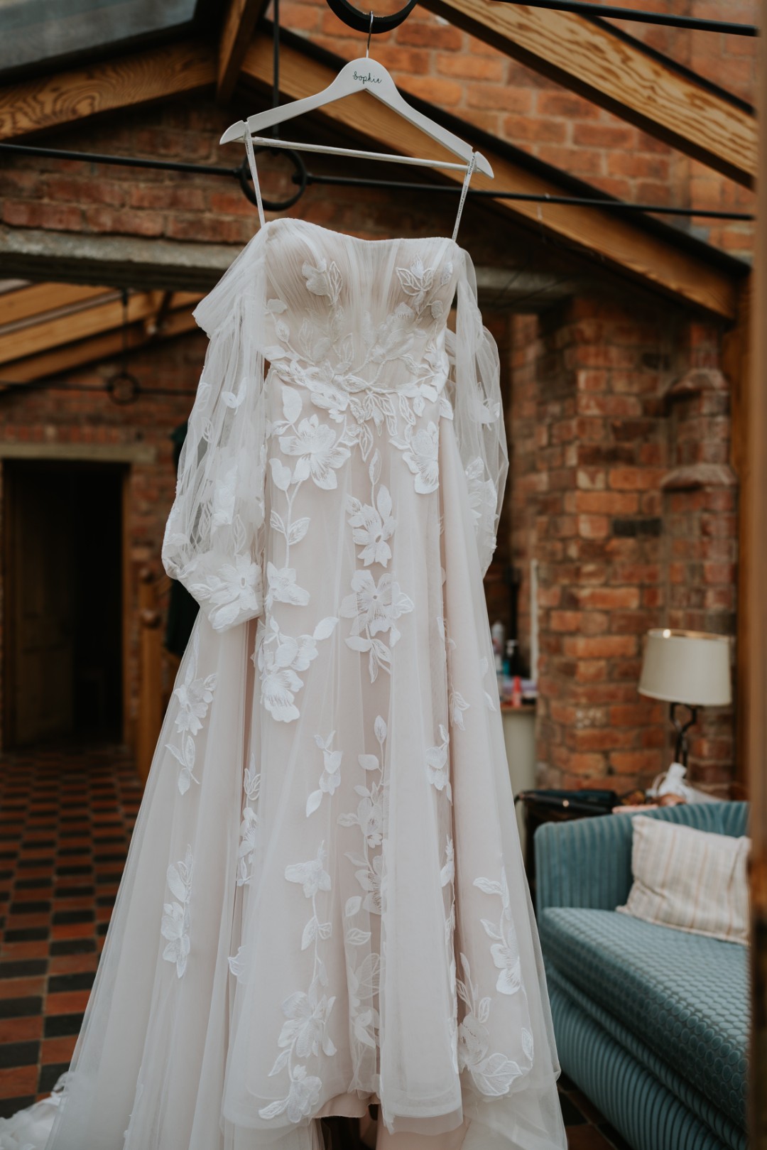 Ivory lace over a Biscotti gown