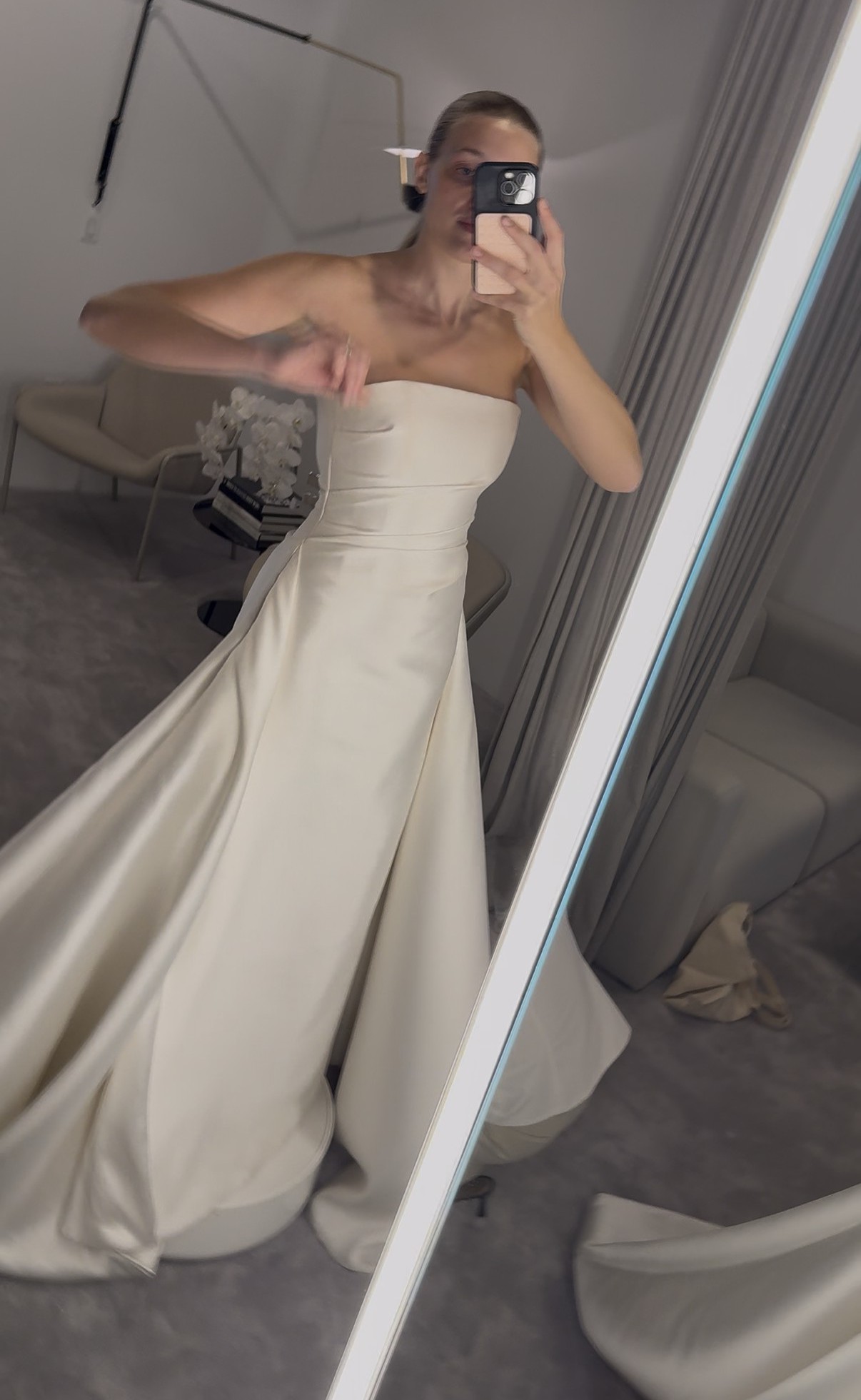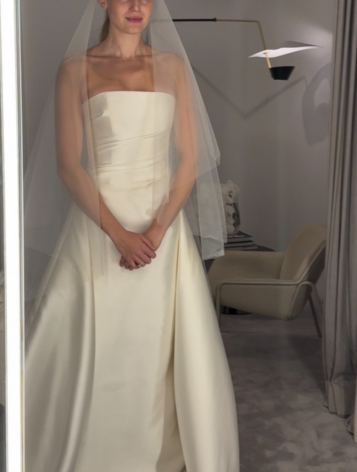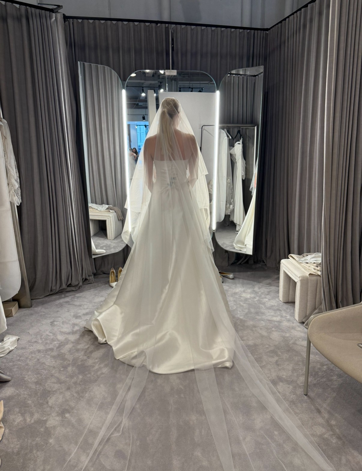 I purchased this gorgeous Ellery gown from Khya Bridal Studio that has a column silhouette in the front with an attached over skirt for an A-Line fullness which originally sold me on it. The dress is truly stunning and timeless. I don’t know if anyone else has been in the business of acquiring a bunch of white dresses but I have two and I ultimately decided on my other one. This is ready for pick up on April 15th from NYC. Happy to have you for try ons and recommend the tailor from the bridal studio. Also including a very simple very chic trimless veil that matches the dress!! (Last photos)