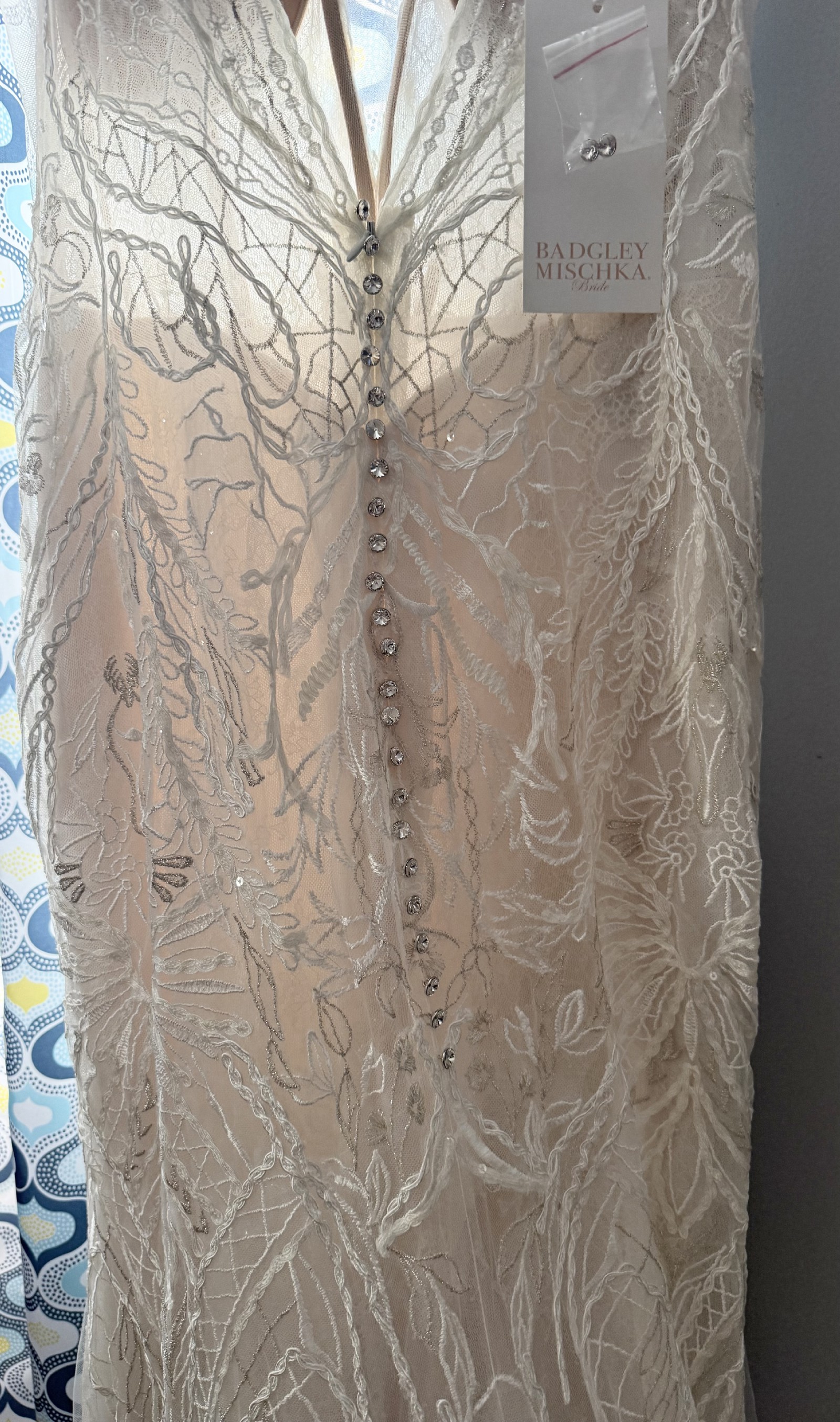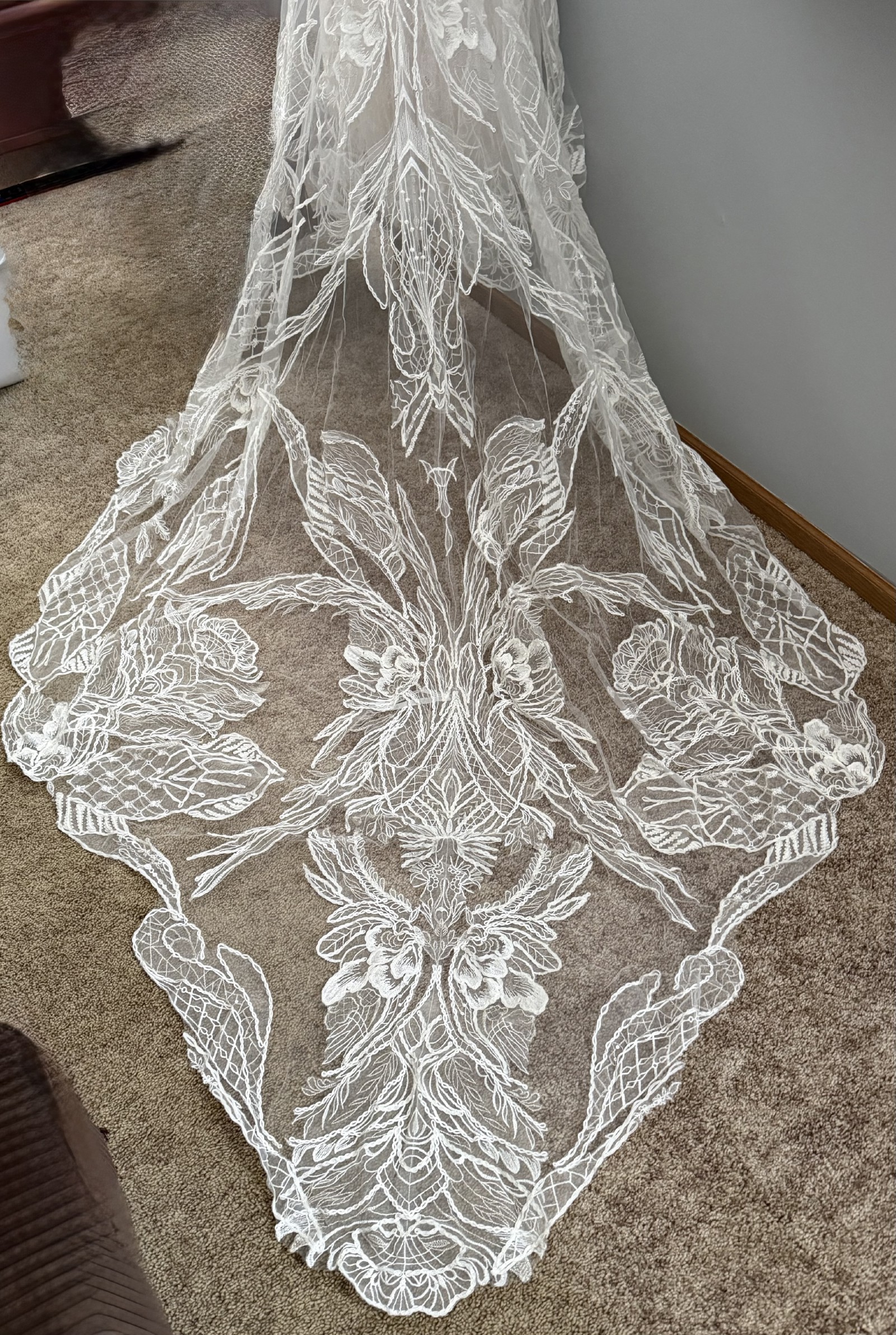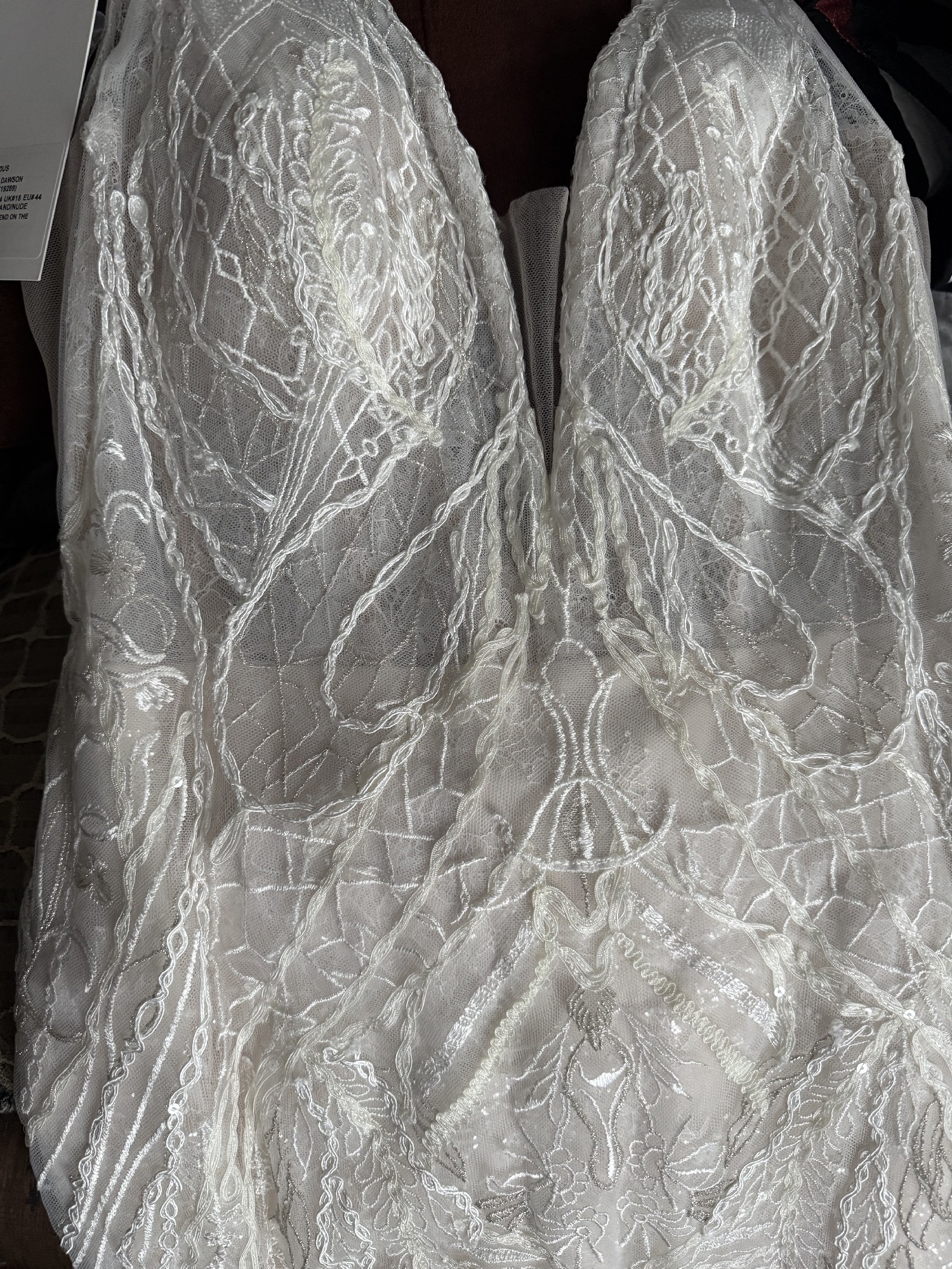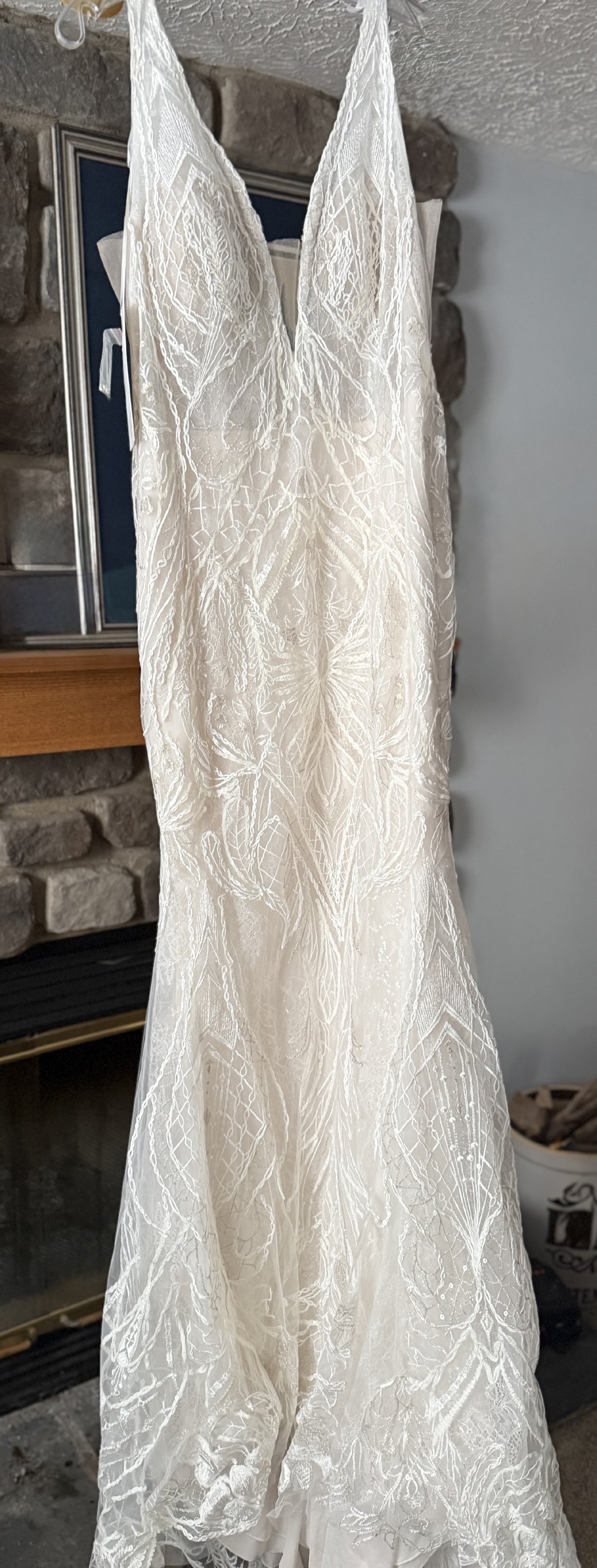 This dress was purchased new and never altered. It is light ivory or off white in color. Floor length with a long embroidered train. It has a great deal of embroidery and light catching sequins. It shimmers and sparkles with elegance.