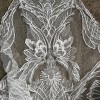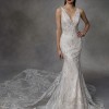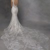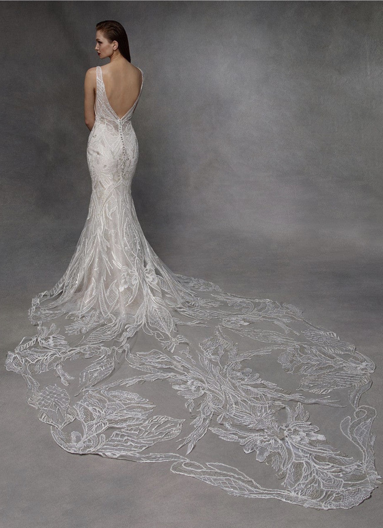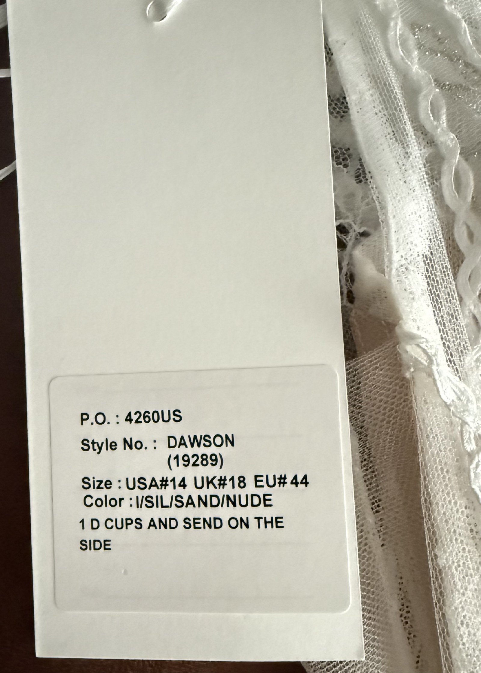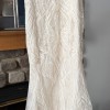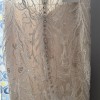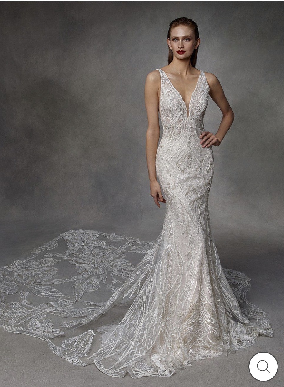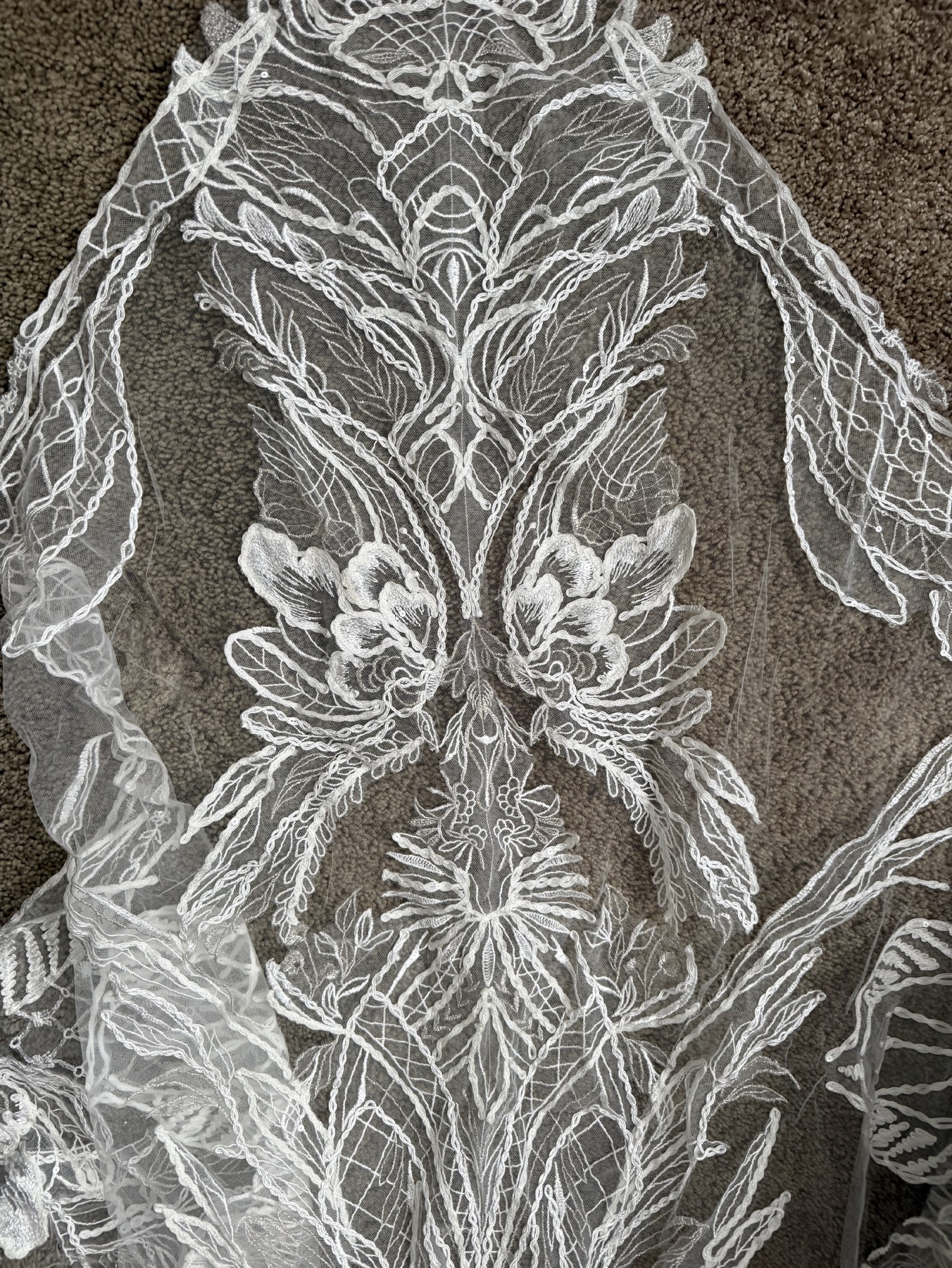 This dress was purchased new and never altered. It is light ivory or off white in color. Floor length with a long embroidered train. It has a great deal of embroidery and light catching sequins. It shimmers and sparkles with elegance.