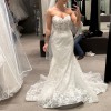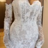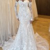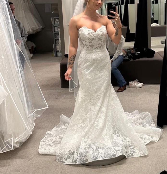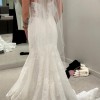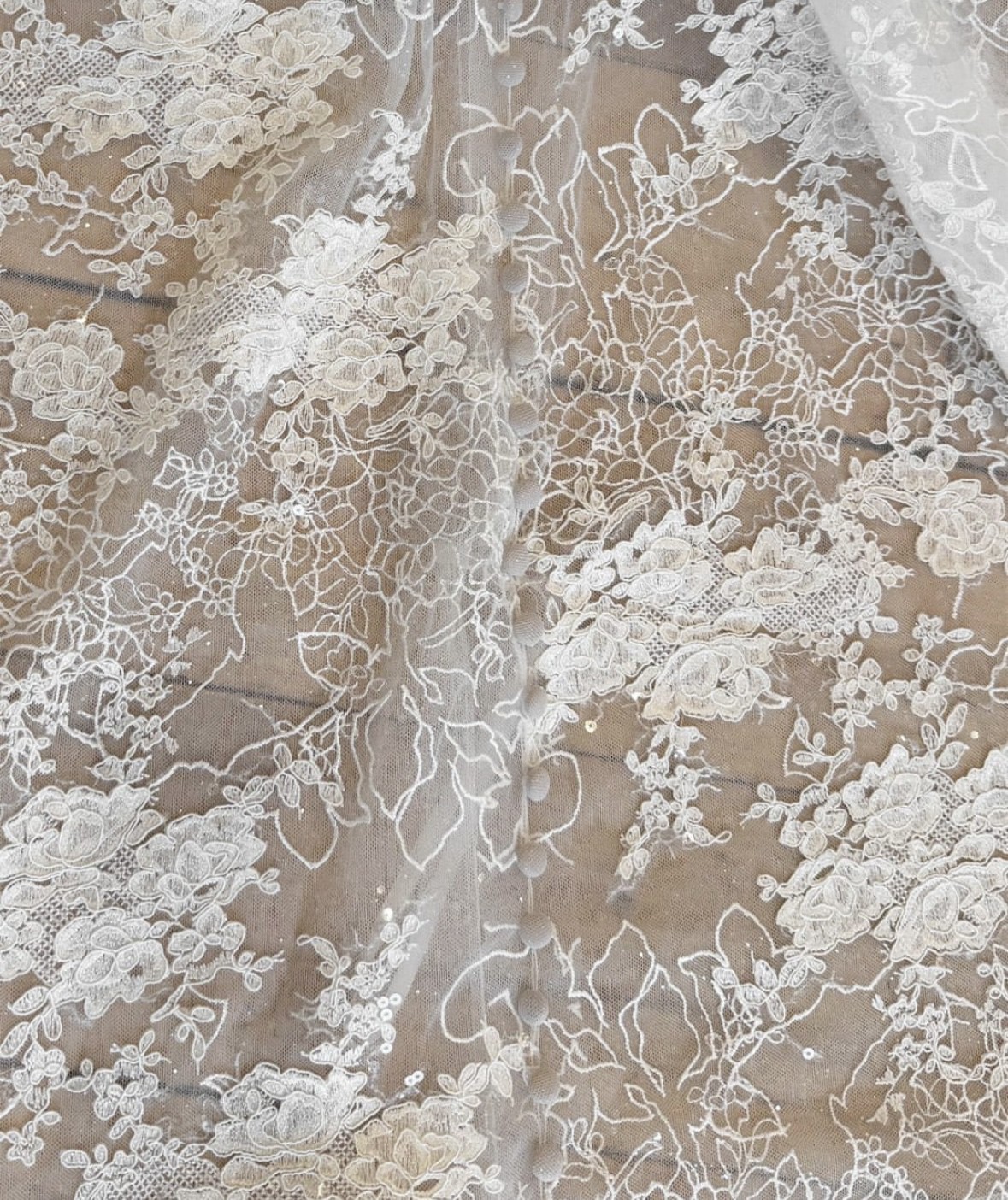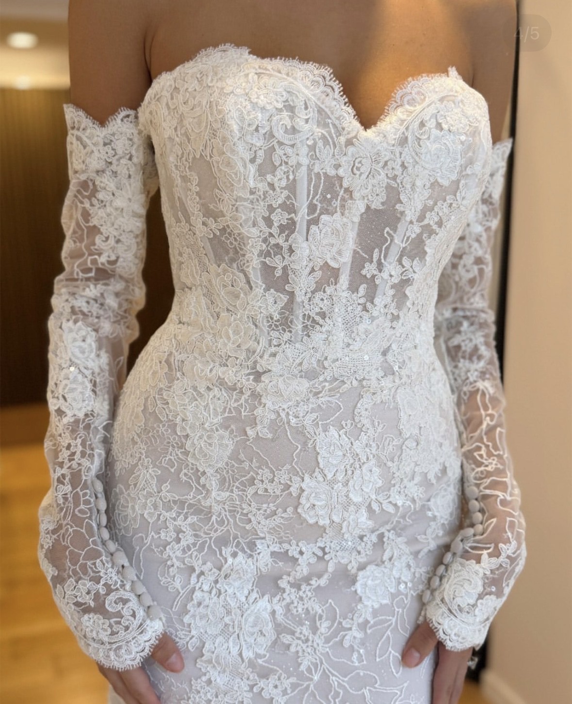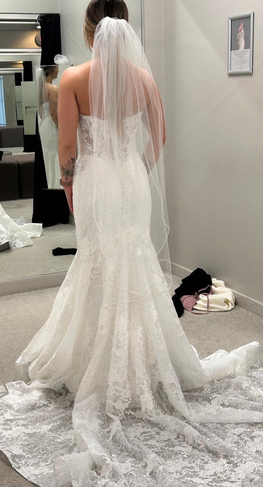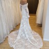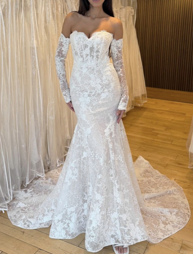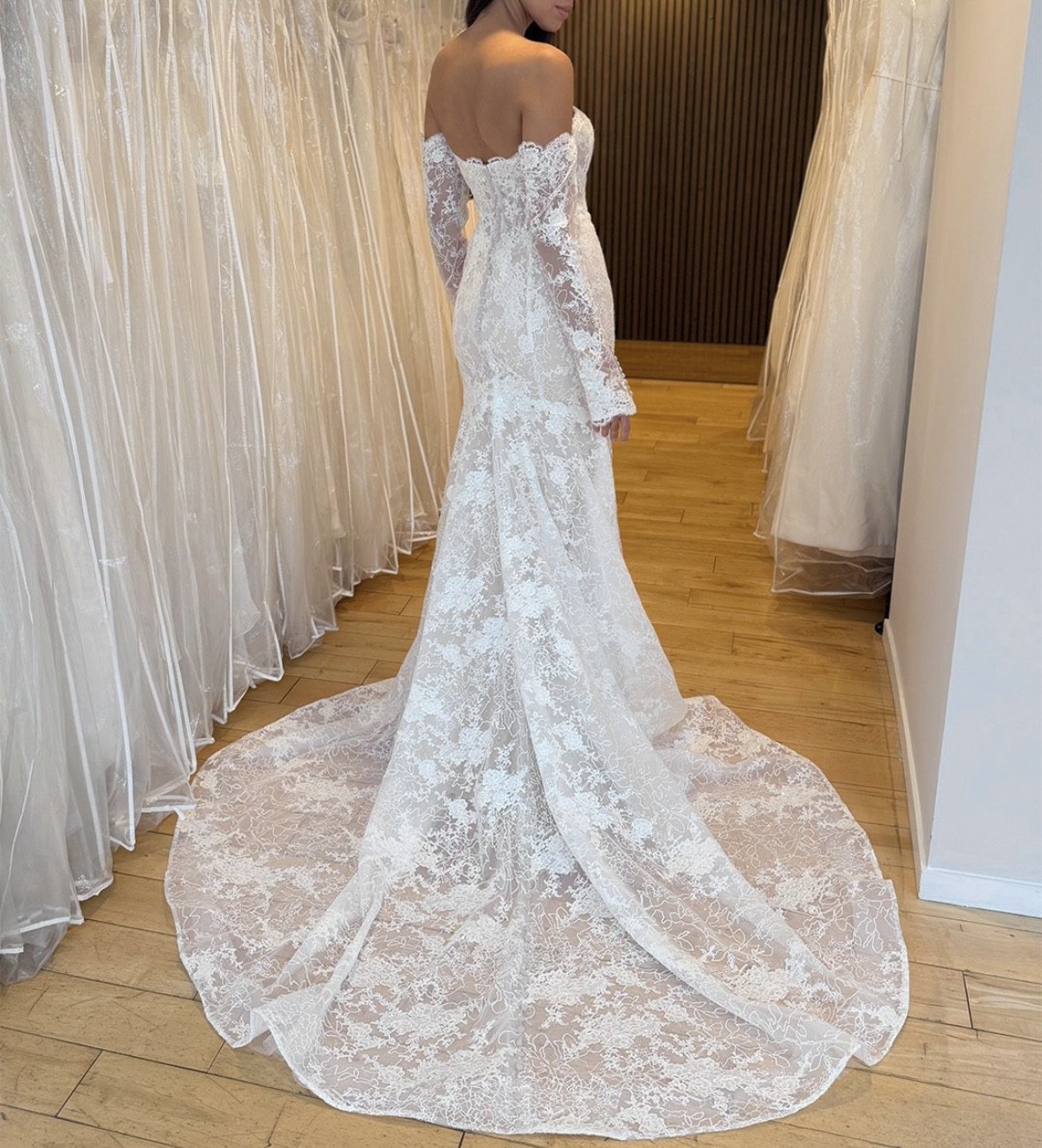 From the sculpted off-the-shoulder bodice to the delicate row of buttons and flowing chantilly lace train, this is statement bridal with a refined edge.