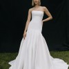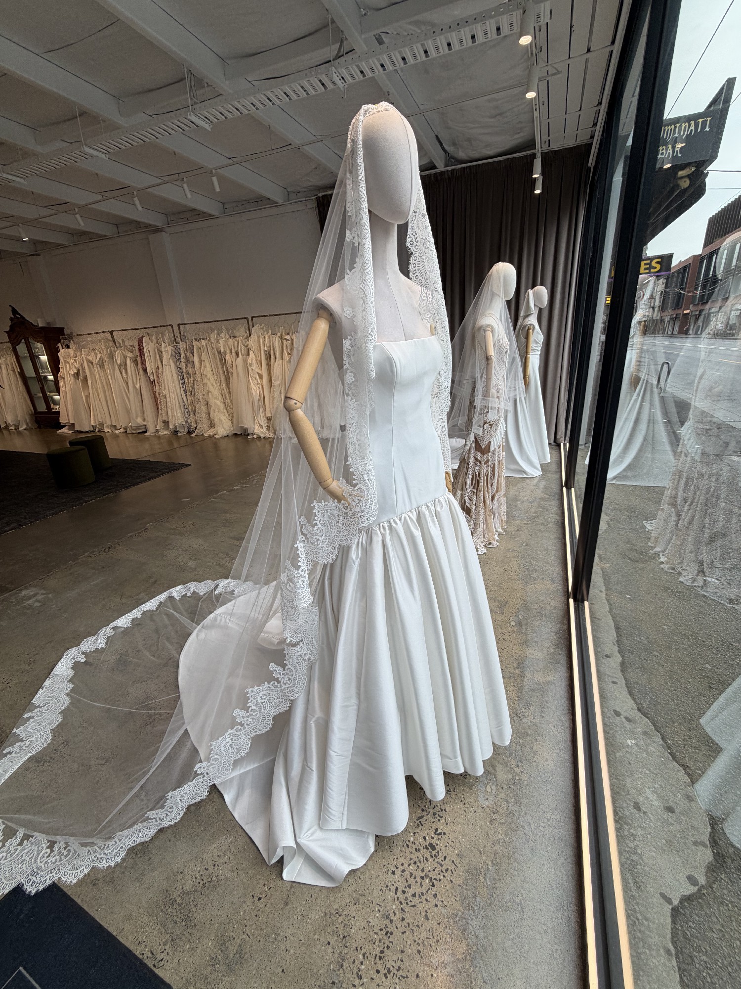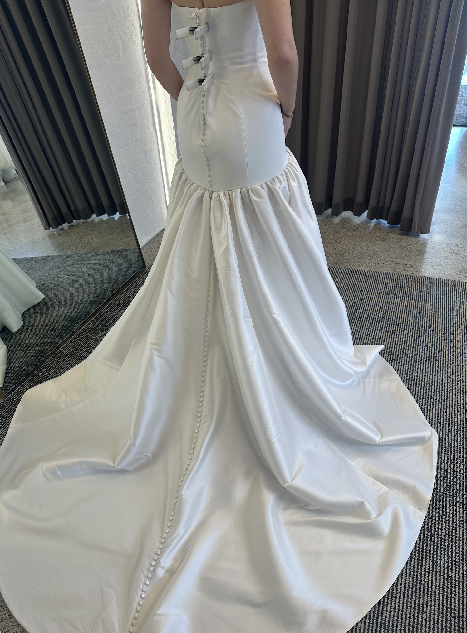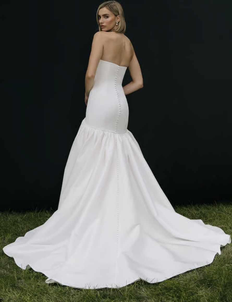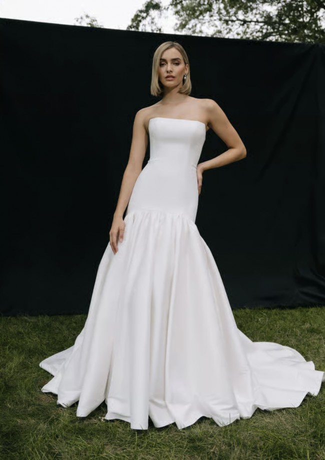 The Sienna gown takes a playful approach to proportion with a sleek crepe bodice and dramatic skirt in contrasting luxe taffeta.