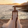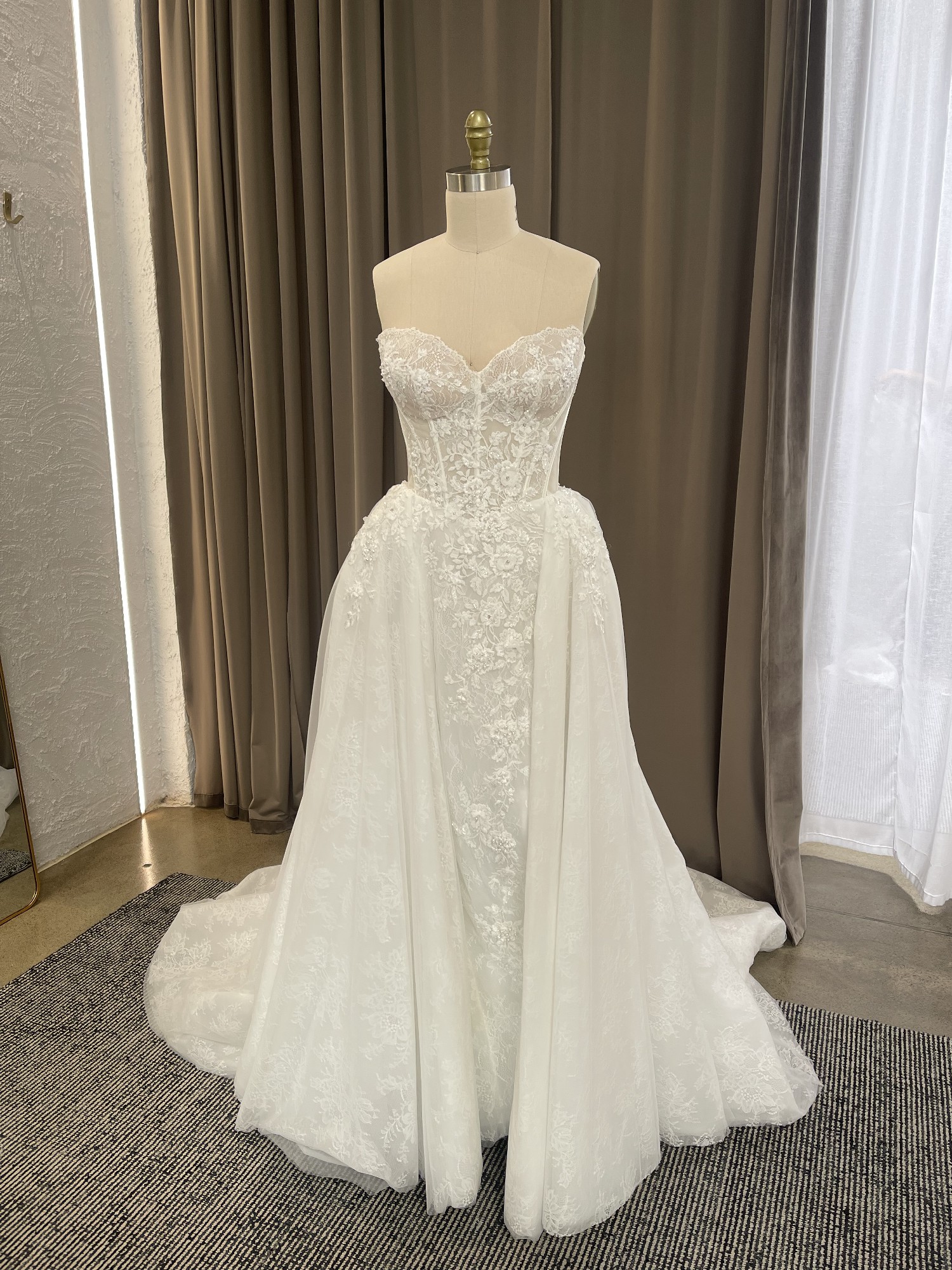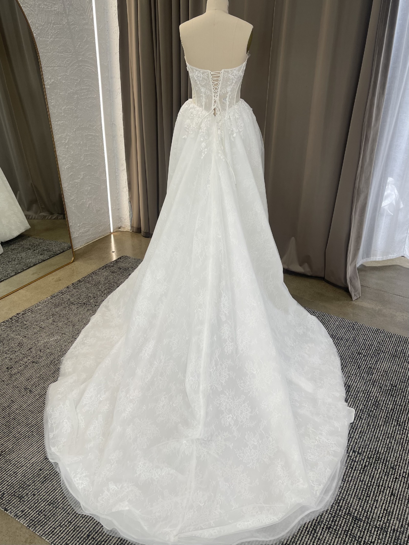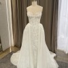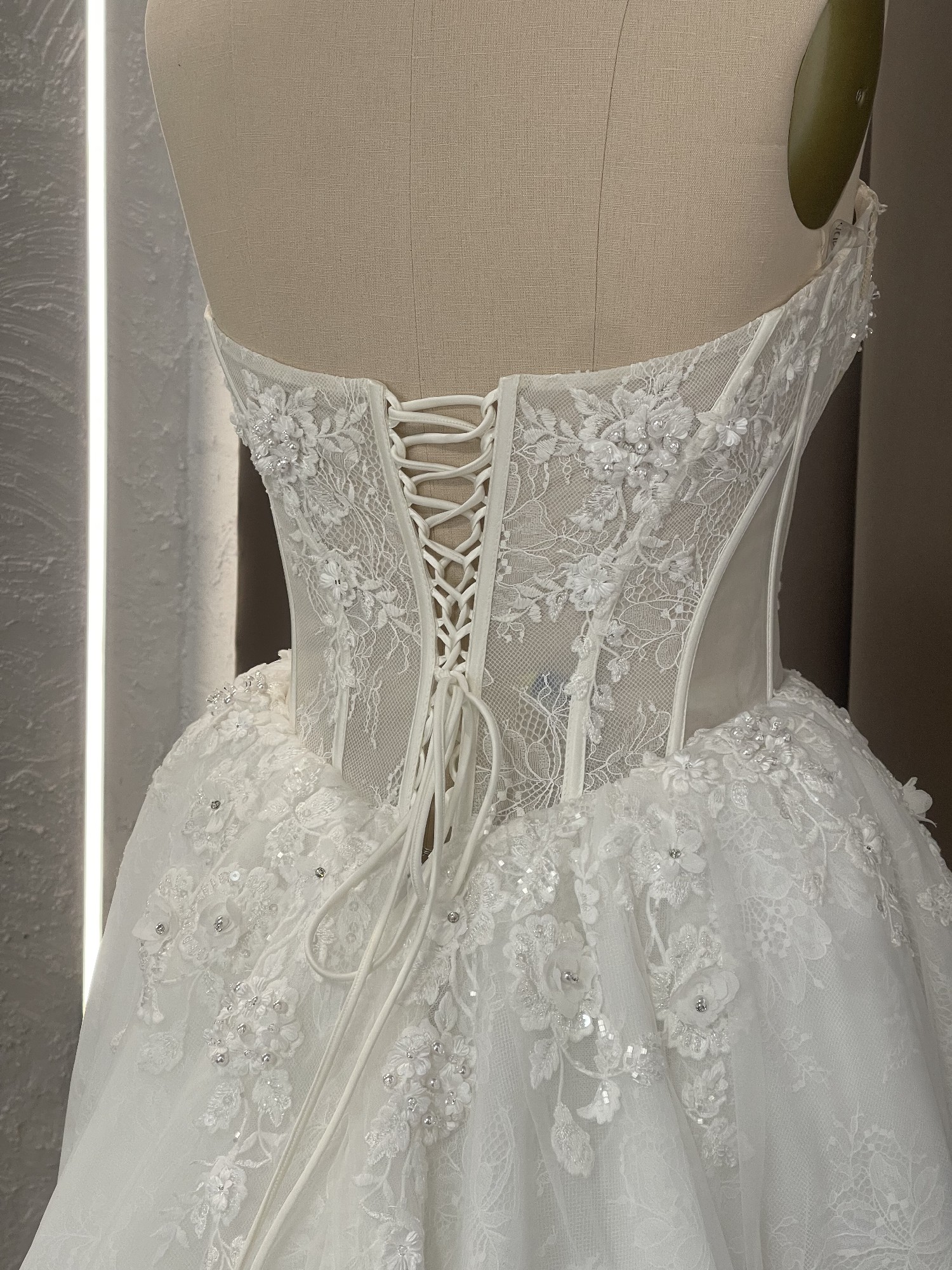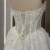 Sweetheart corset dress delicately embellished with floral ornamentation on the front, featuring a classic gown with a delicate slit on the left side. The skirt is light and voluminous, decorated with embroidered floral motifs.