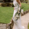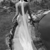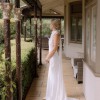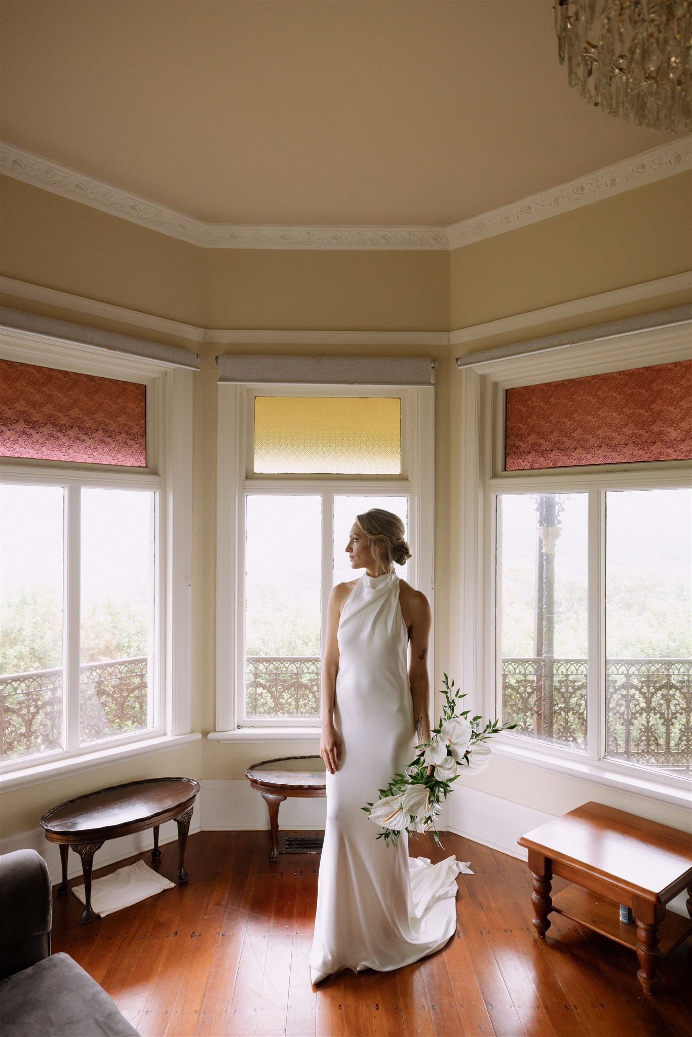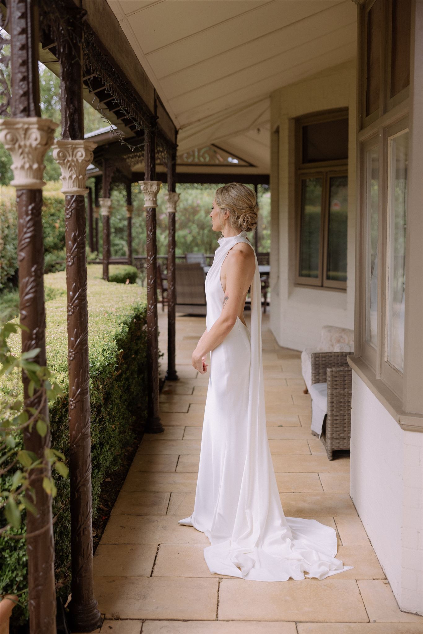 FASTENING: Centre back zip, hook and bar at back of neck to secure halter neck of gown.