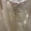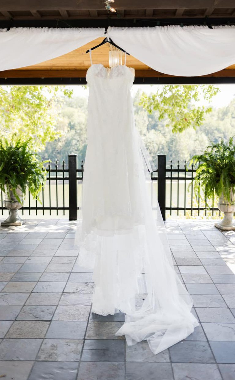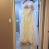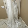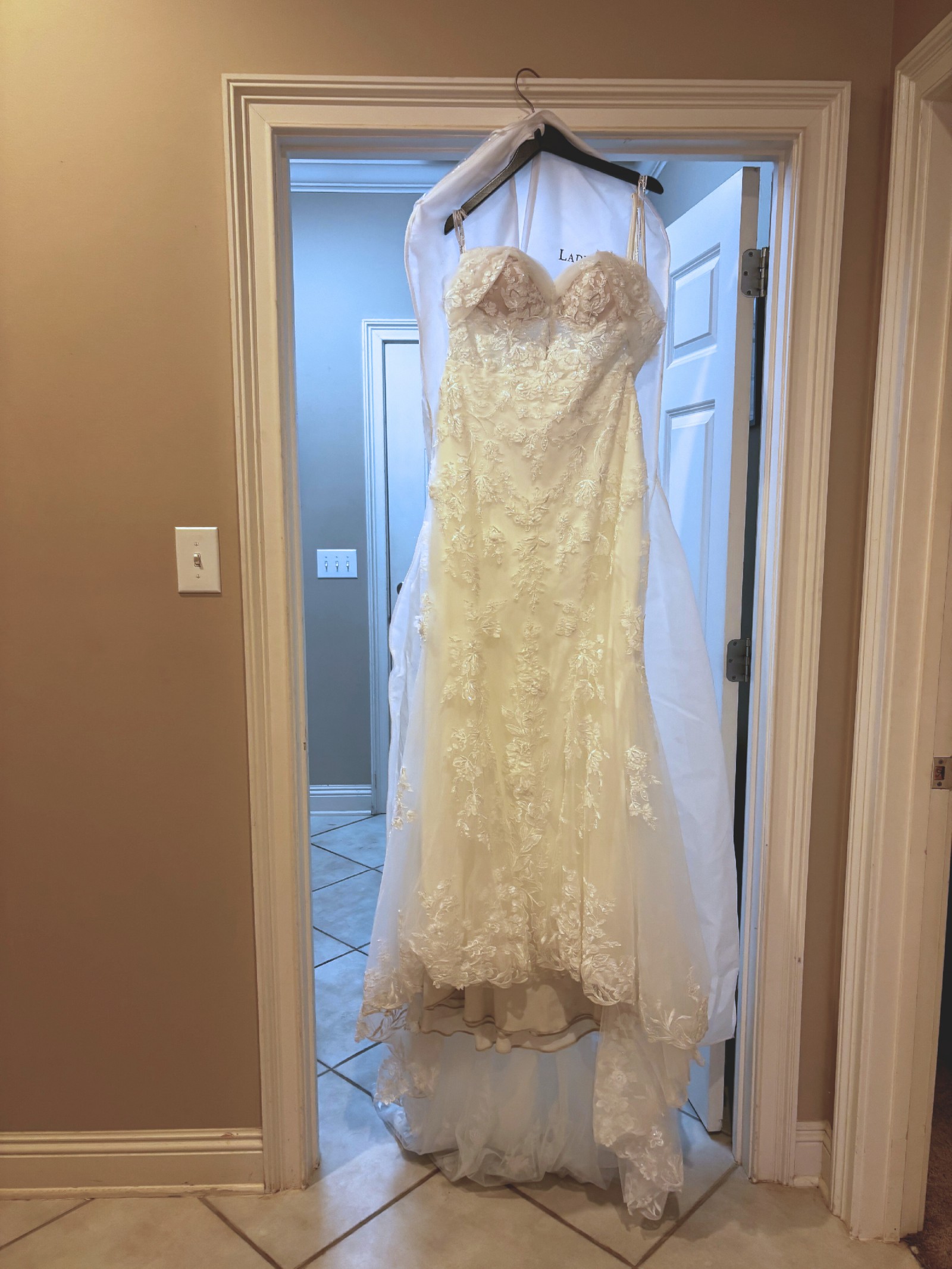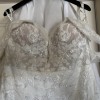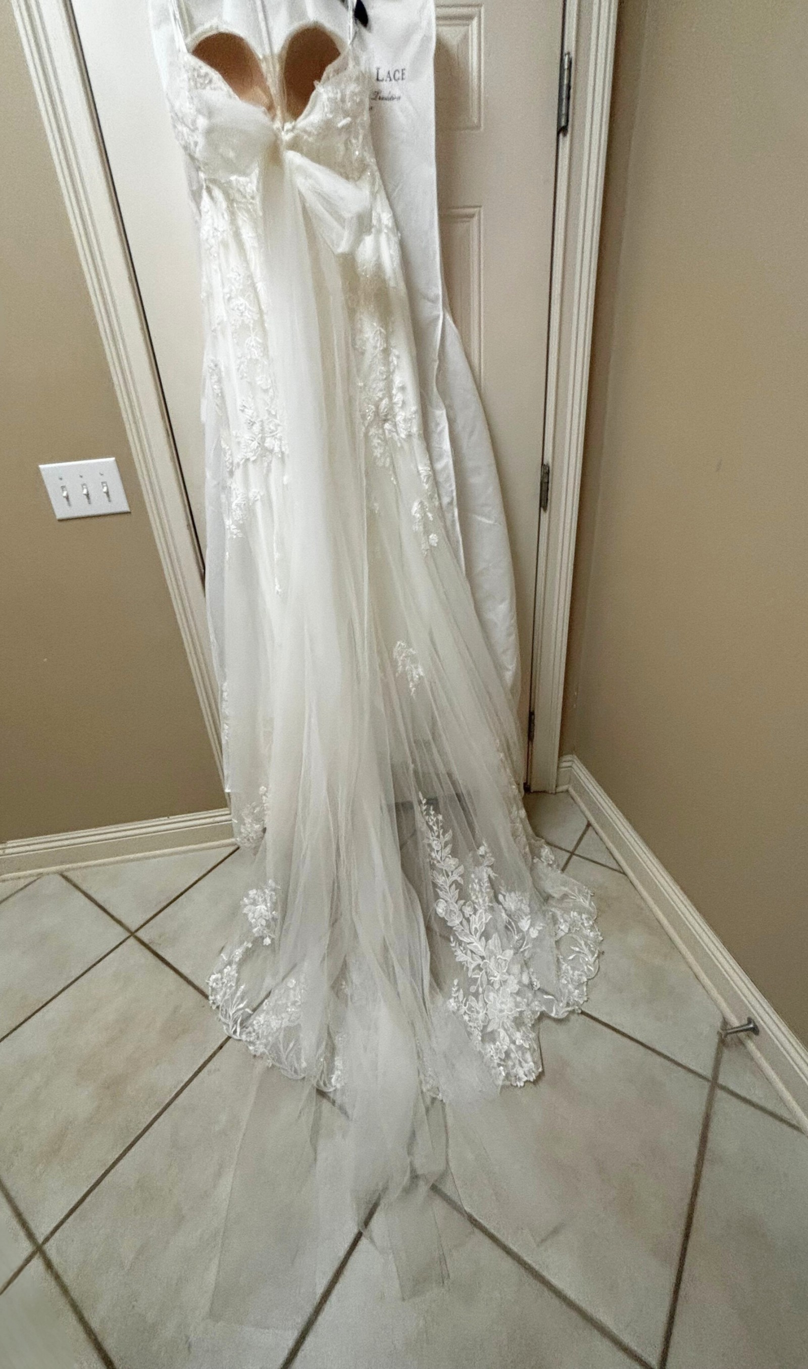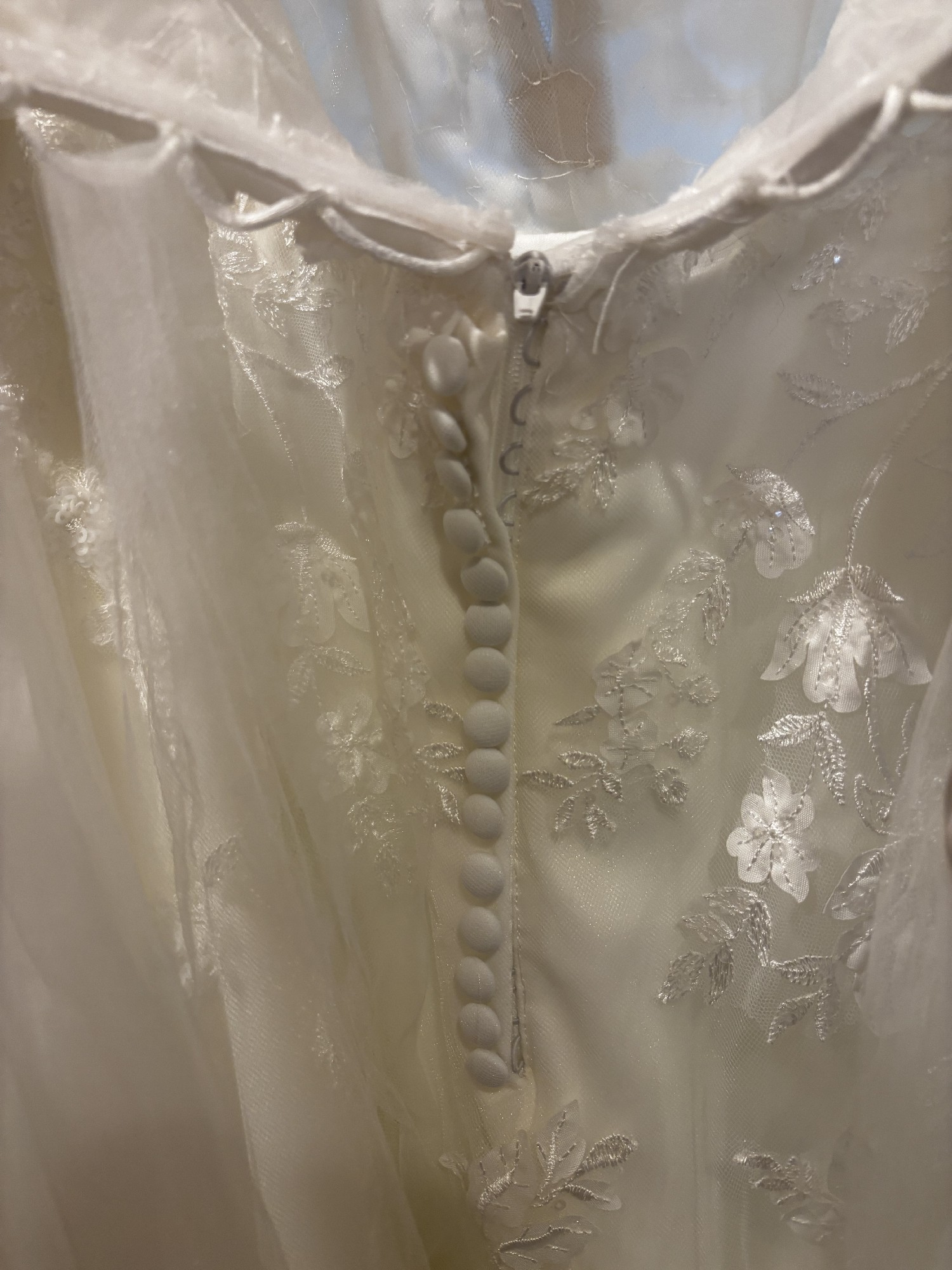 The dress has detachable sleeves that provide versatility for both the ceremony and reception. Zips half way up the back, then the rest of the way is that tulle bow that laces up like a corset. It is a Size 14 and floor length.