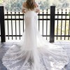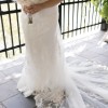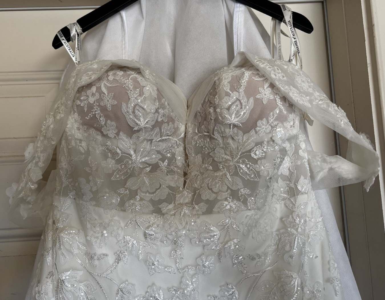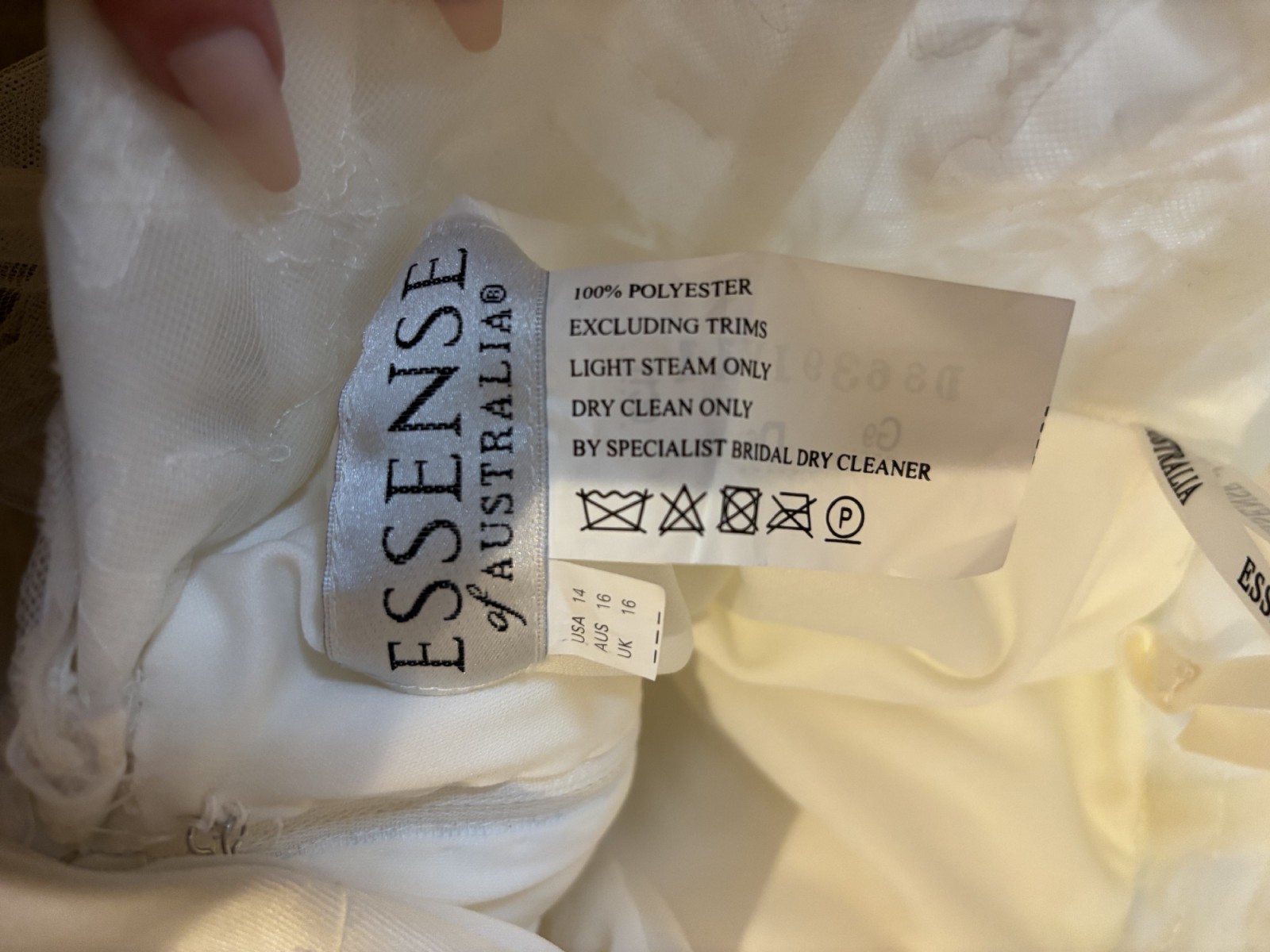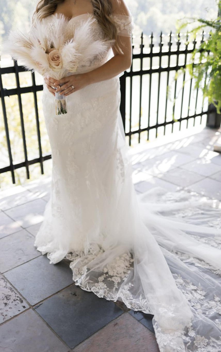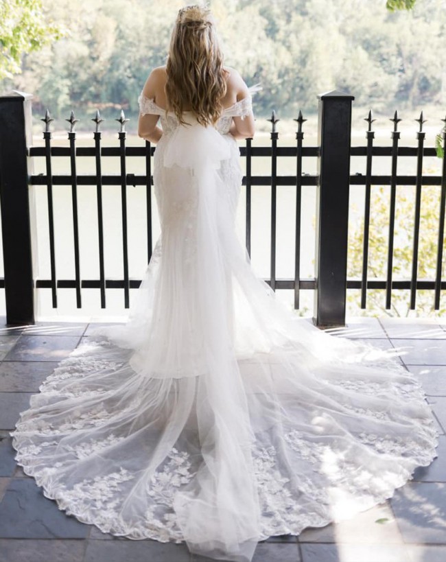 This is an Essense of Australia wedding dress that has an off-the-shoulder design, mermaid silhouette, and a lace train. The ivory lace fabric is adorned with intricate 3D flowers, delicate beading, and lovely embroidery. There is a tulle bow on the back that takes the place of a veil if you wanted it to.