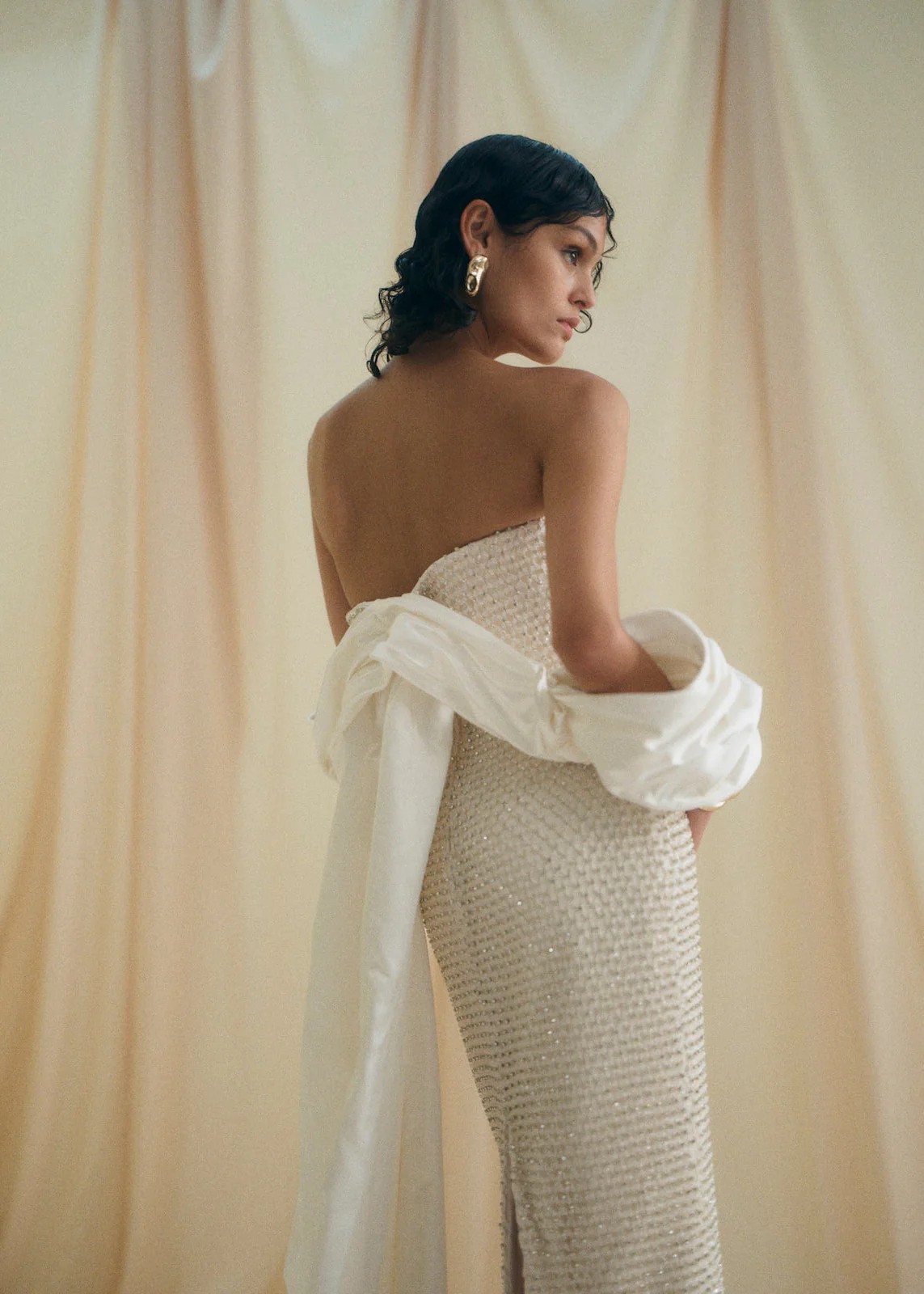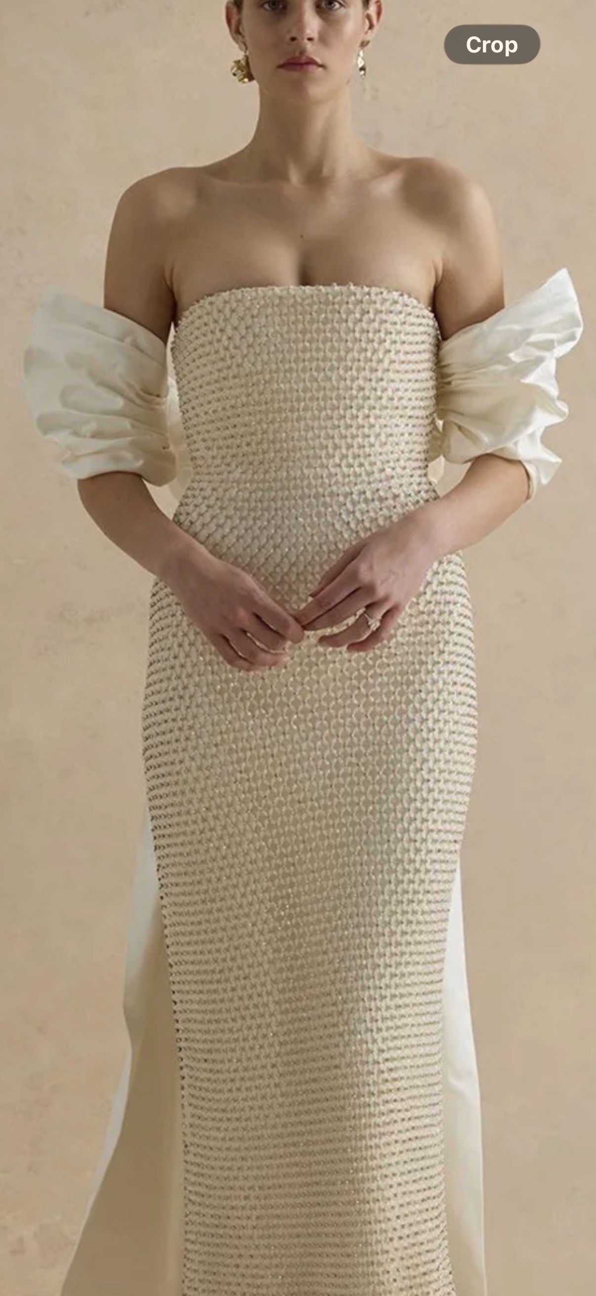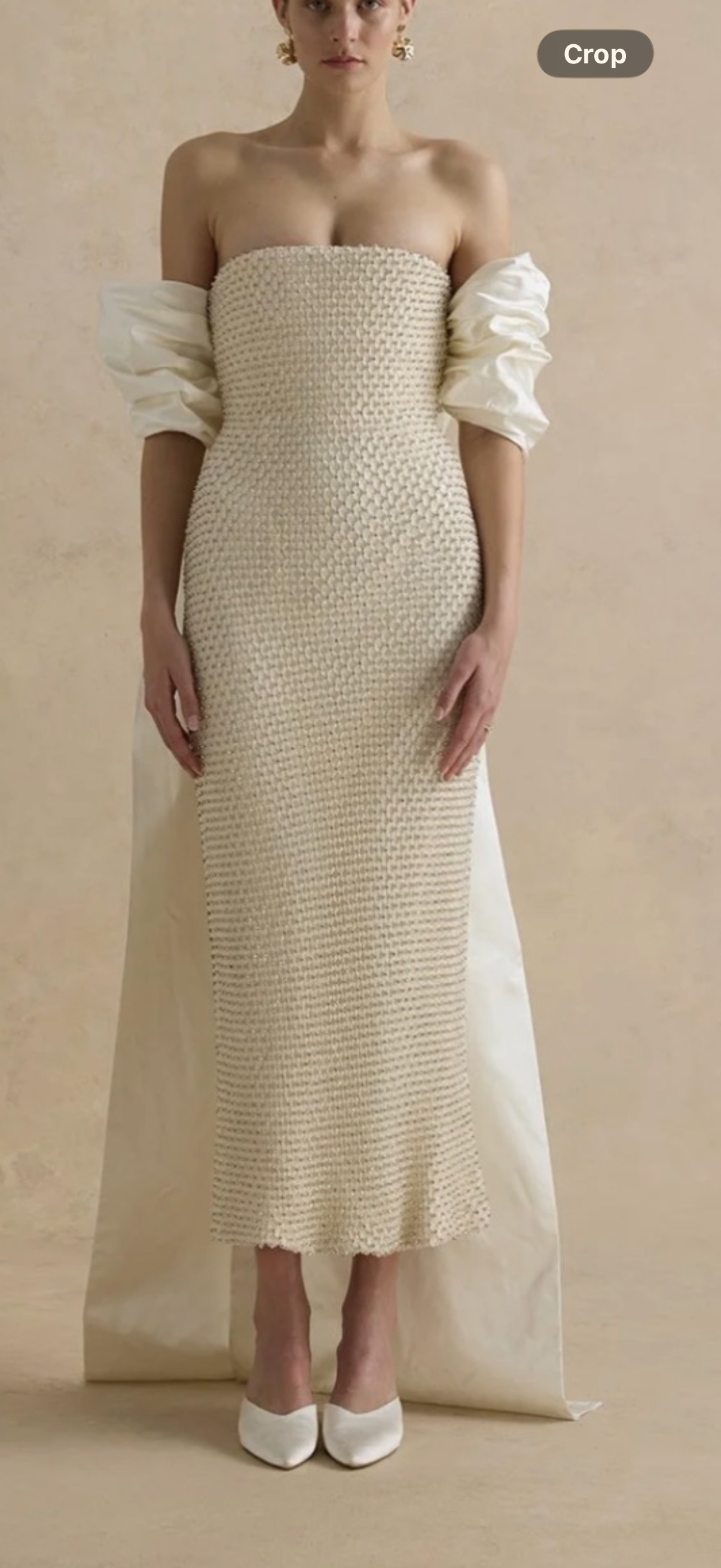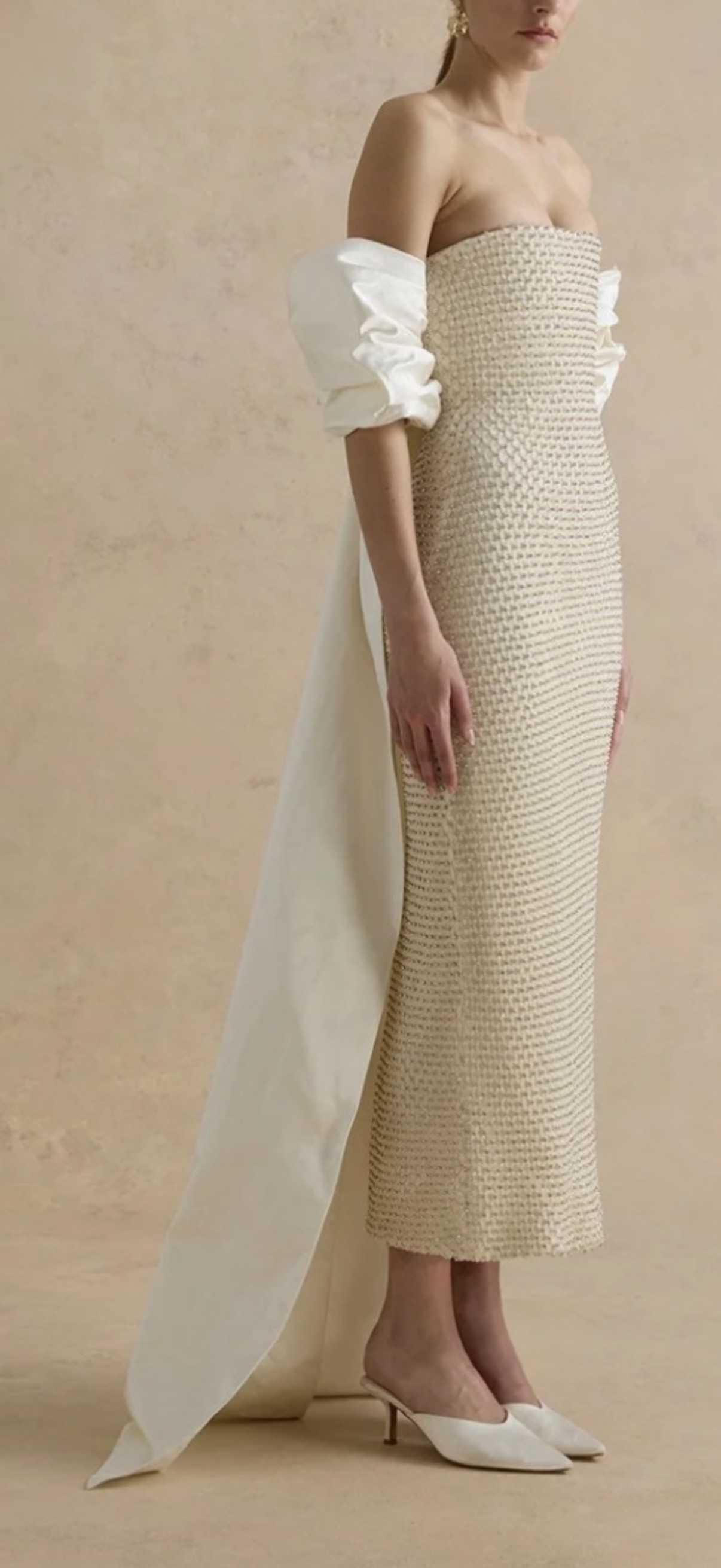 This is a one-off piece originally designed by Prea James, used only as a styling piece for their Studio Collection (Valentine dress featured). I asked for the piece to wear to my hens though it has never been worn. They sold me a sample shawl that was fully dry cleaned for $1300 even though they told me at the time if they produced it for retail it would be valued at $2635.